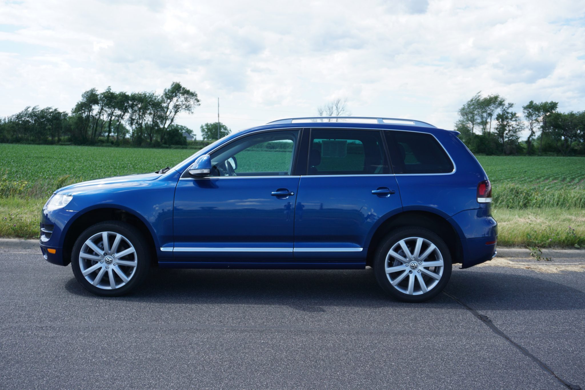 The interior features Anthracite Grey upholstery with Topaz white inserts. The Biscay blue is the only exterior color that got the turned metal trim on the interior, according to the seller. It is optioned with navigation, a back-up camera, Dynaudio, keyless access and start, xenon headlights, and tow hitch.