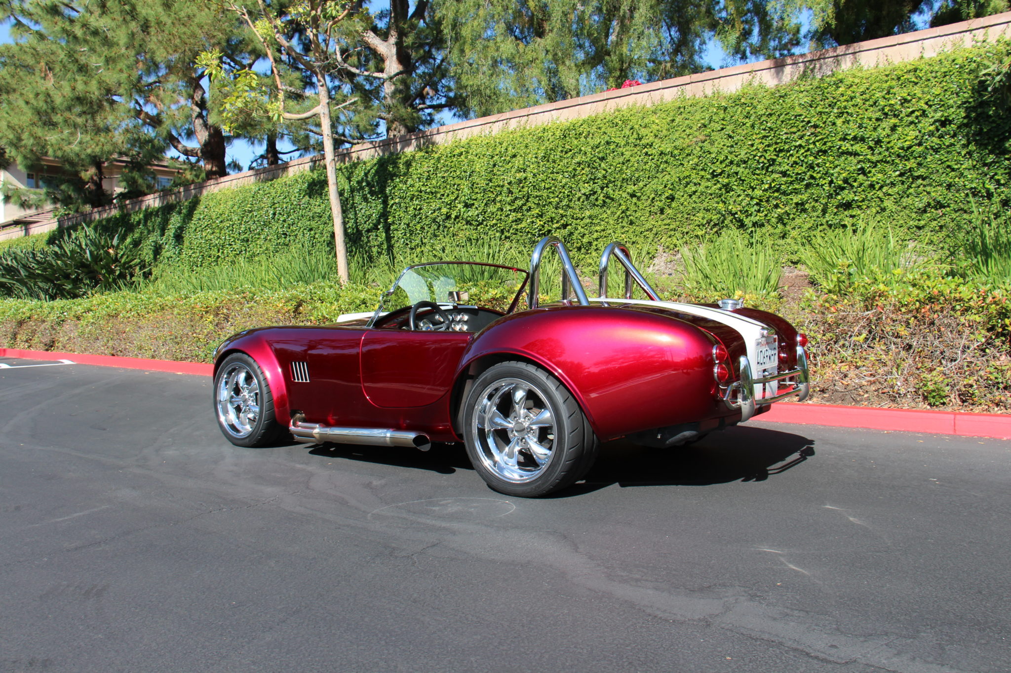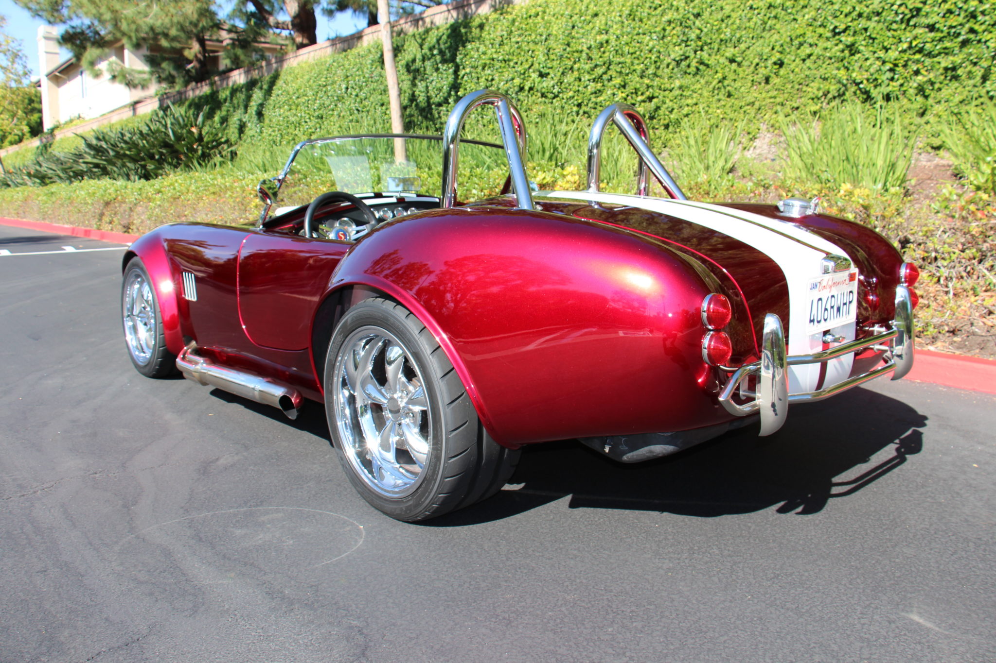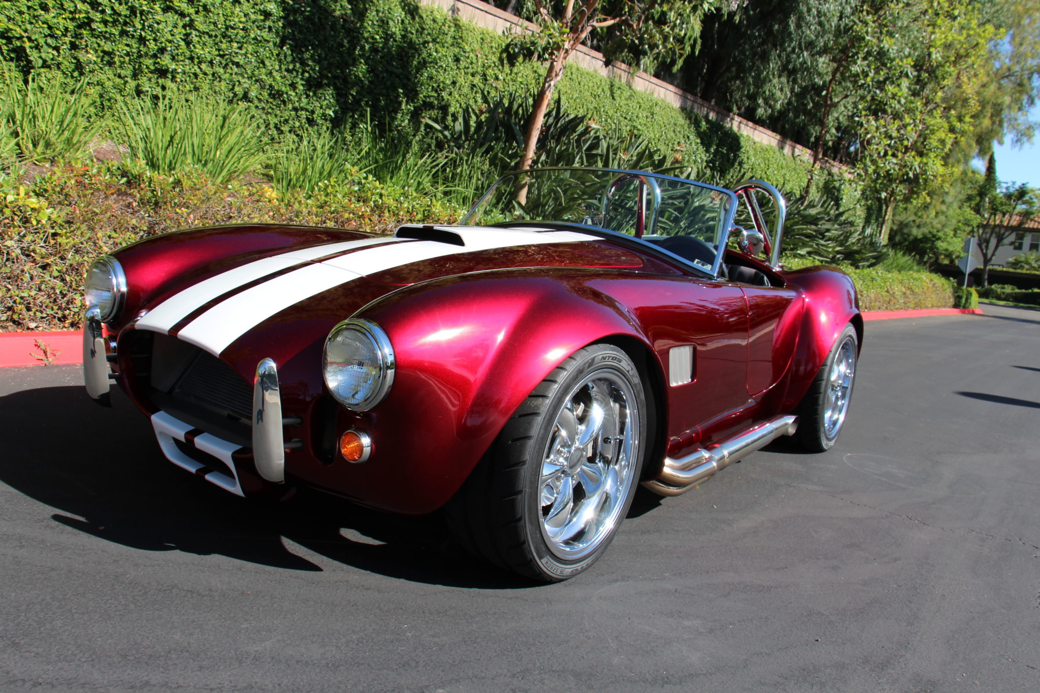 Five-spoke 18″ wheels with a chrome finish wear staggered-width Nitto NT05 tires that were mounted in 2019. The chassis features narrowed front and rear tracks to accommodate the wheel setup, along with a Factory Five three-link rear suspension, Koni shock absorbers, and four-wheel disc brakes. The battery is mounted in the trunk with an integrated tender.