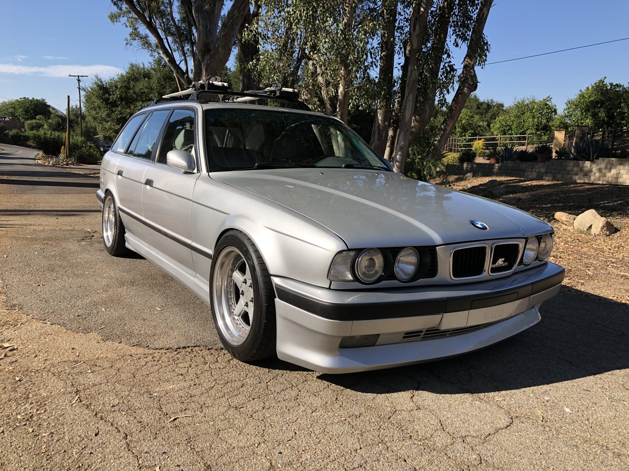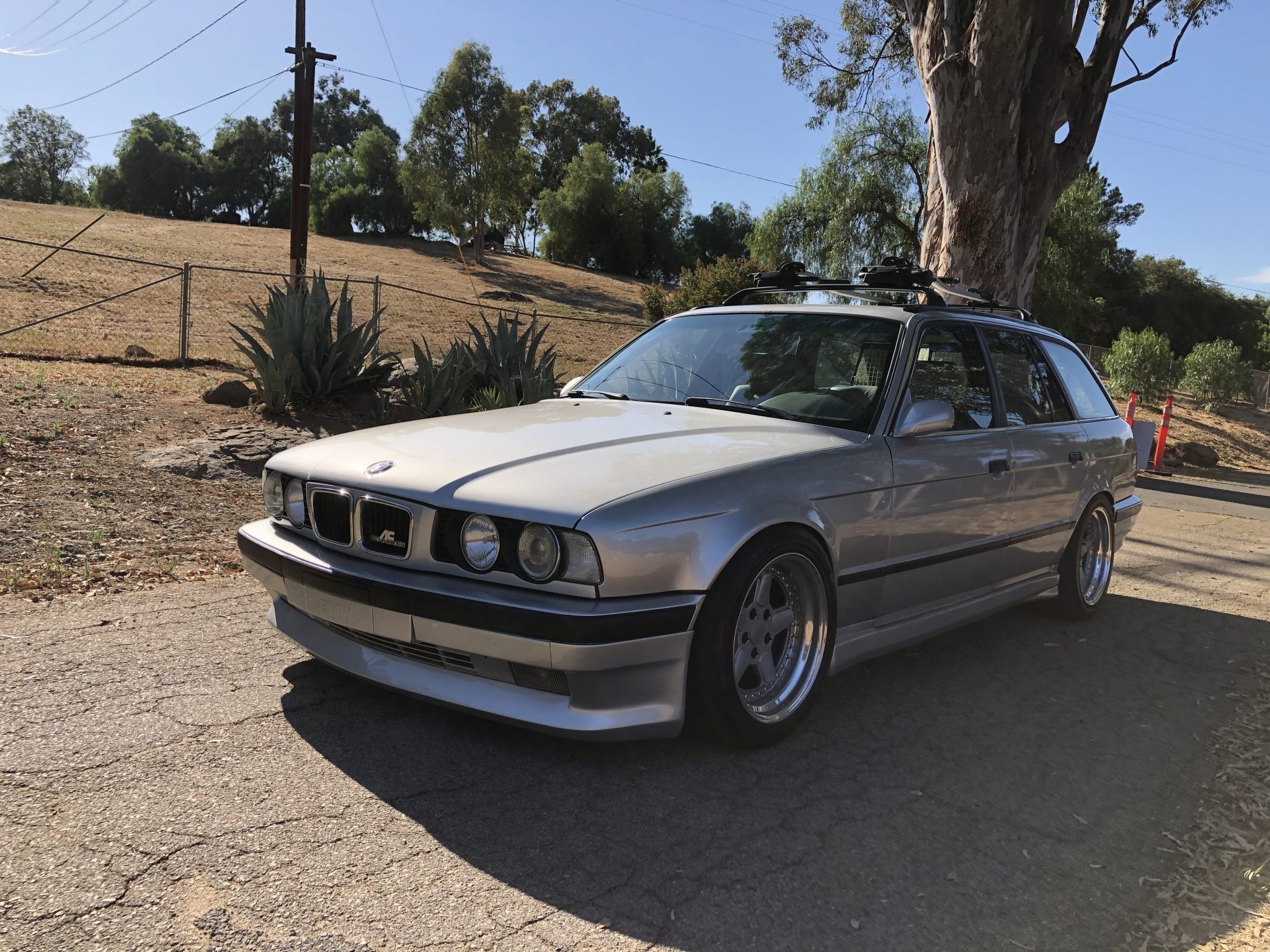 Three-piece 17″ AC Schnitzer Type I wheels were reportedly rebuilt with custom barrels, and 245/45 front and 275/40 rear Nitto NT555 tires were recently mounted. A 17″ M System spare wheel and tire is also included and stored in the cargo area. The braking system was modified with an Angry Ass Solutions F30 big brake kit with cross-drilled 340mm front rotors paired with four-piston Brembo calipers up front. The suspension has been overhauled with CAtuned coilovers and camber plates, AKG Motorsport bump-steer correction plates, Energy Suspension subframe bushings, and replacement differential bushings, control arms, tie rods, and thrust arms.