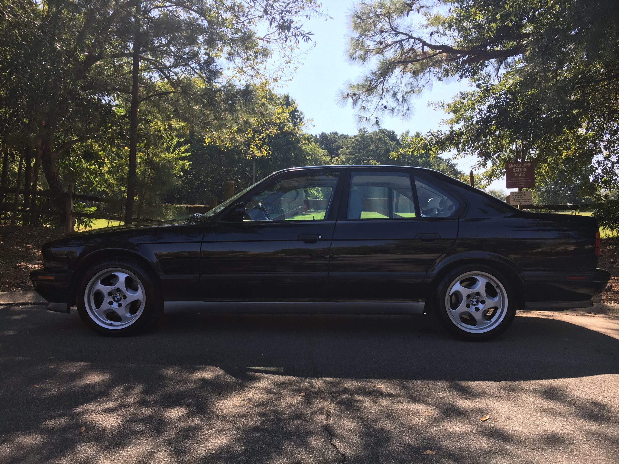 The 17″ M System II wheels feature “throwing star” covers and wear 235/45 Michelin Pilot Super Sport tires. The self-leveling suspension has been removed, and the seller states that the front shocks were replaced in 2014. Replacement power steering hoses, front brake pads, and front rotors were reportedly installed in 2015.