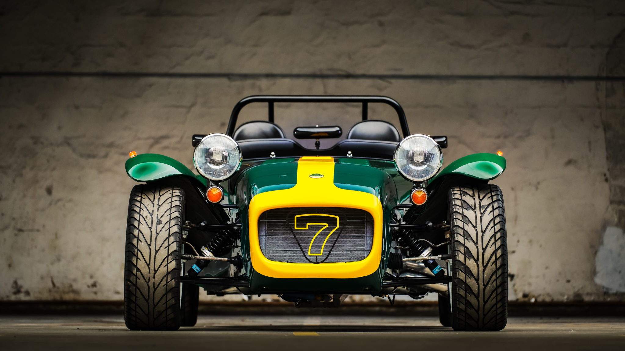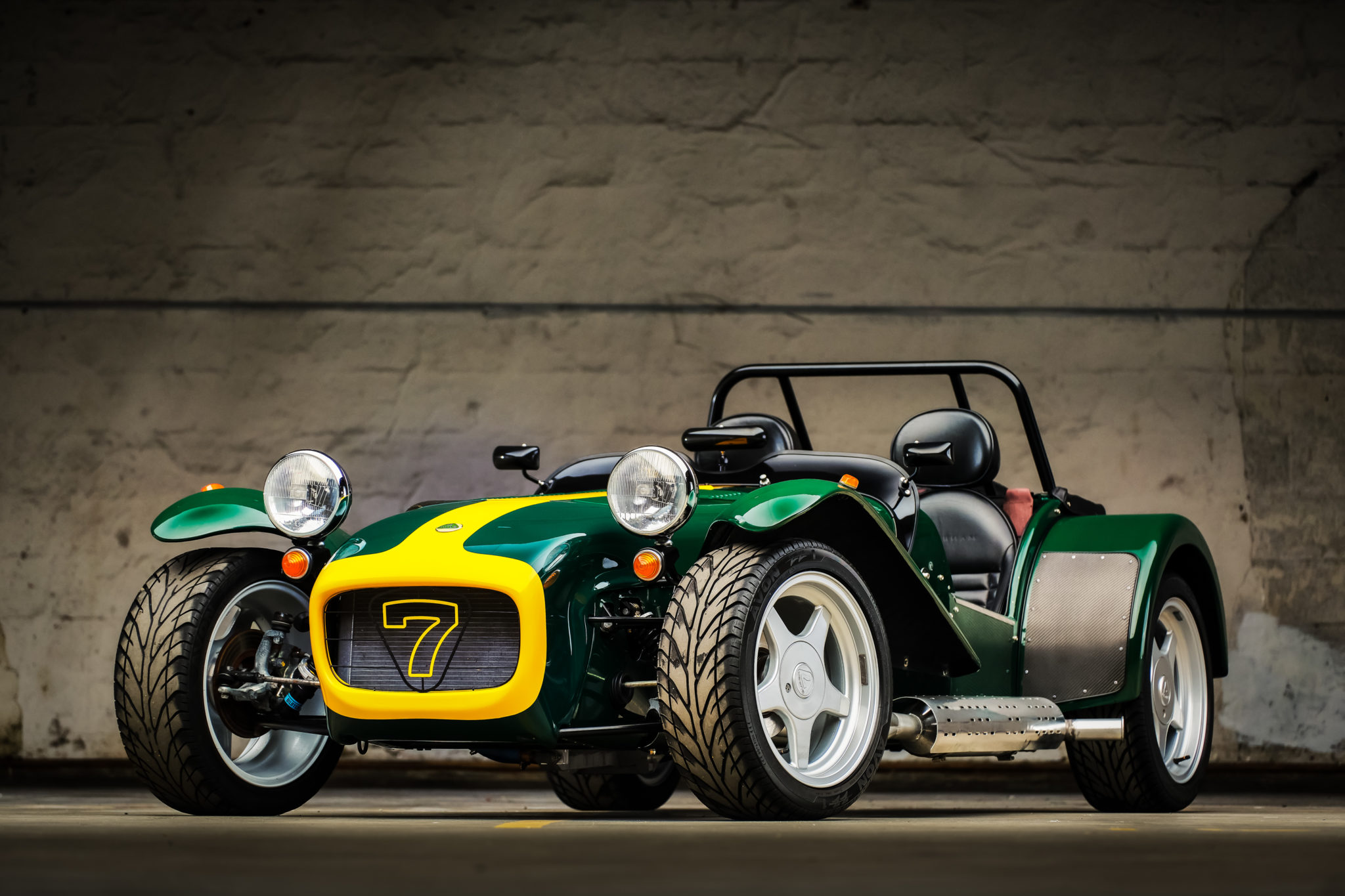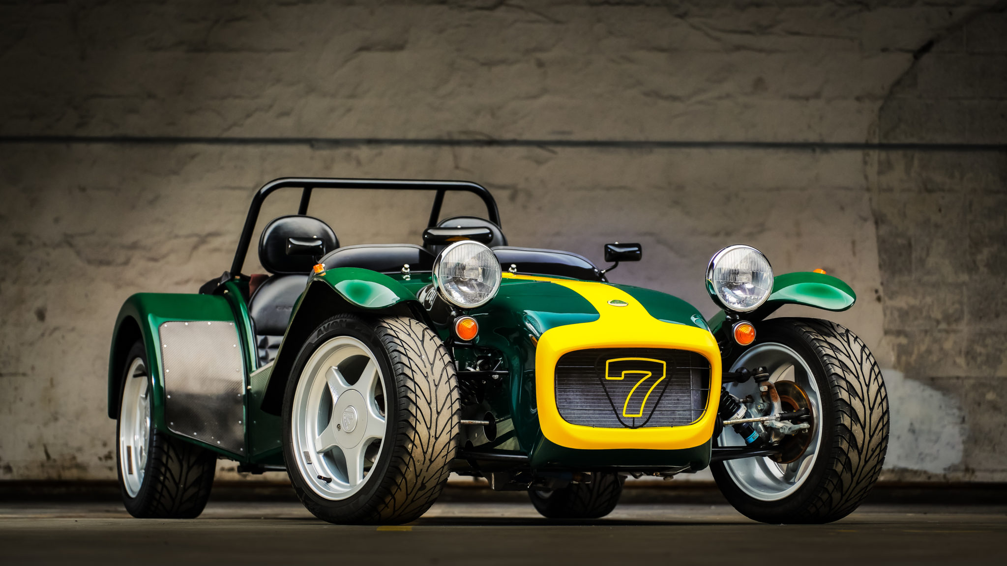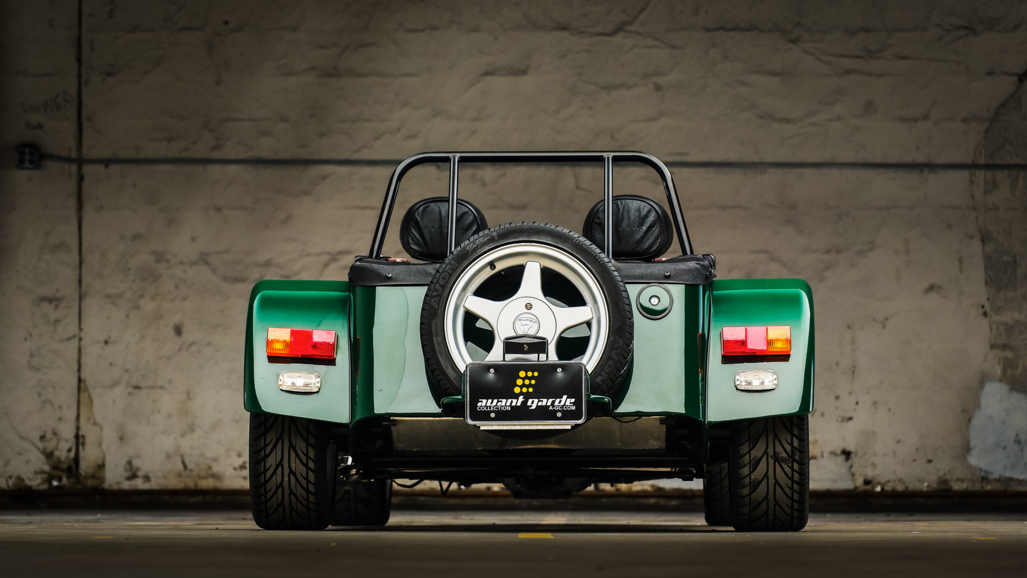 16″ Super Seven wheels wear Avon ZZ1 tires measuring 205/45 and are accompanied by a rear-mounted spare. The car features four-wheel disc brakes and independent front suspension with Bilstein shocks and adjustable spring perches.