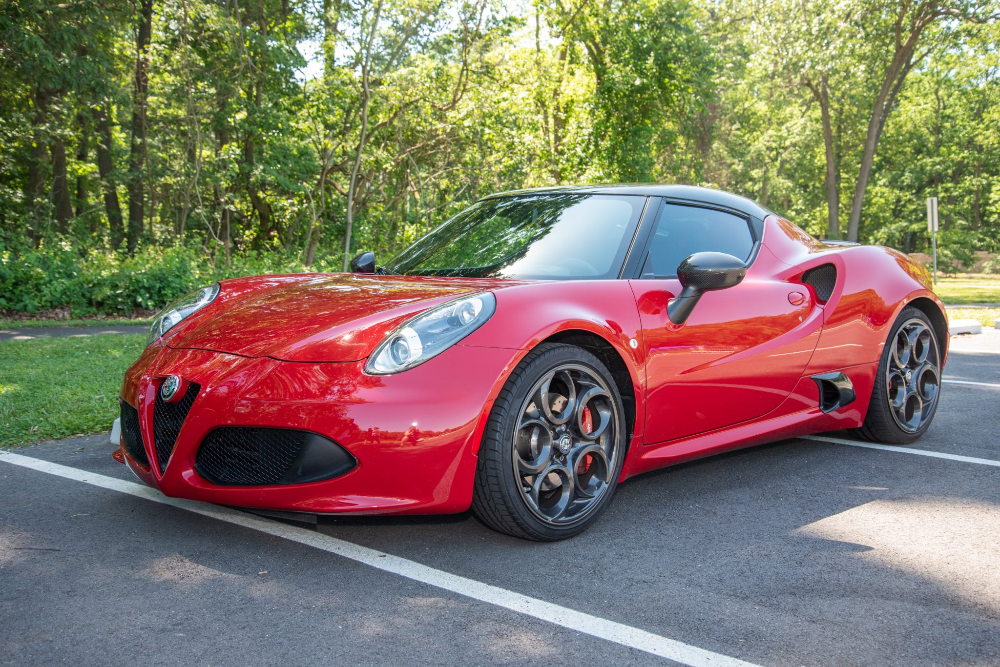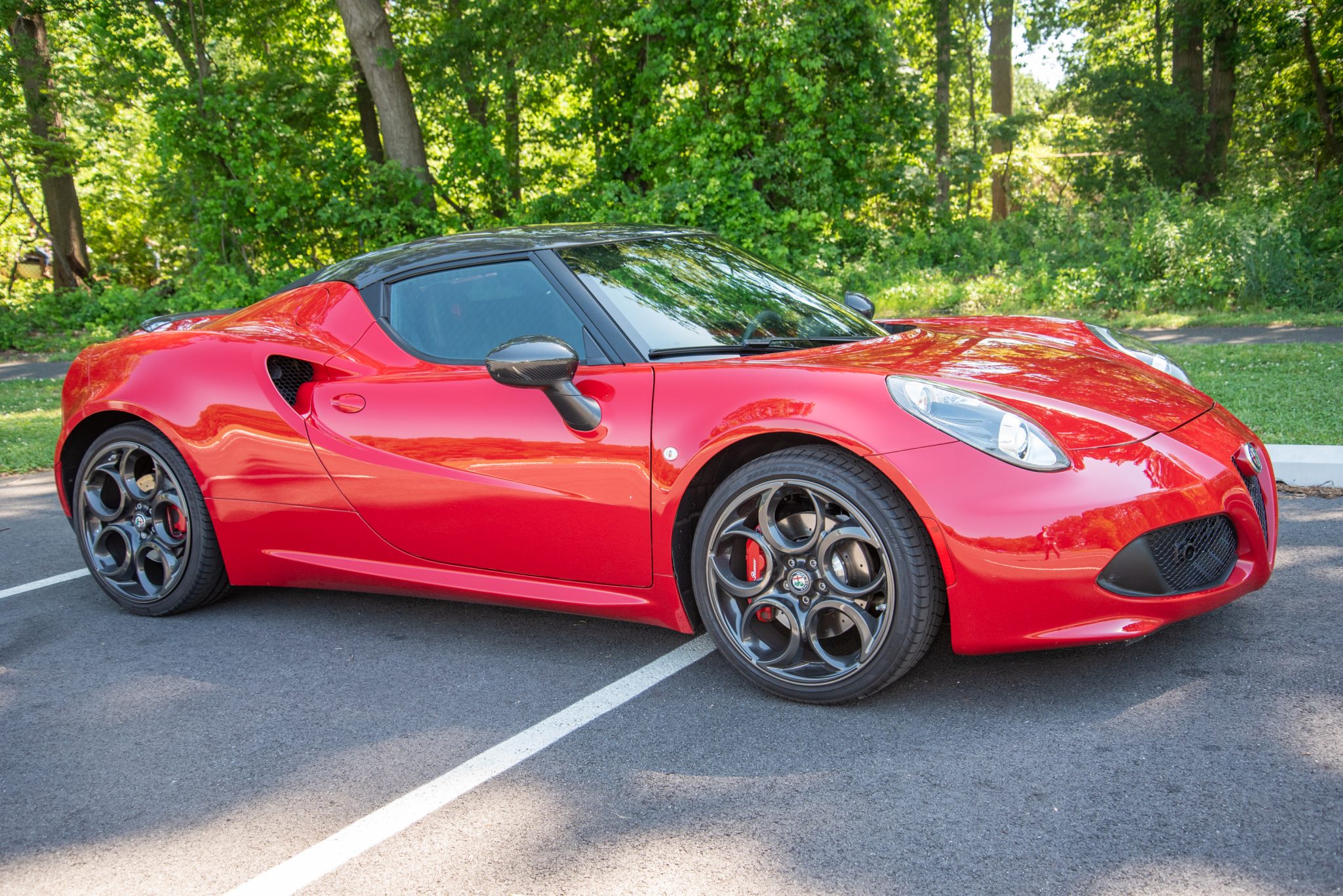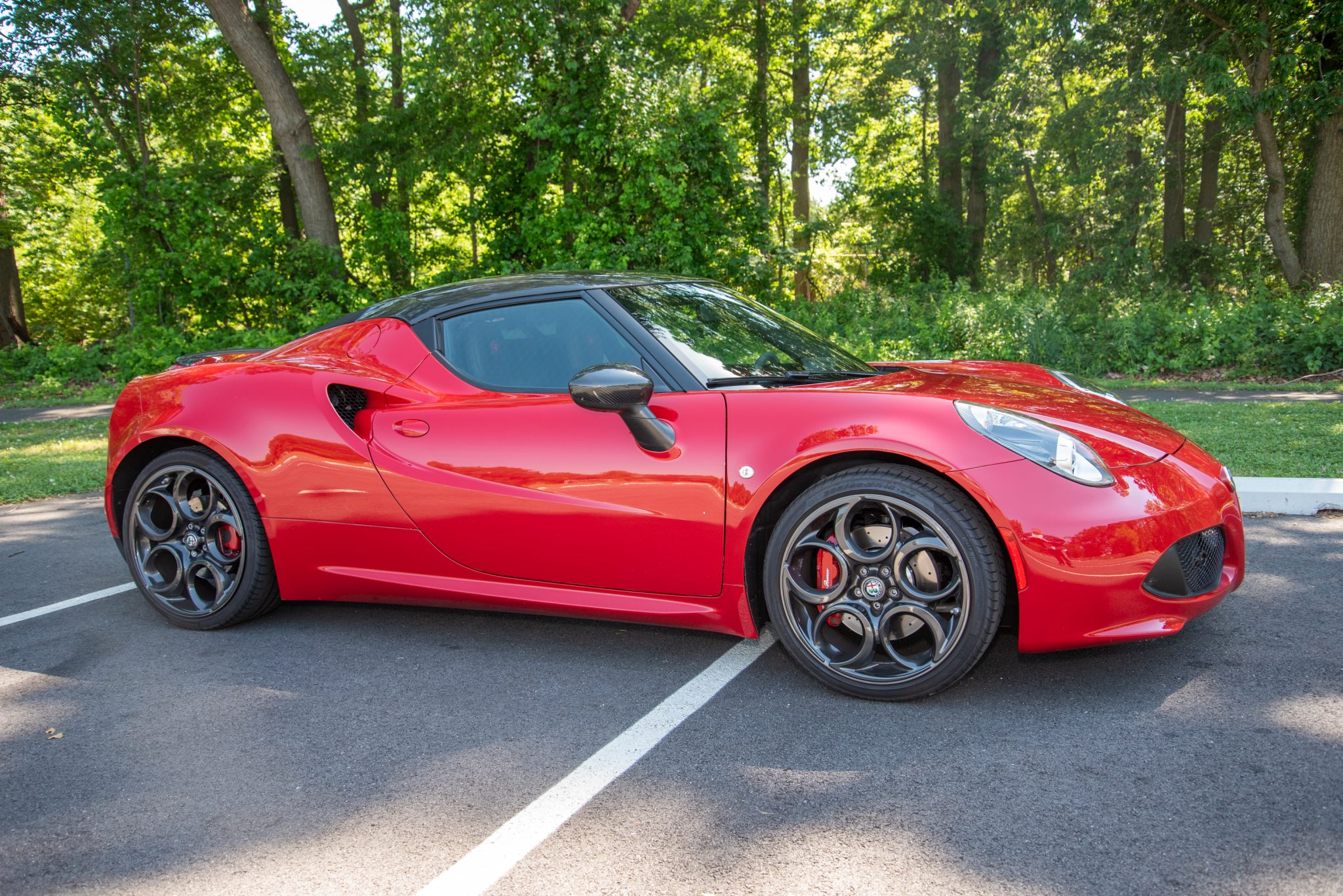 Optional dark five-hole 18″ front and 19″ rear wheels are wrapped in 205/40 and 235/35 Pirelli P Zero tires. This example is equipped with the Coupe Track Package 1 option, which added a carbon fiber rear spoiler and race-tuned suspension. Red Brembo brake calipers are fitted at all four corners.
