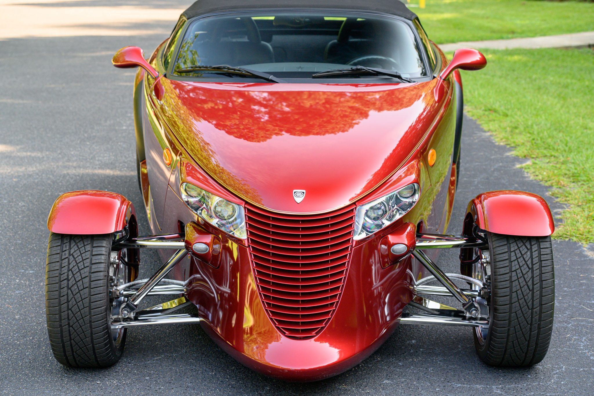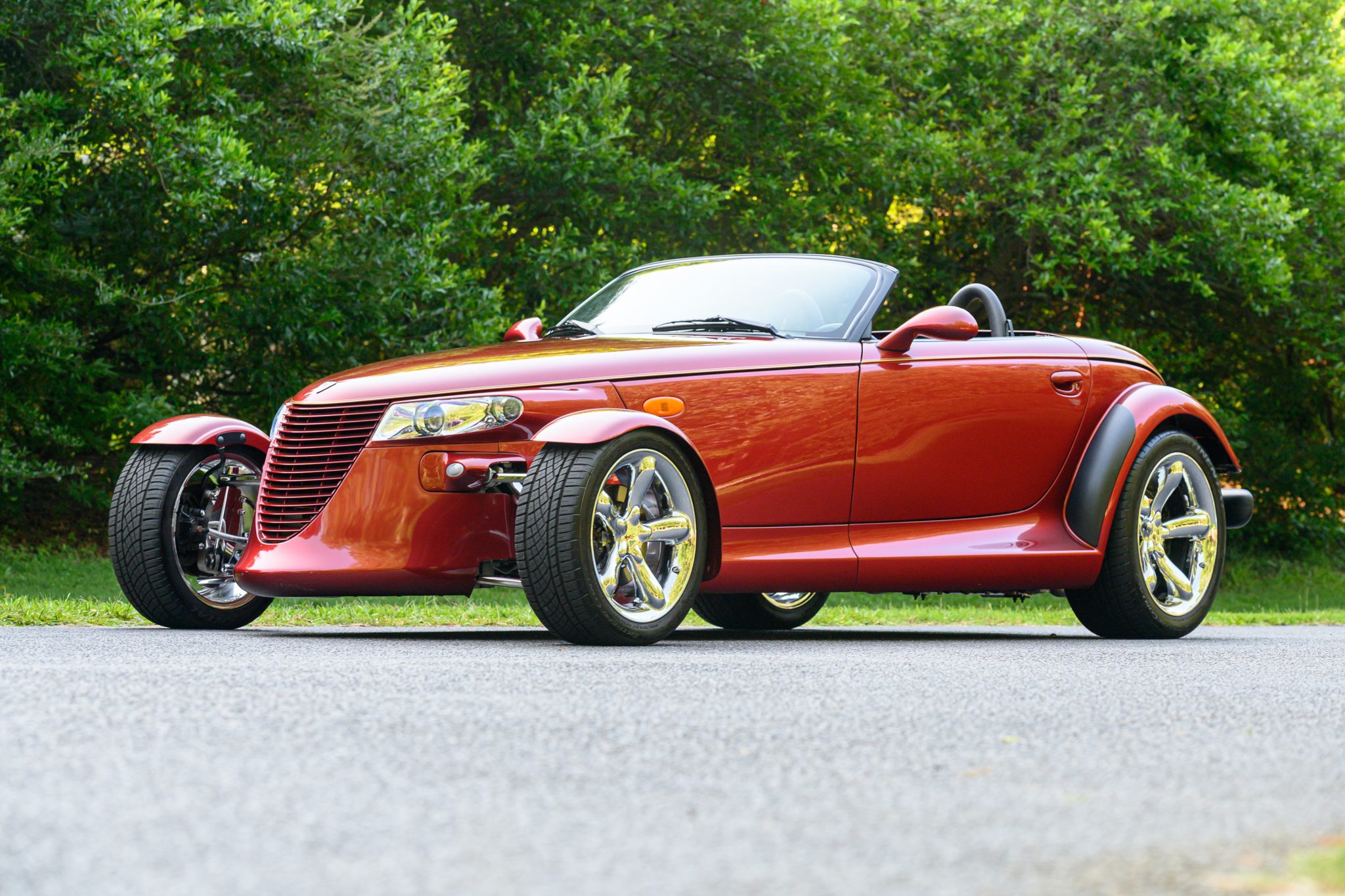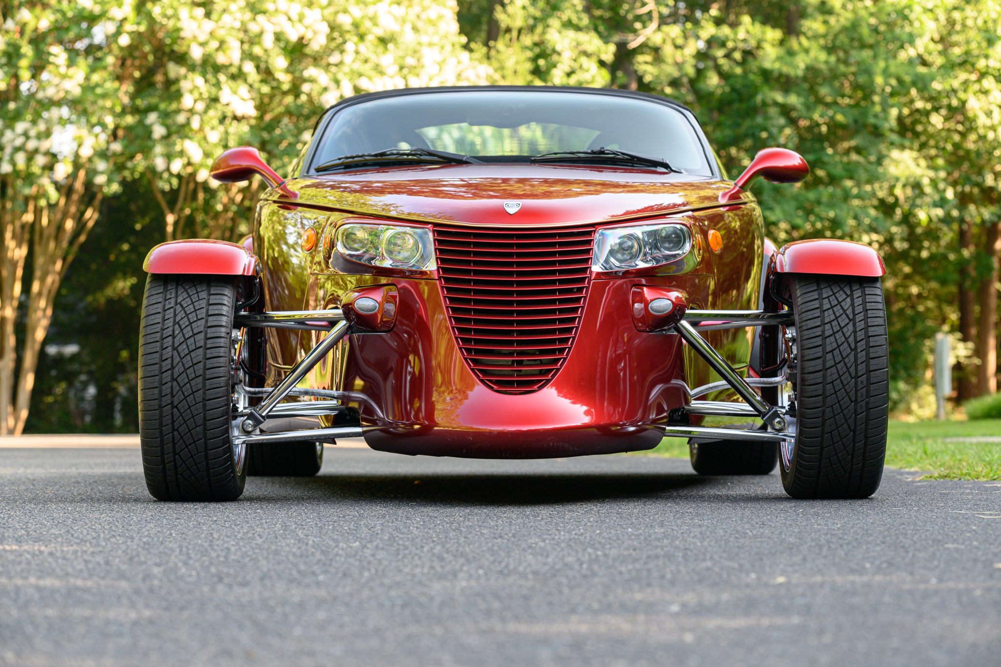 Chrome-finished 17″ x 7.5″ front and 20″ x 10″ rear wheels are mounted with 225/45 front and 295/40 rear tires that show 2018 and 2017 date codes, respectively. The car is equipped with four-wheel disc brakes as well as rack-and-pinion steering.
