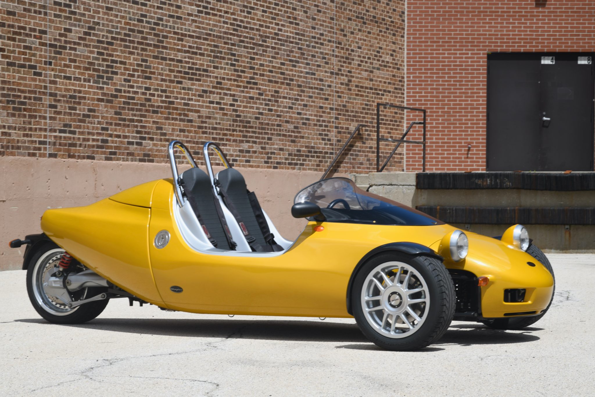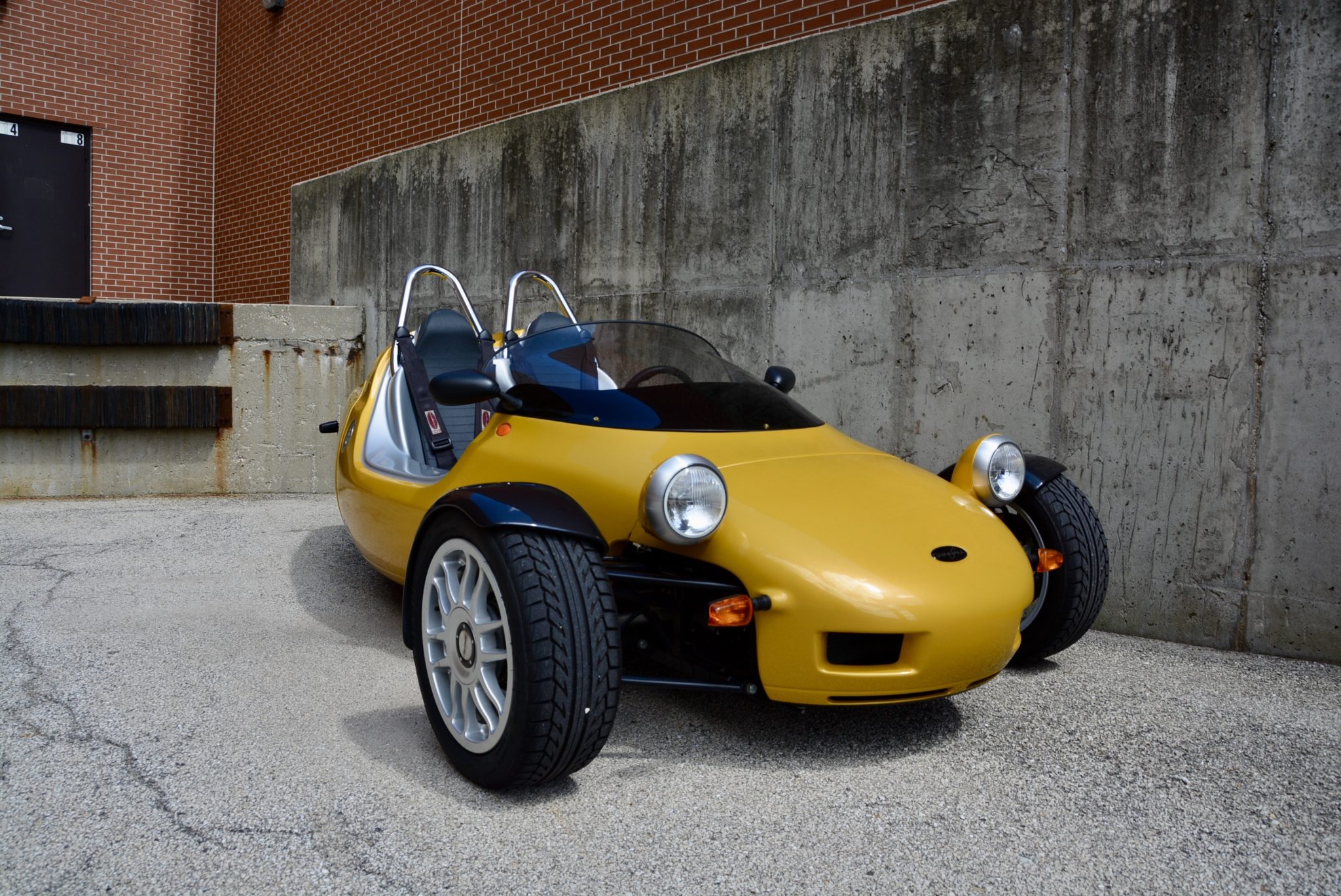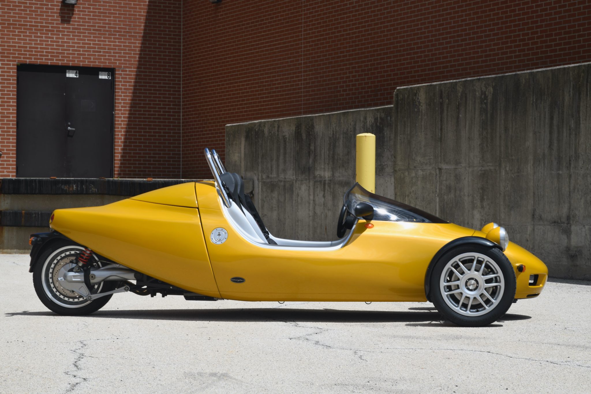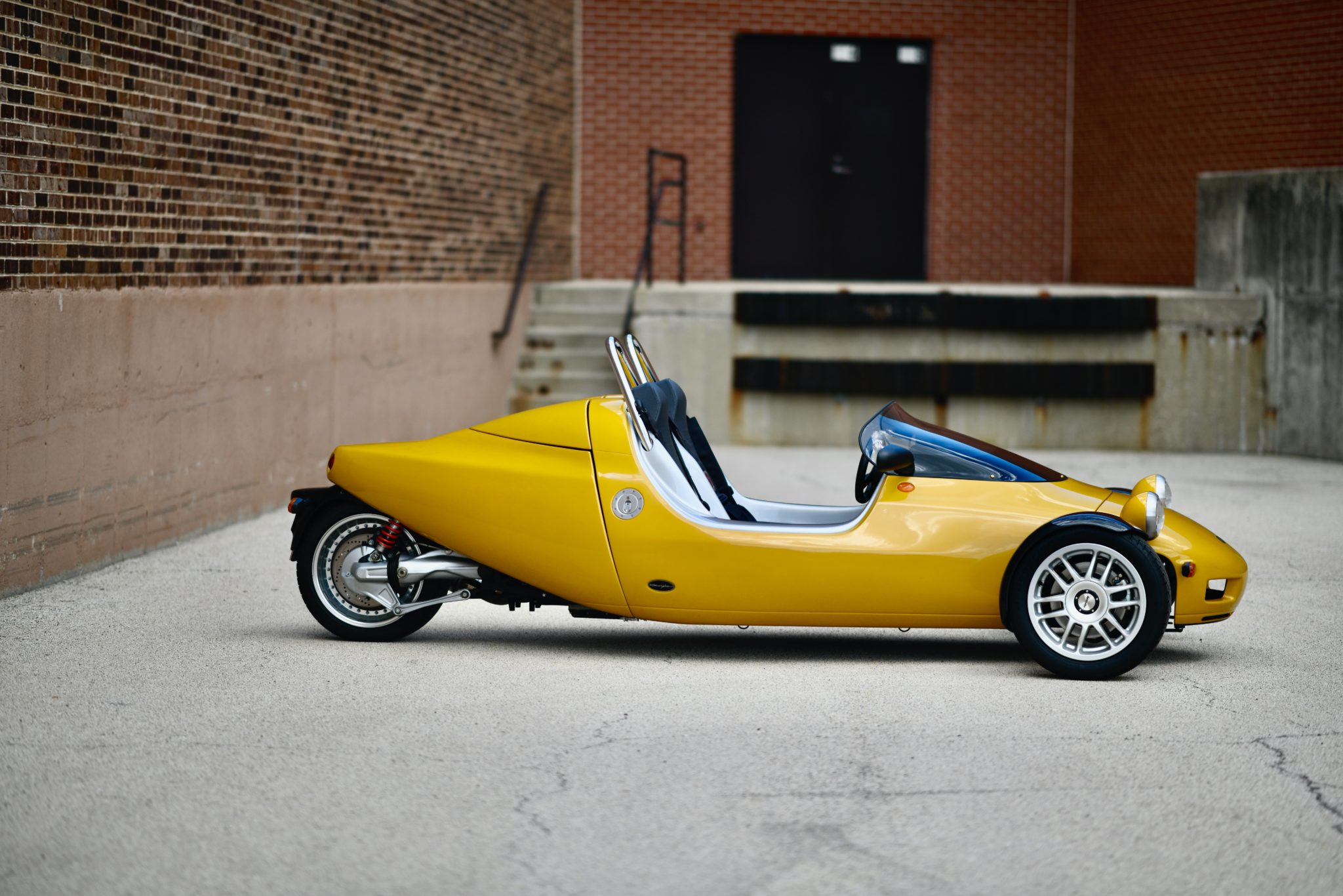All three wheels wear replacement BFGoodrich G-Force tires measuring 15″ front and 16″ rear. Suspension consists of front A-arms with inboard-mounted shocks and an anti-sway bar, while a single-sided rear swingarm that doubles as the driveshaft enclosure is mounted to a monoshock. Braking is from discs at all three wheels.