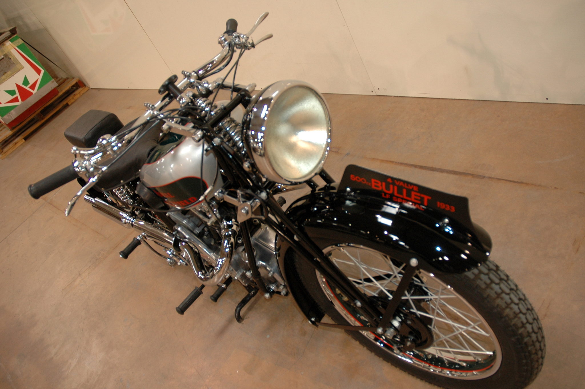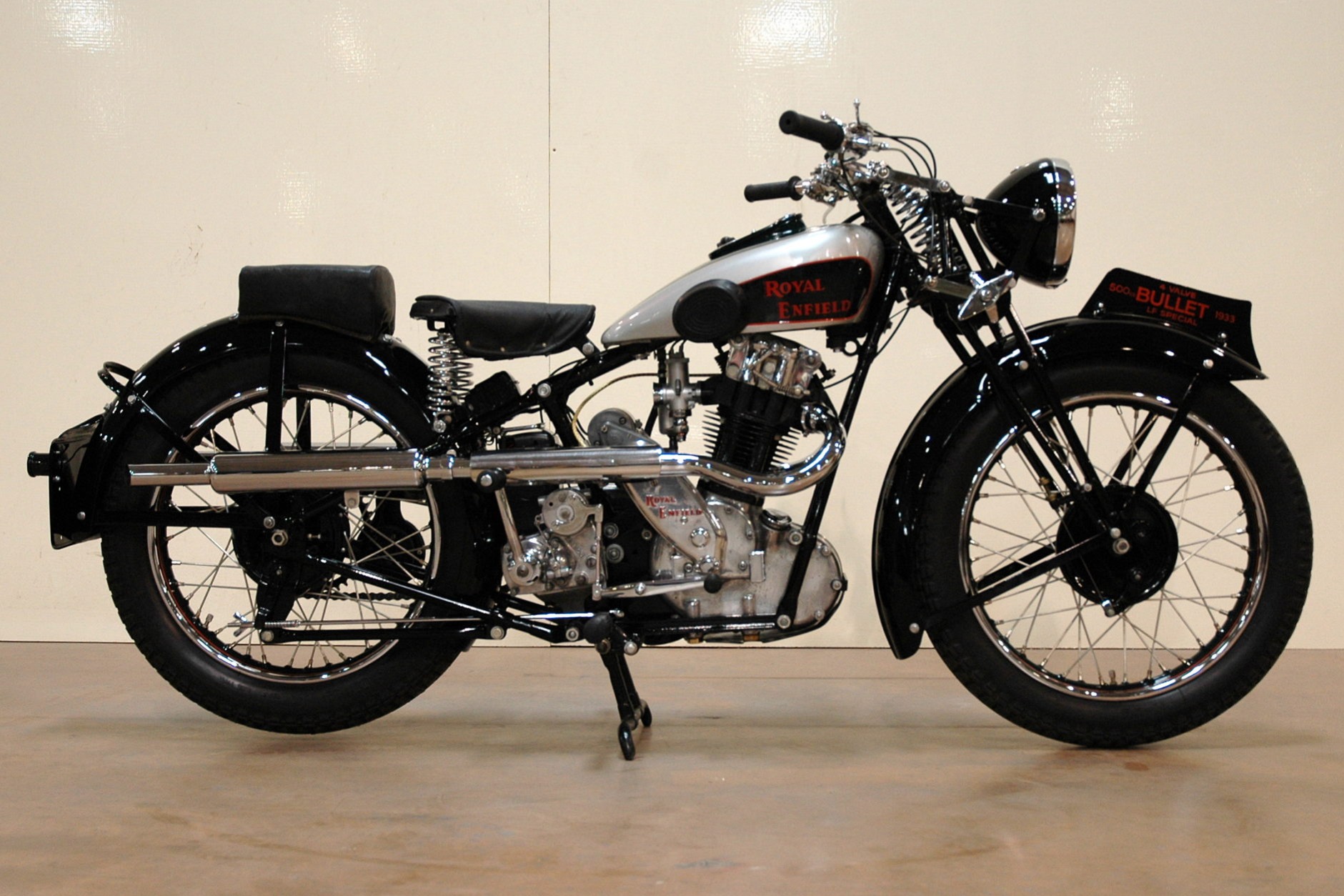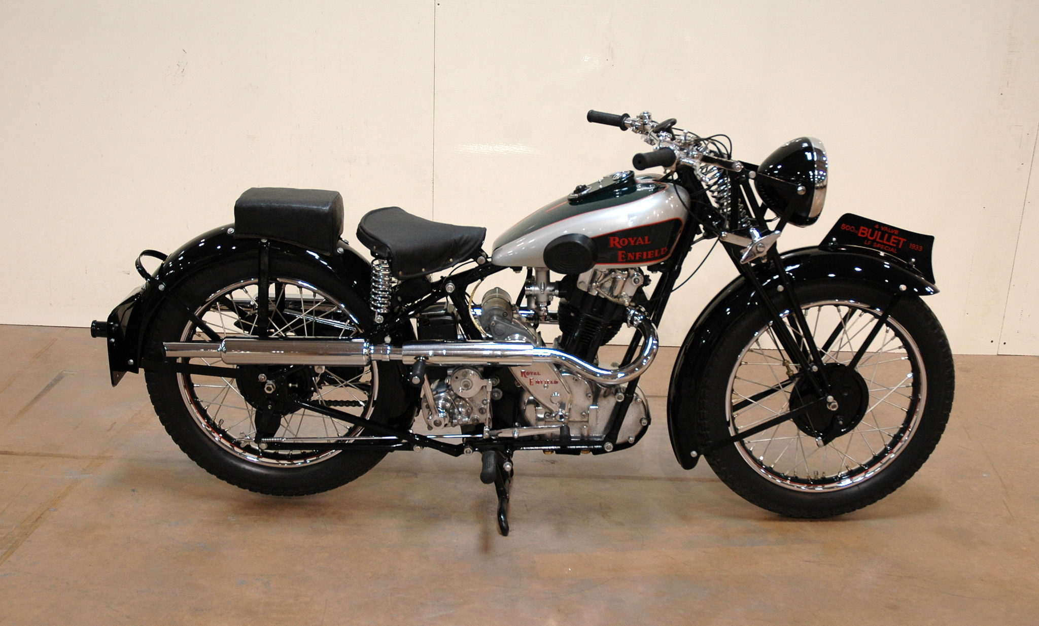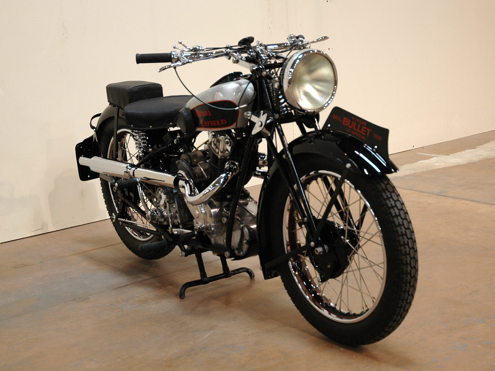 Chrome wire-spoke wheels feature green and red center stripes as well as white spokes, and are fitted with Mitas tires. An adjustable girder front fork provides the bike’s only suspension, and drum brakes are equipped at both ends.