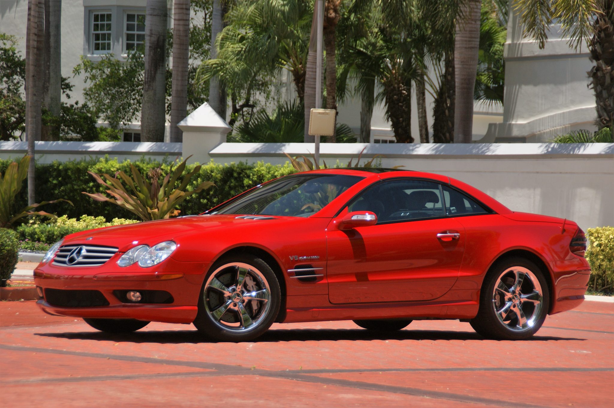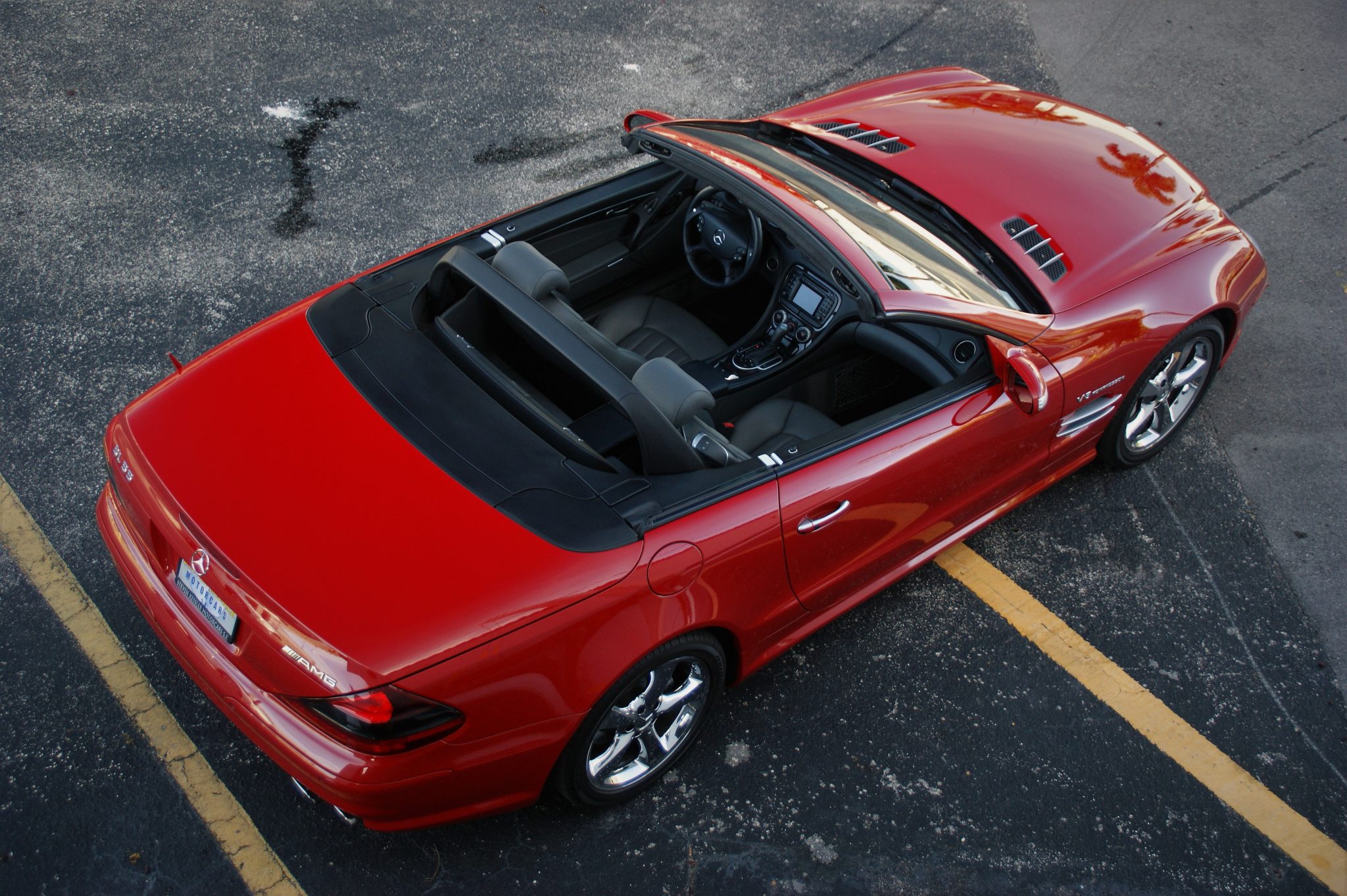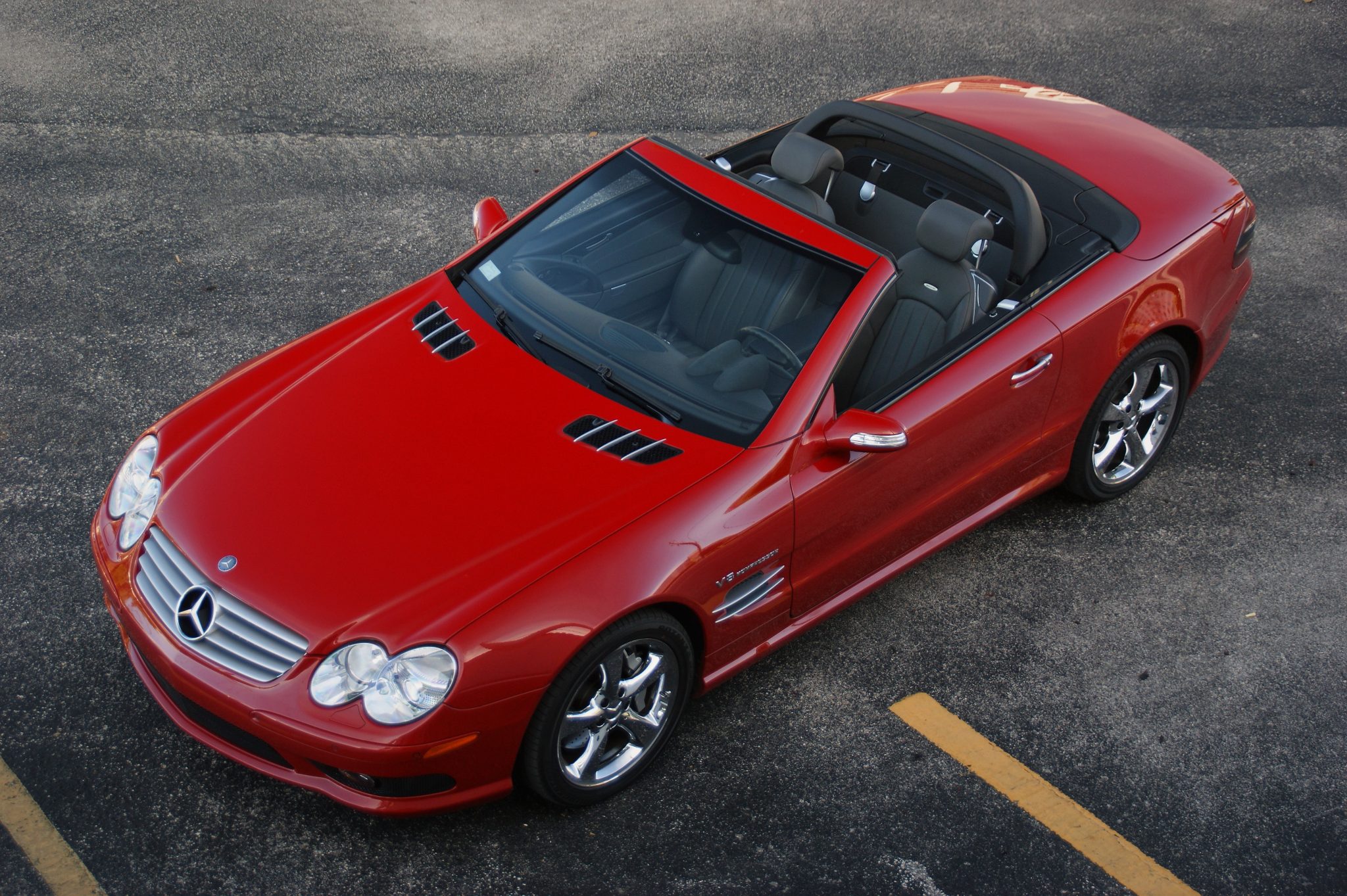 SL600 18″ chrome wheels are wrapped in Bridgestone Potenza RE050A tires. Active Body Control suspension was standard on the SL55, and braking is handled by silver-painted AMG-branded calipers over cross-drilled rotors.