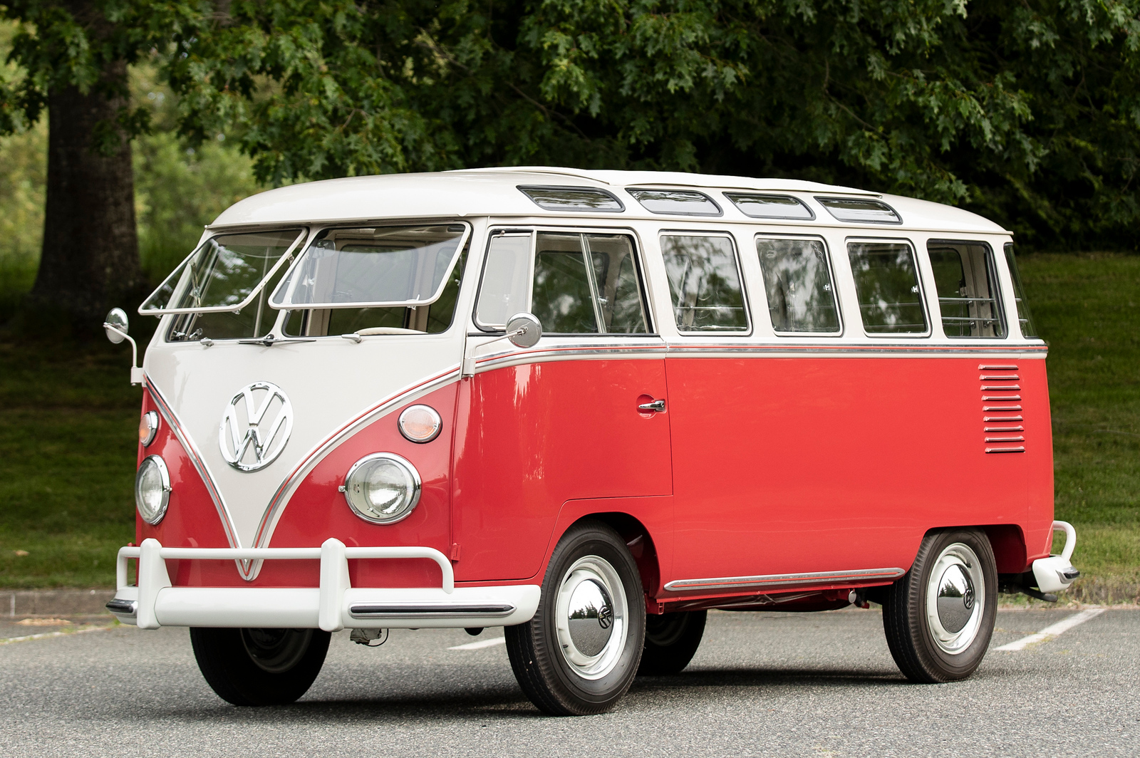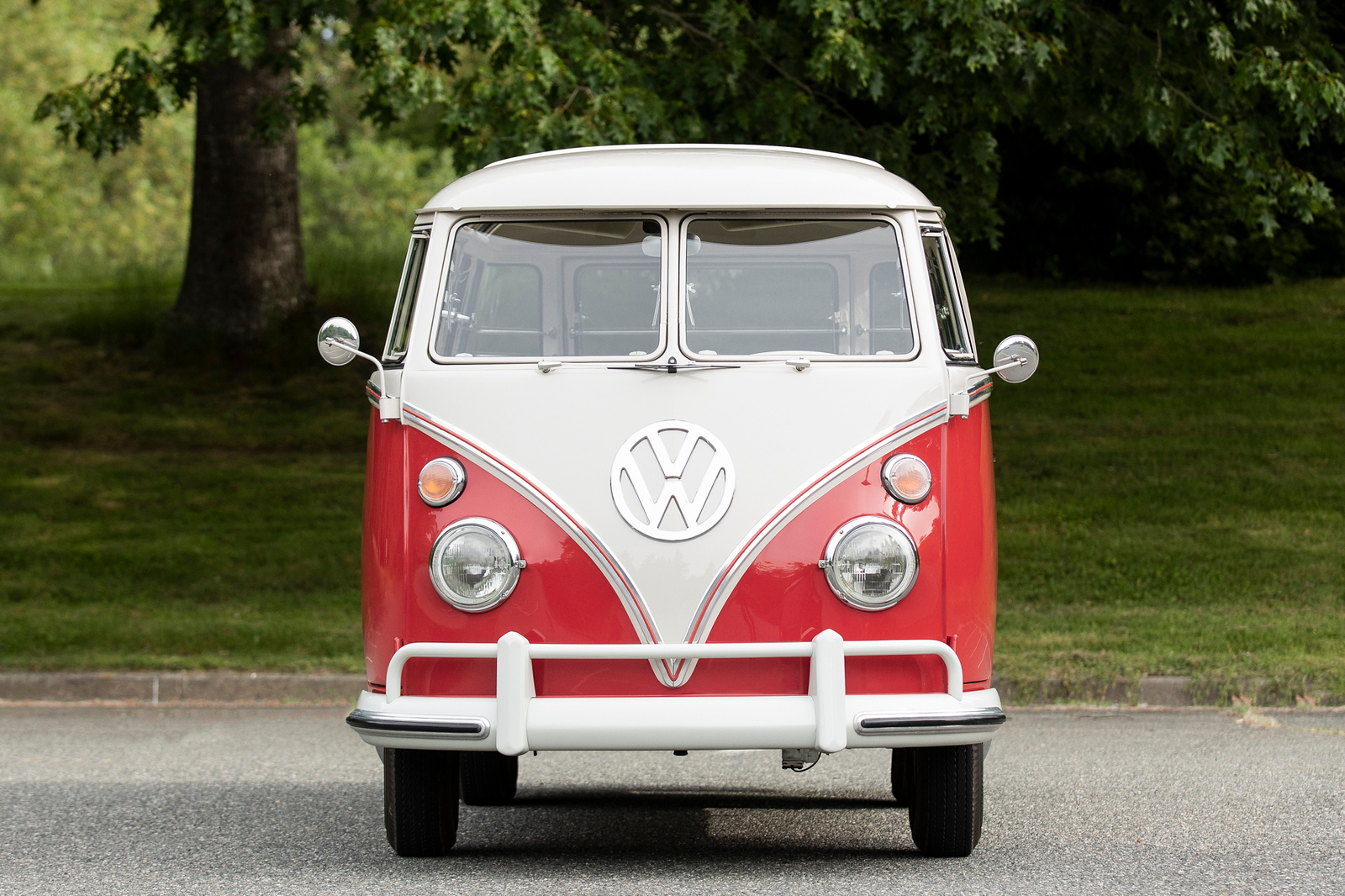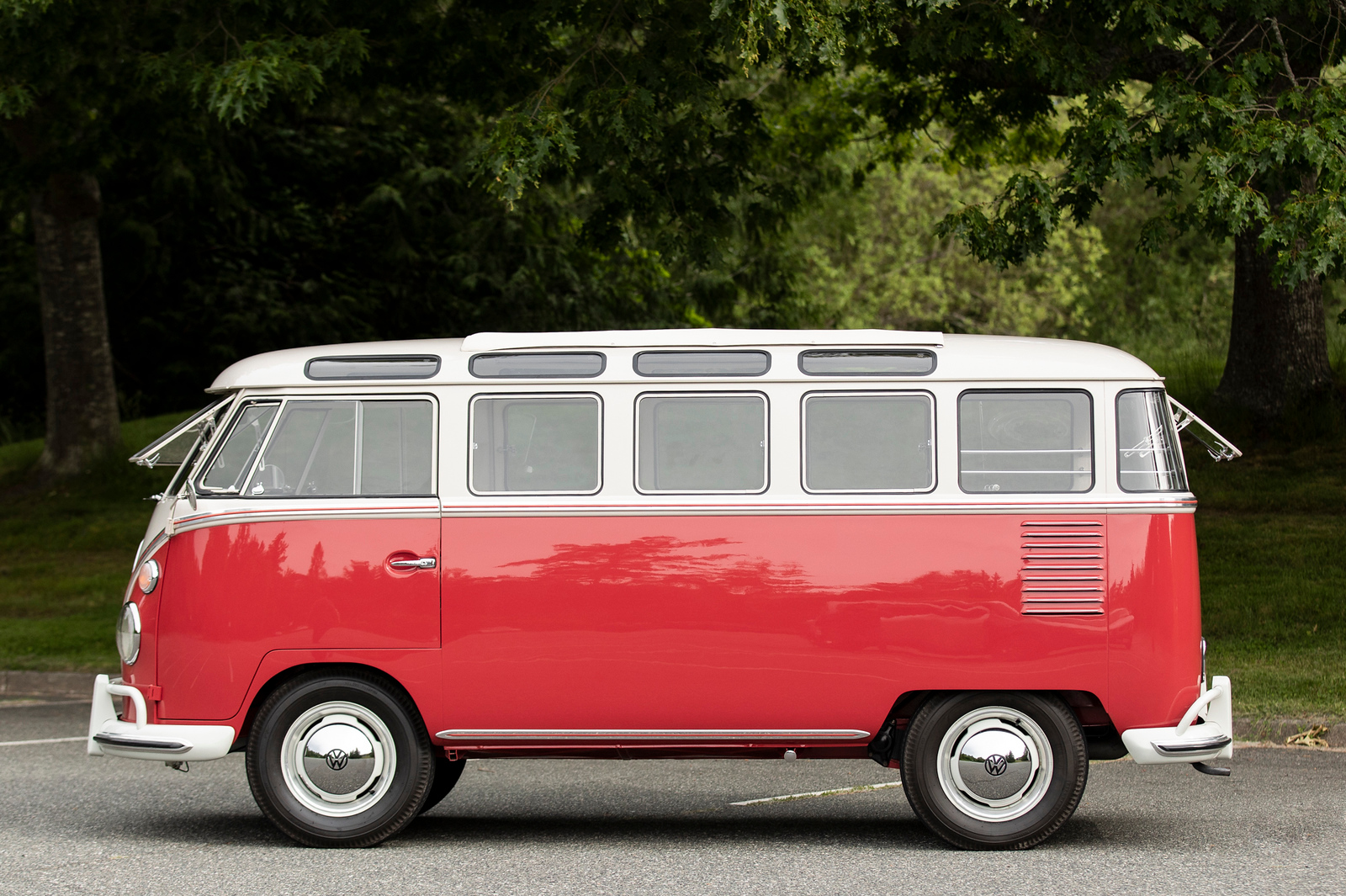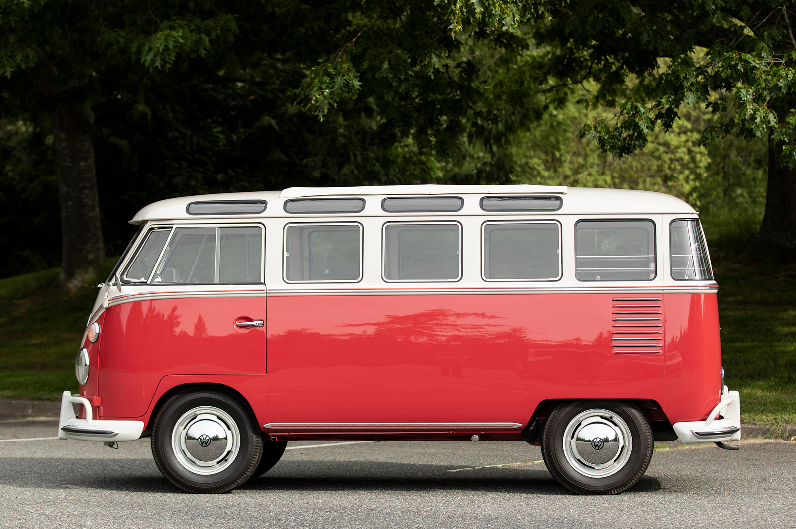 White 15″ steel “wide five” wheels wear chrome VW hubcaps and 6.40-15″ Firestone Deluxe Champion tubeless tires. The steering box side plate was resealed in 2016.