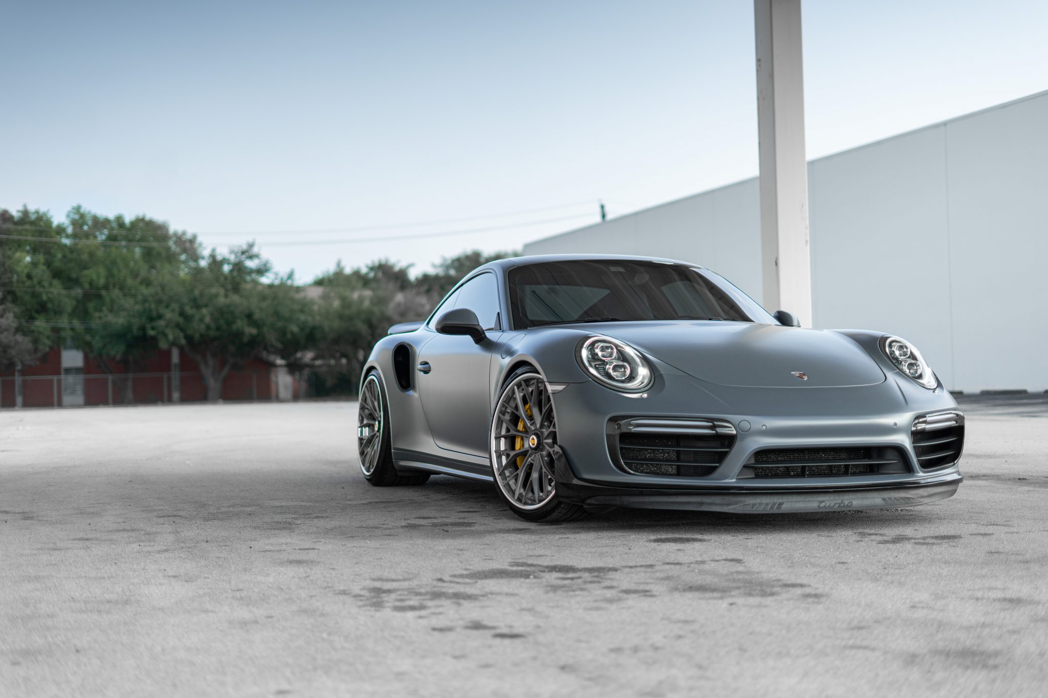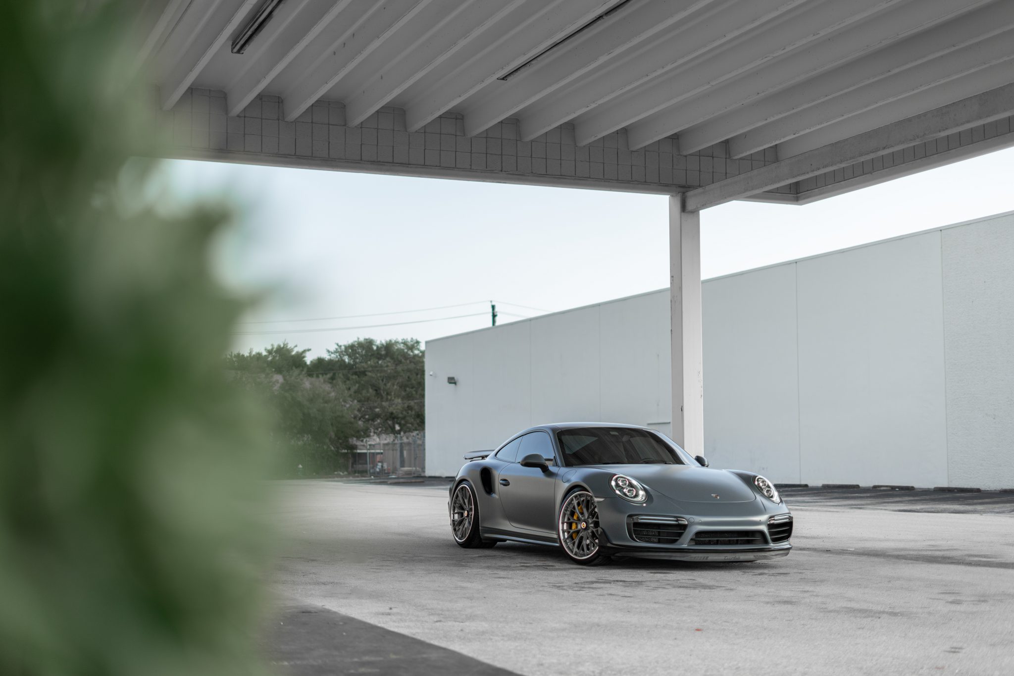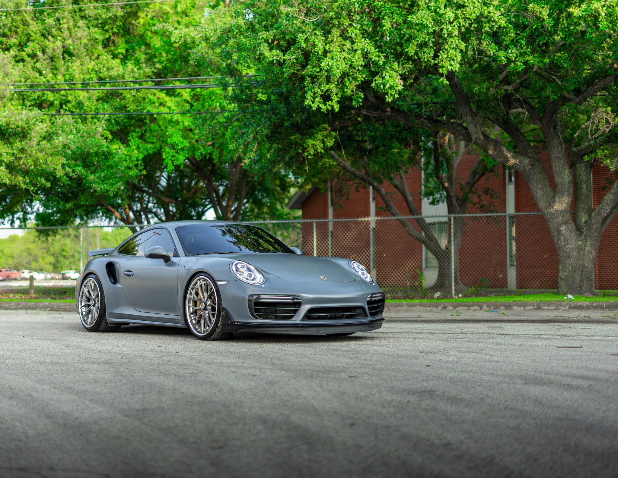 Forged ANRKY AN30 wheels feature titanium hardware and measure 21×9.5″ at the front and 21×12.5″ out back. The mounted Pirelli PZero Nero tires measure 255/30 and 325/25 respectively, and the left rear tire was patched in April 2020. The Porsche Ceramic Composite Brakes (PCCB) are denoted by yellow six-piston front and four-piston rear calipers, and the car is equipped with a set of TechArt lowering springs.