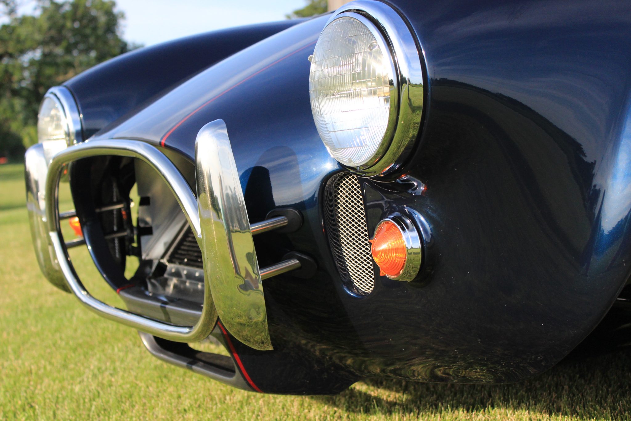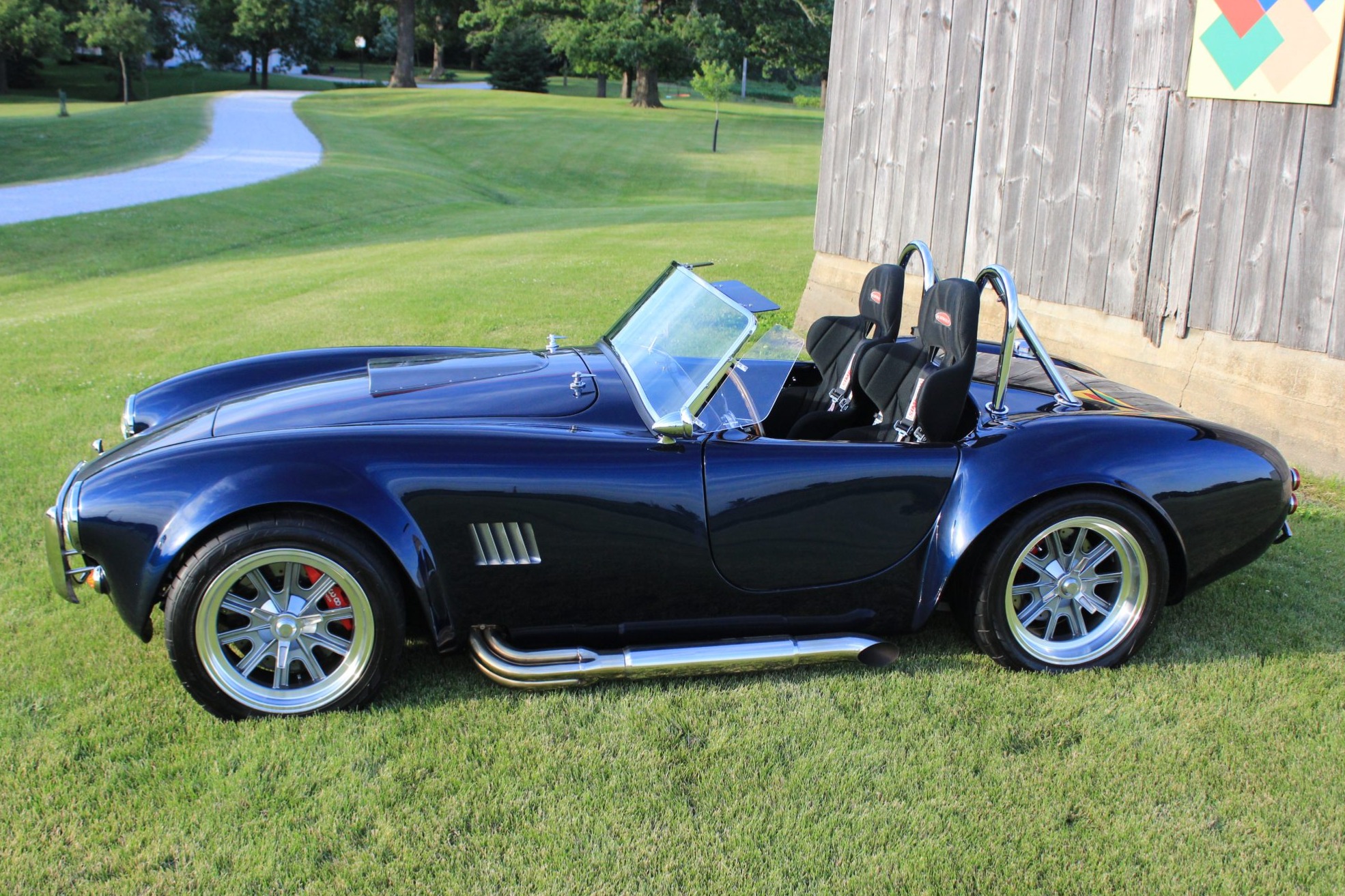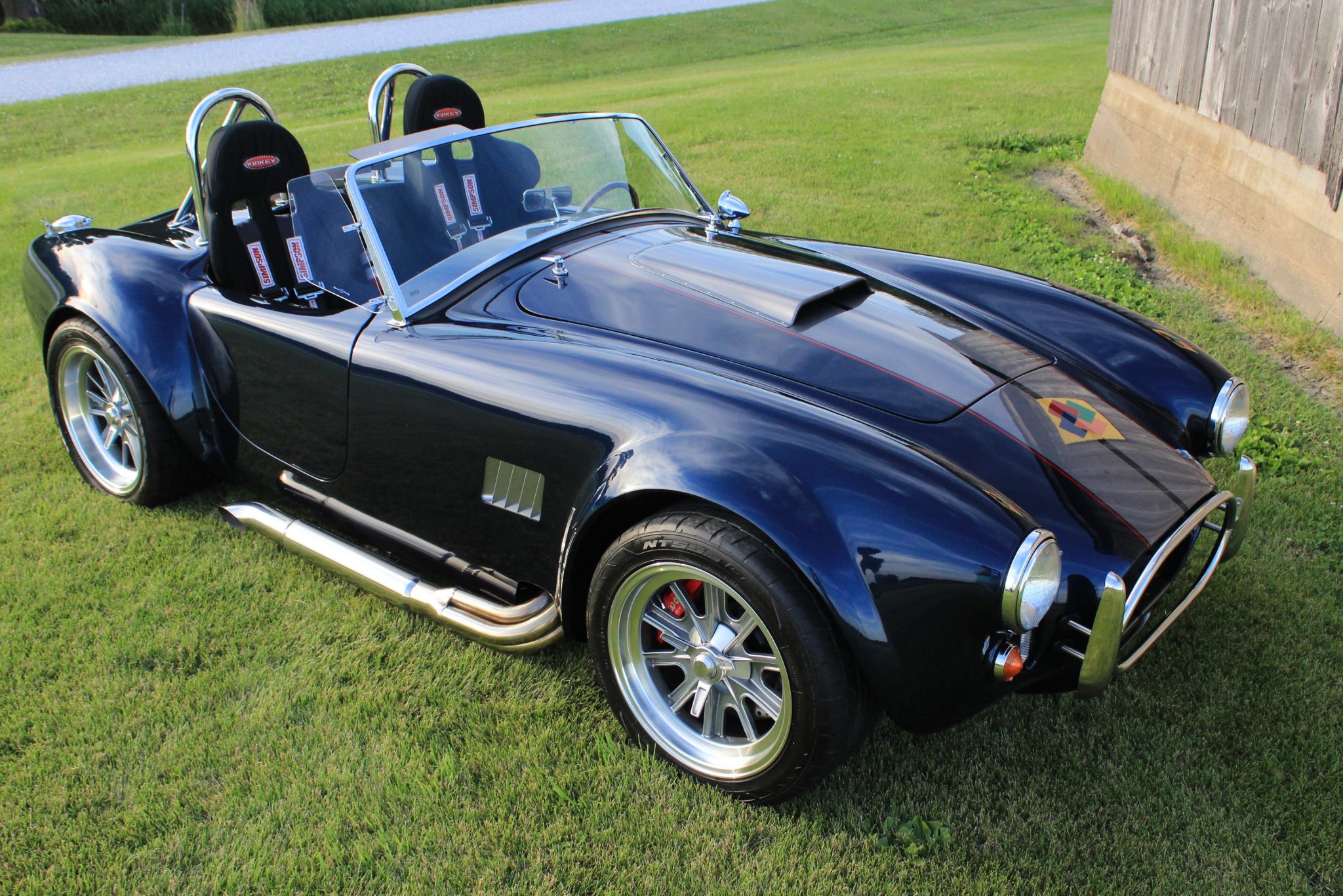 The 17” Halibrand-style wheels feature faux knock-off spinners and are wrapped in Nitto NT555 tires. Braking is handled by four-wheel discs with red Wilwood calipers, and the solid rear axle features Koni coilover suspension.
