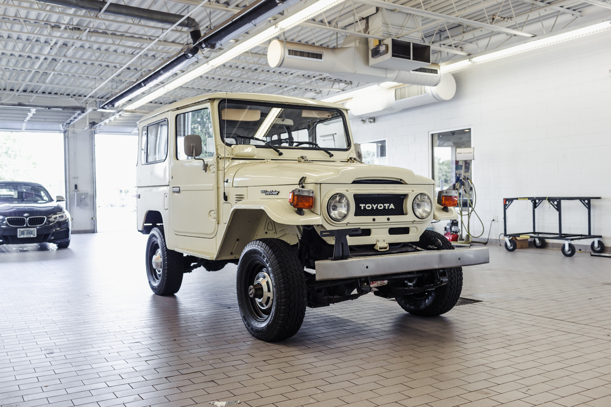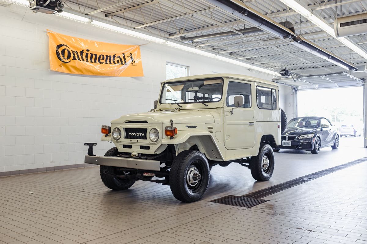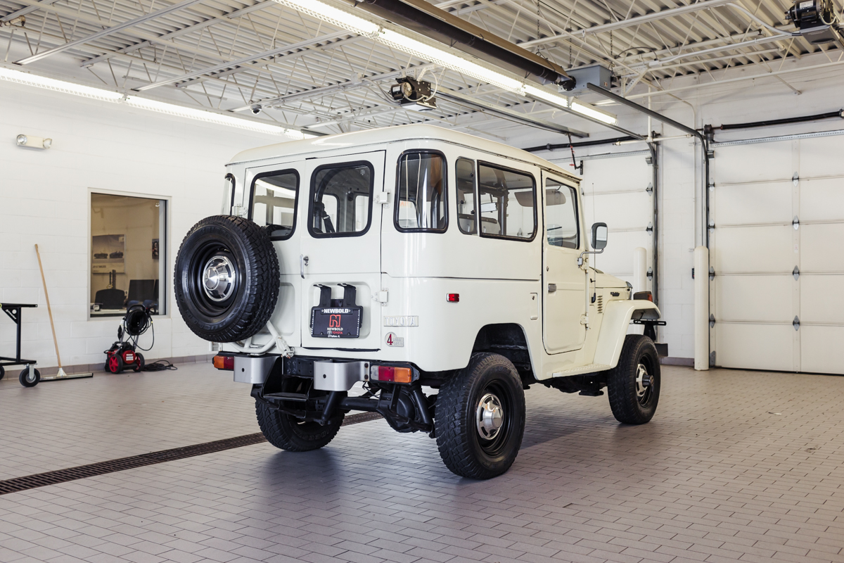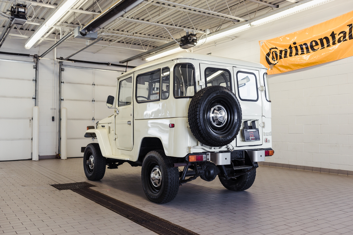 Black 15″ steel wheels wear polished hubcaps and Bridgestone Dueler A/T tires. Equipment includes manually locking front wheel hubs and a rear-mounted spare tire.