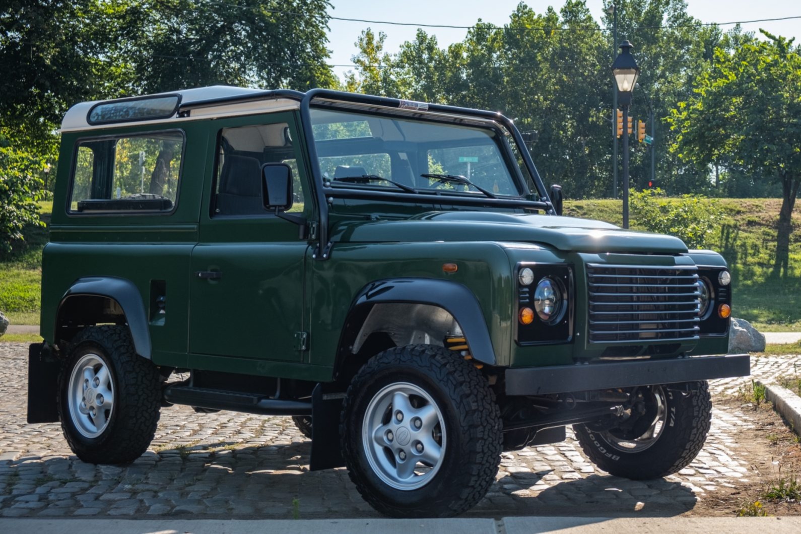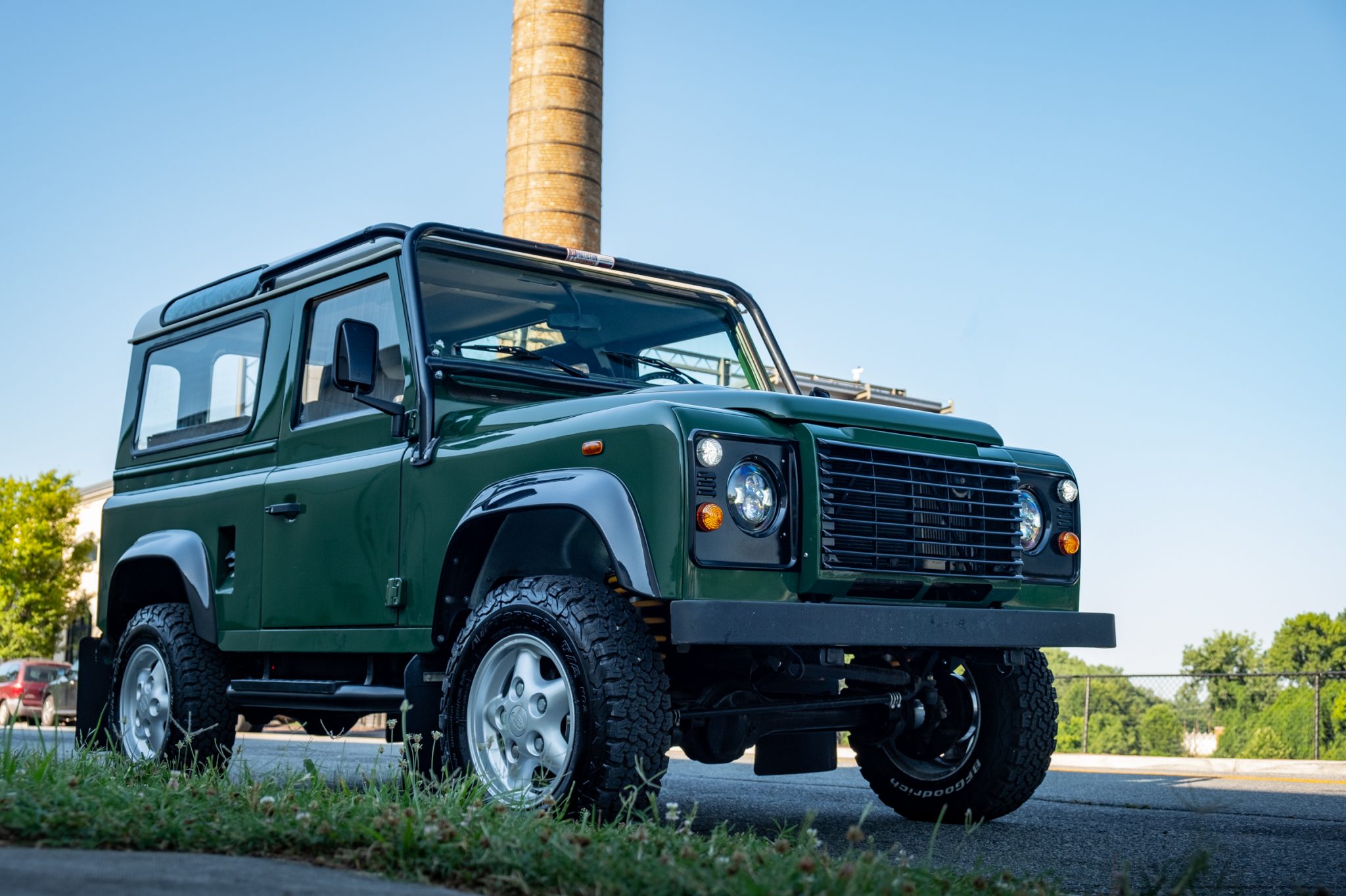 Late-model 16″ Land Rover wheels replace the stock versions and wear 225/75 BFGoodrich All-Terrain T/A KO2 tires, including the rear-mounted spare. Work carried out under current ownership included a braking system overhaul with replacement pads, calipers, discs, and shoes as well as installation of new springs, shocks, and steering arms. A steering damper was also fitted.