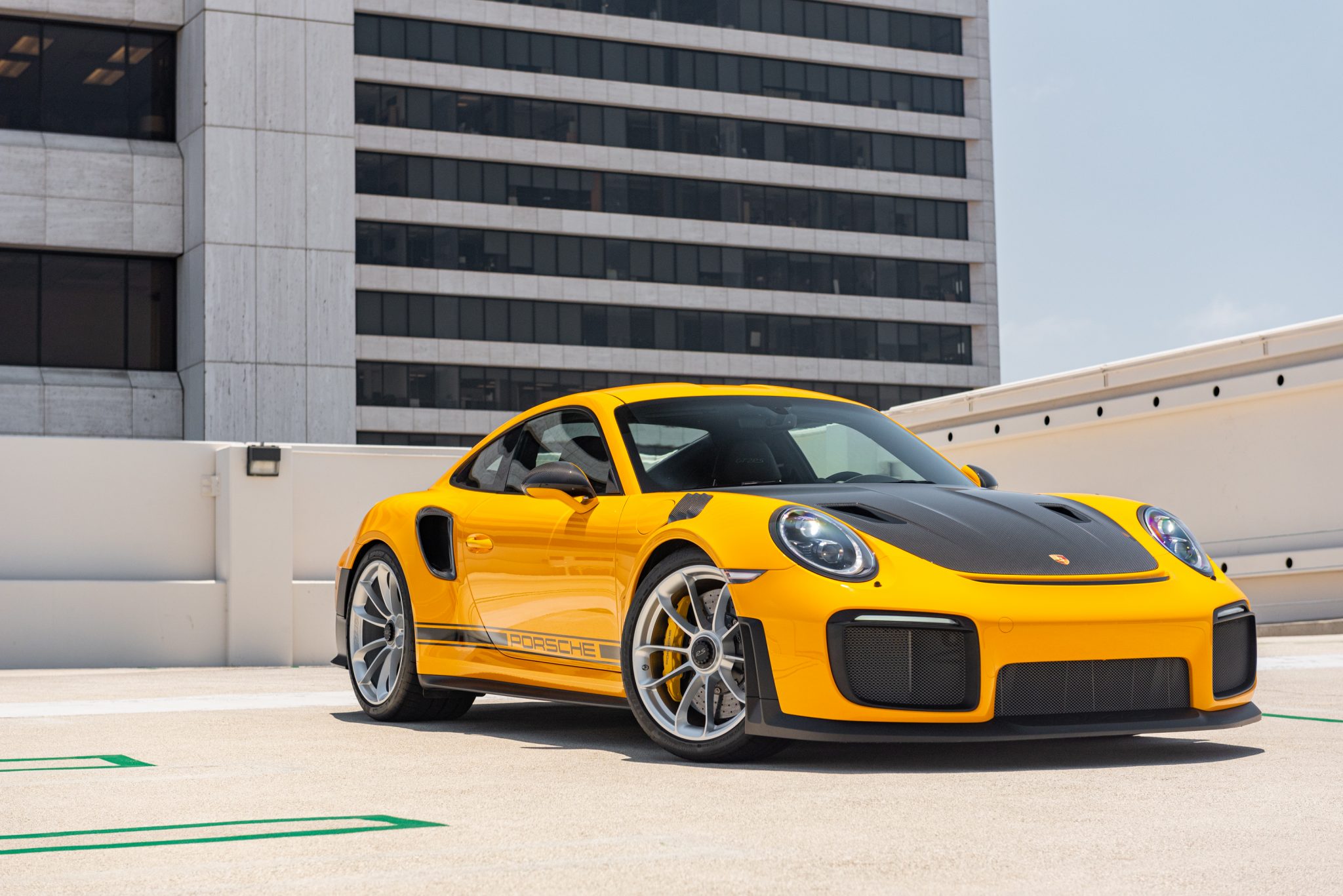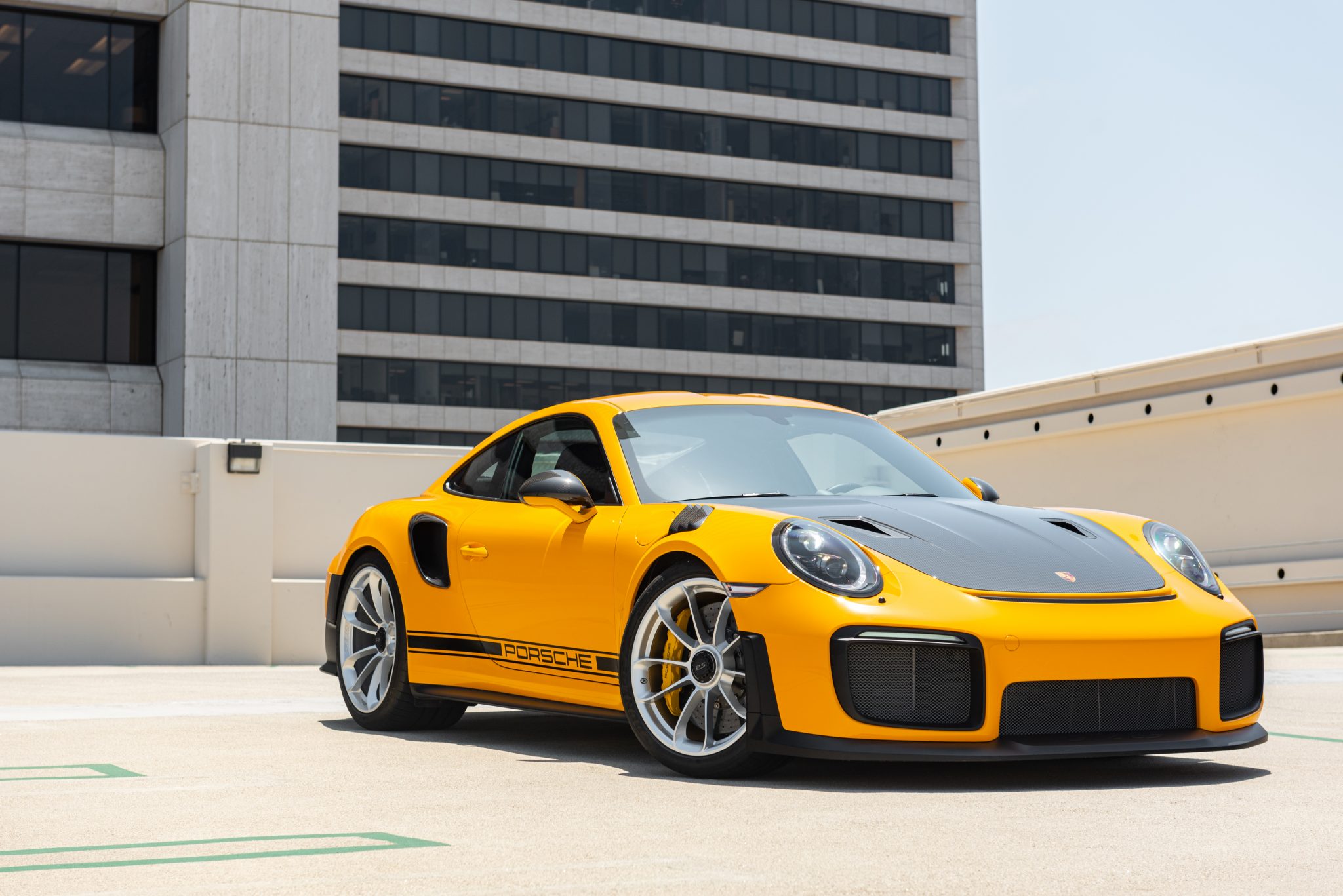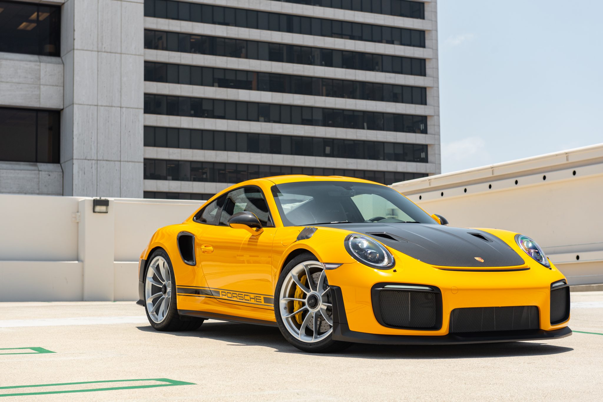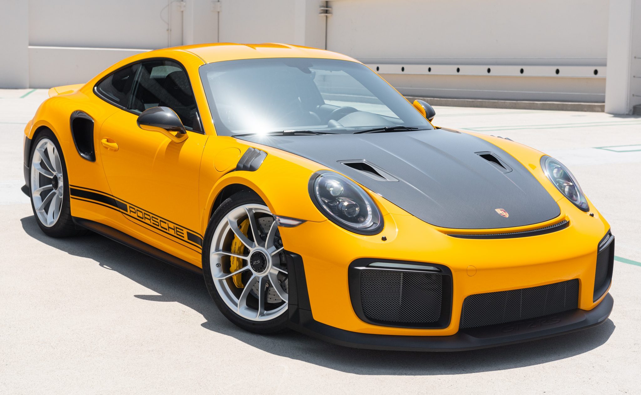 Satin Aluminum-finished 20″ front and 21″ rear wheels are mounted with Dunlop Sport Maxx Race 2 tires sized 265/35 front and 325/30 rear. Porsche Ceramic Composite Brakes (PCCB) were standard on the GT2 RS and feature yellow-finished calipers along with 16.1″ front rotors and 15.4″ rears.