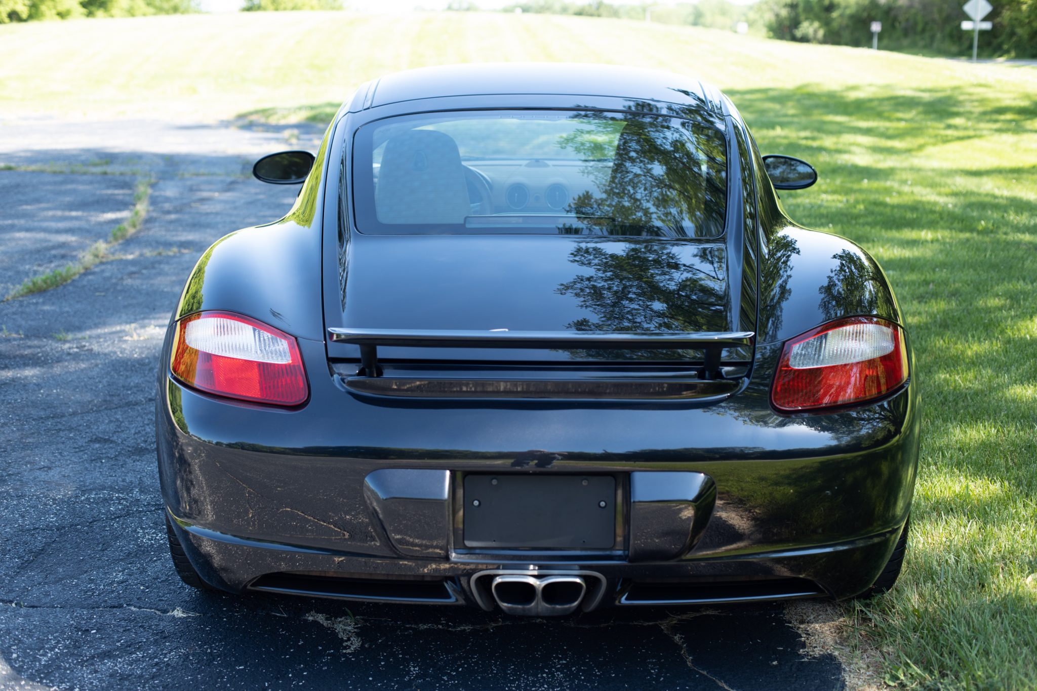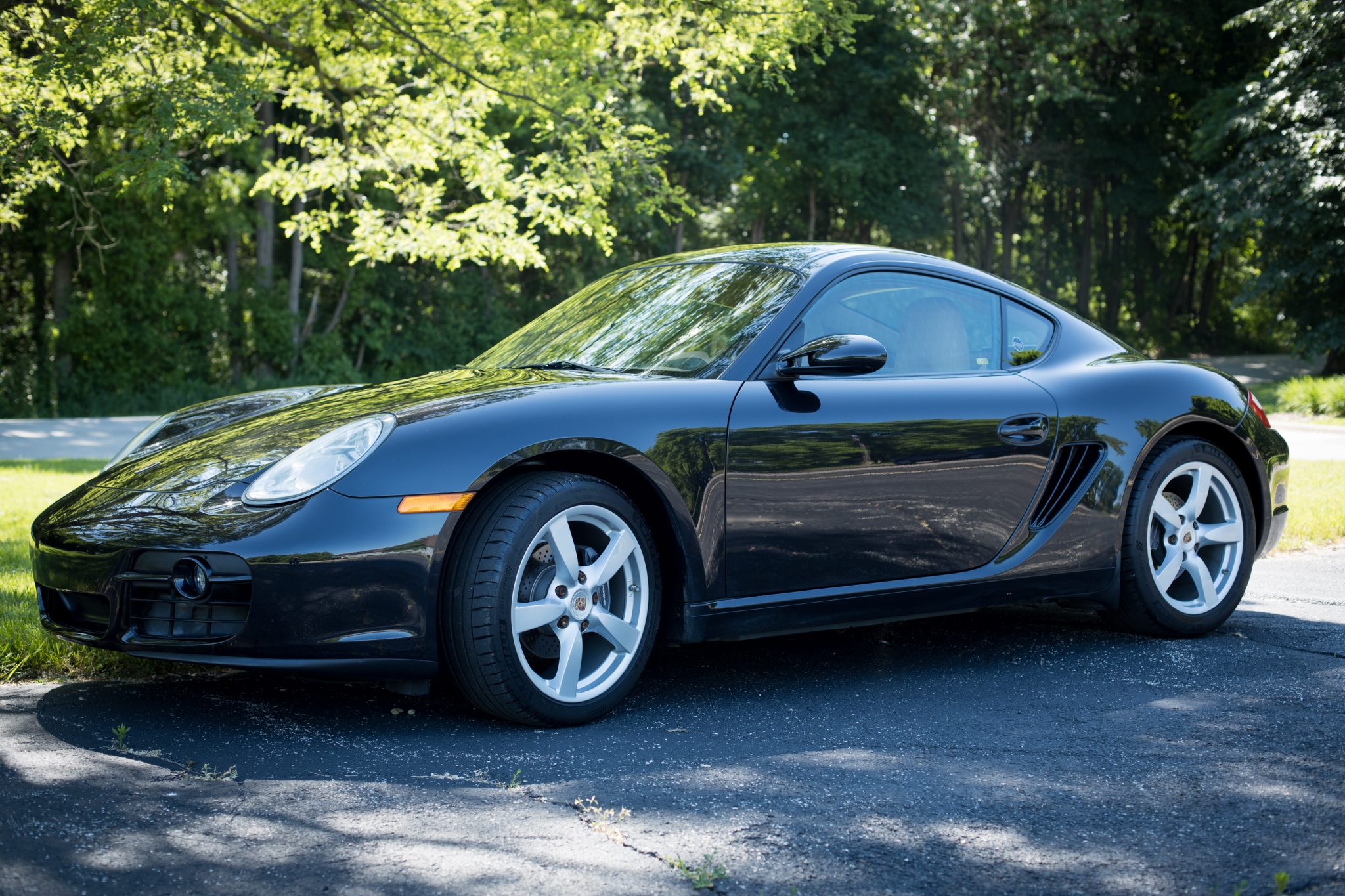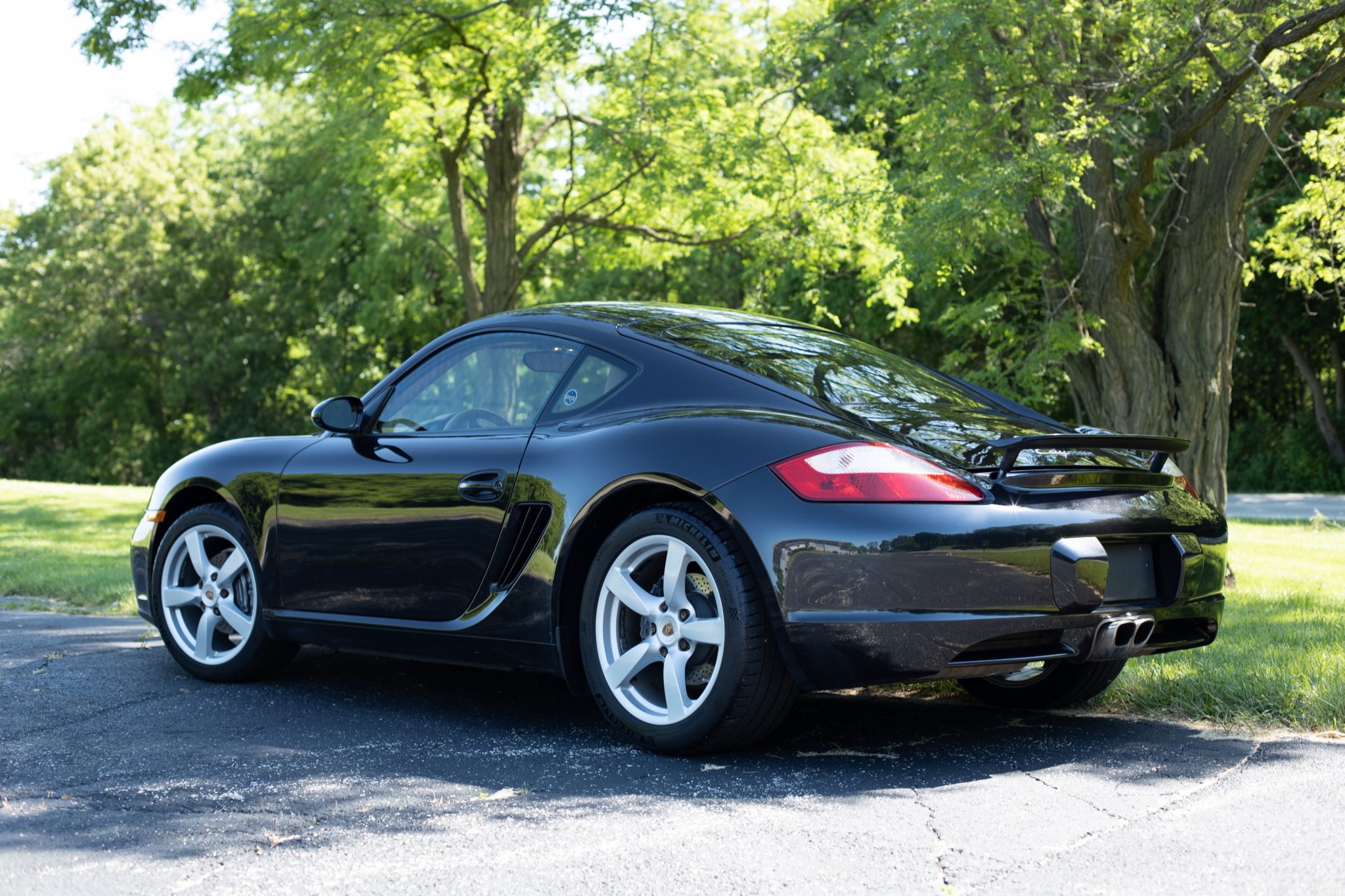 Optional 18″ Cayman S wheels wear colored Porsche crest center caps and Michelin Pilot Sport 4s tires that show date codes from 2018. Scratches are visible on the edges of the wheels.