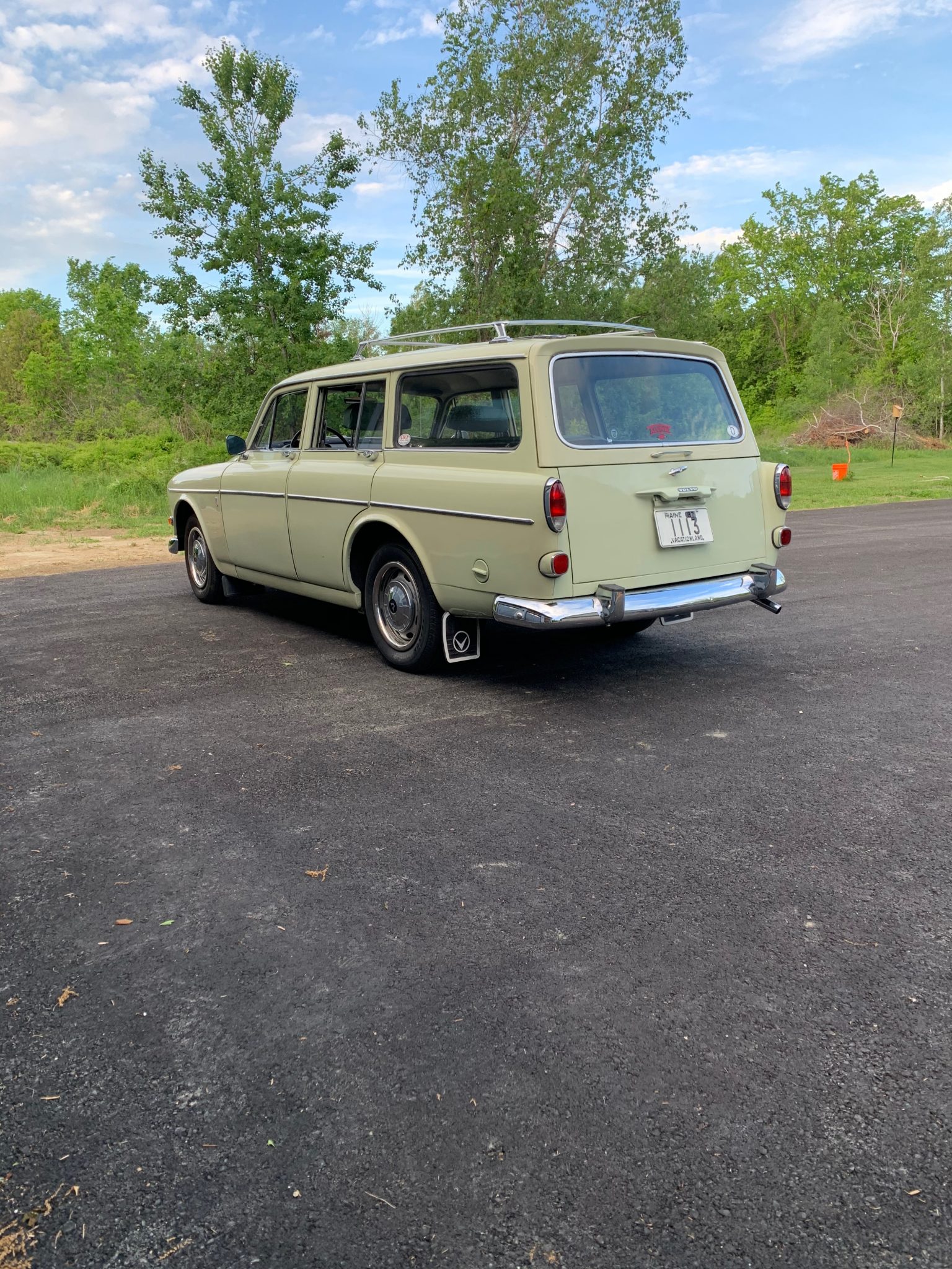 Factory 15″ steel wheels with polished hubcaps and trim rings are wrapped in Classic Radial LL800 All Season tires. Additional equipment includes a luggage rack, front vent windows, and mud flaps, as well as chrome-accented bumpers, drip rails, side moldings, and the tailpipe. Two bumper corners reportedly have been replaced during current ownership.
