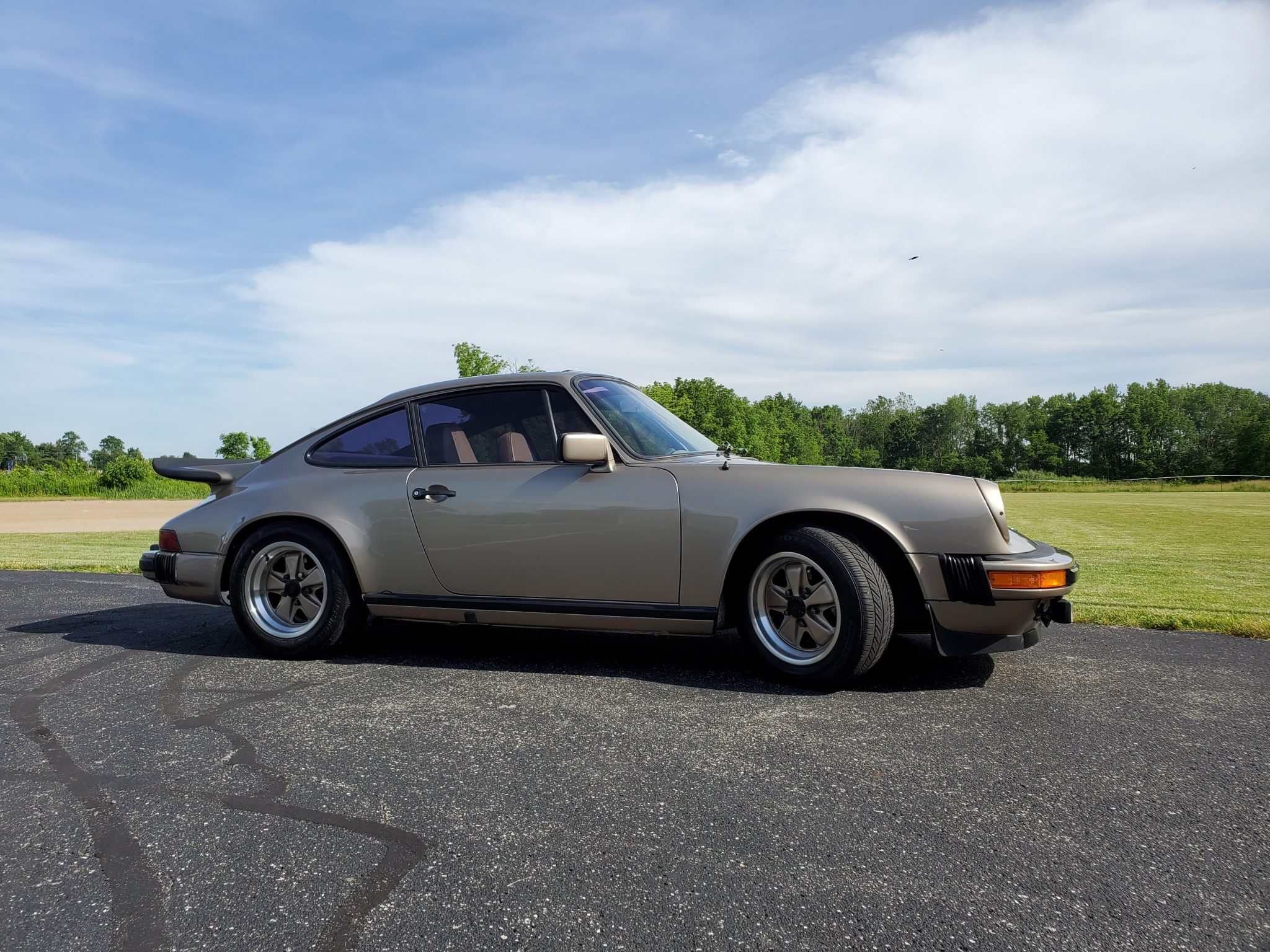 Body-colored 15″ Fuchs wheels feature polished lips and are mounted with Bridgestone Potenza tires sized 205/60 up front and 215/60 out back.