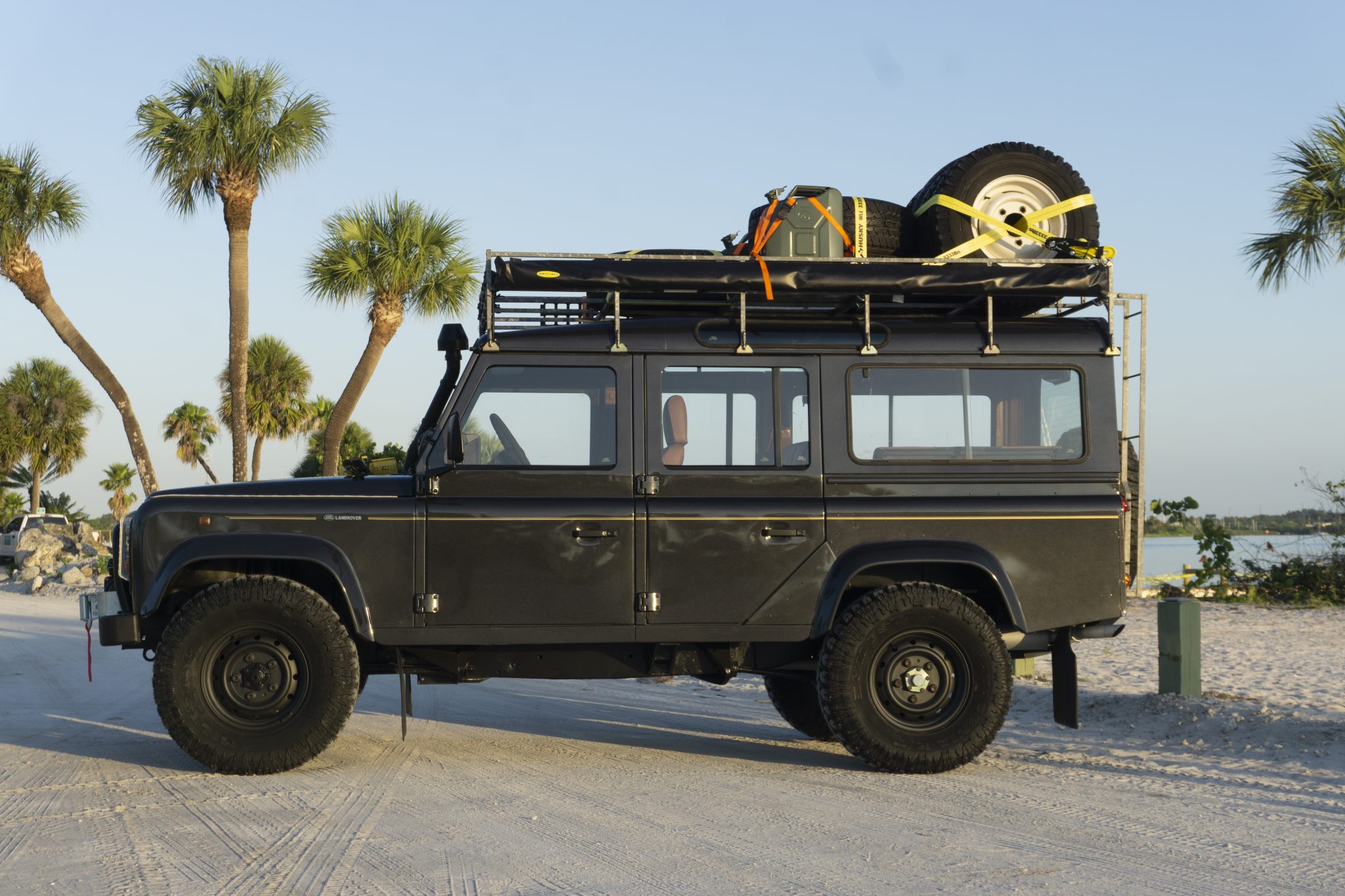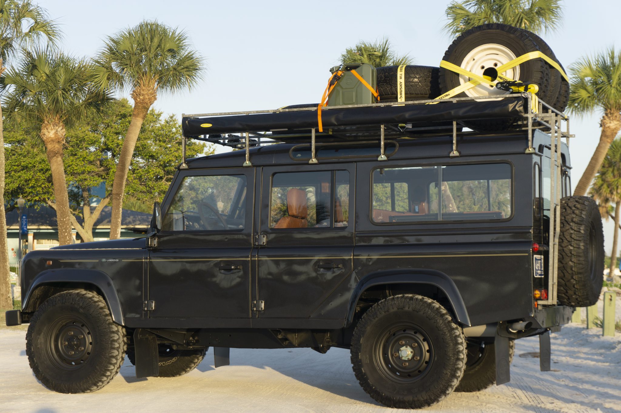 Black steel wheels are mounted with Patagonia mud-terrain tires. Spares include two-sets of steel wheels, one of which is mounted with road tires, while the other set is shod in Michelin military-spec tires according to the seller. A walk-around video is provided by the seller along with footage of the awning being extended.