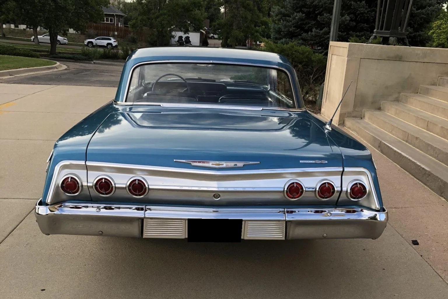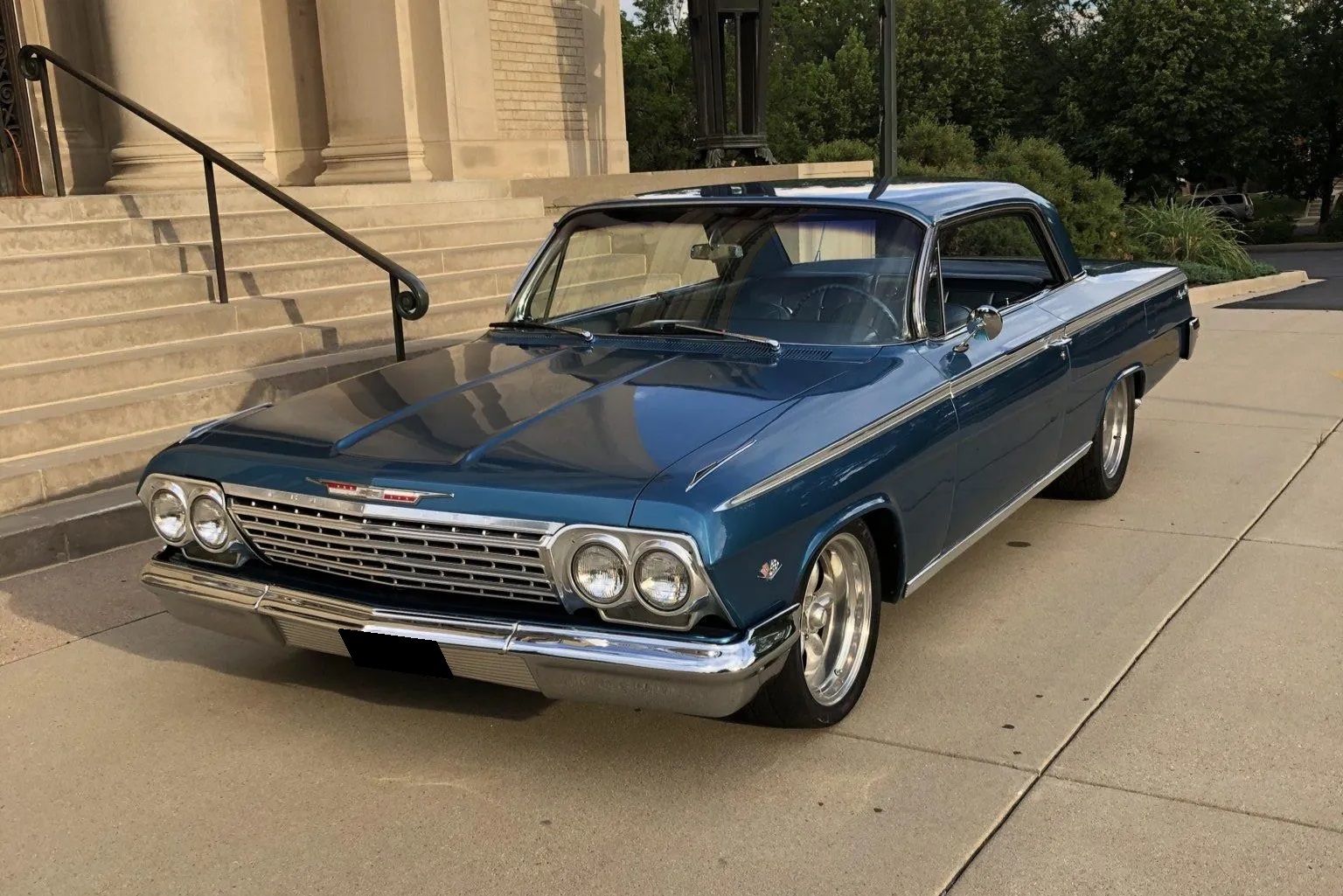 The car rides lower than stock over polished 17″ American Racing Torq Thrust II wheels wearing Kumho tires. The front drum brakes were replaced by power-assisted calipers and discs during current ownership. An aftermarket power steering system installed by the seller is based around a Chevrolet 500-series steering box.