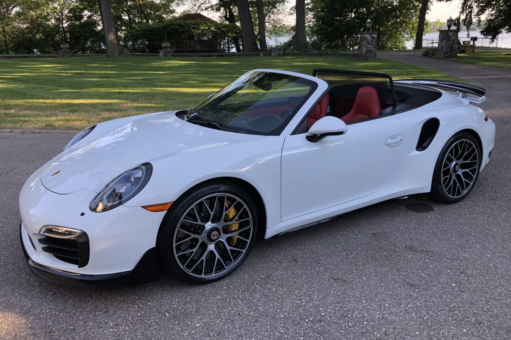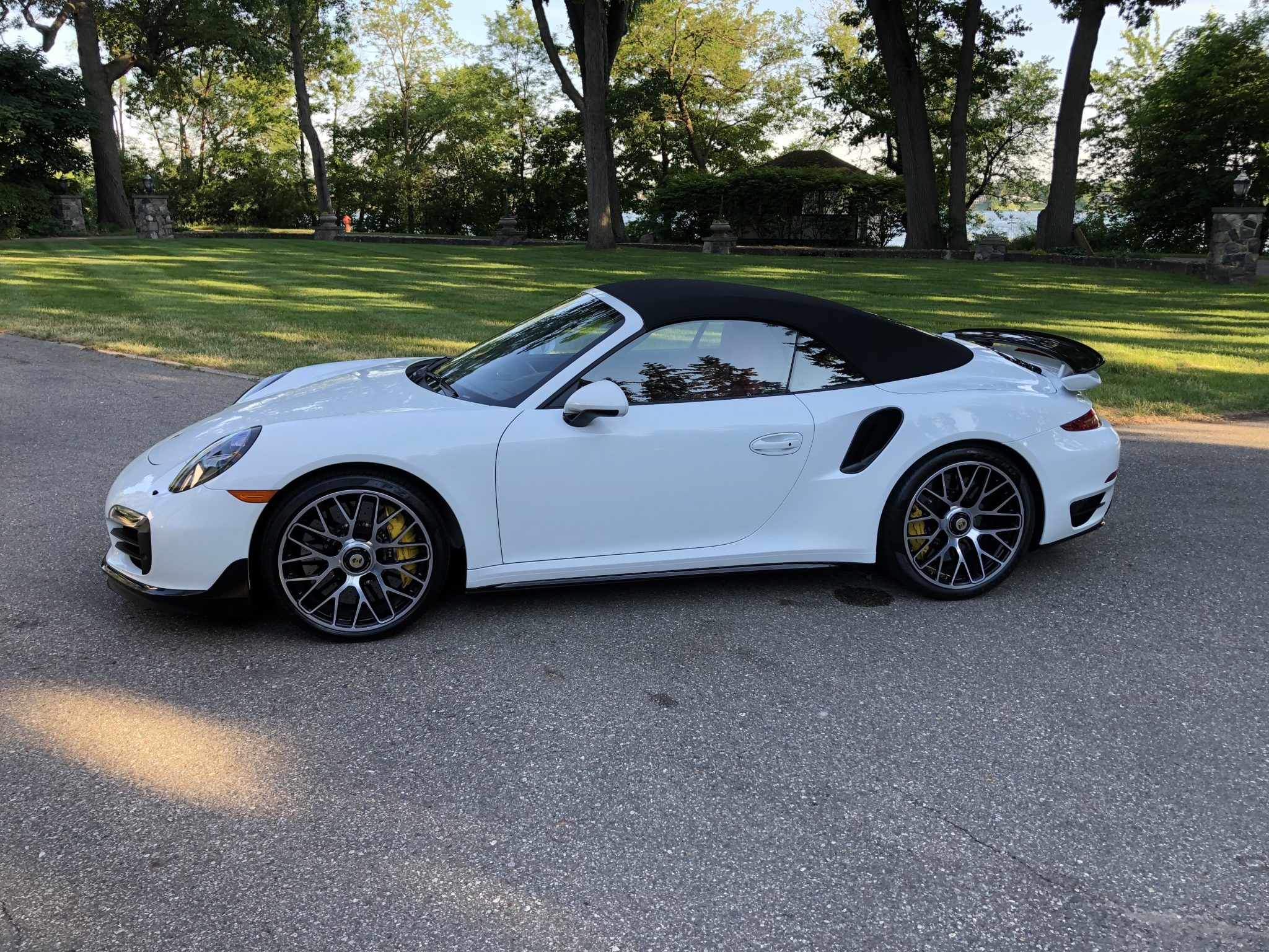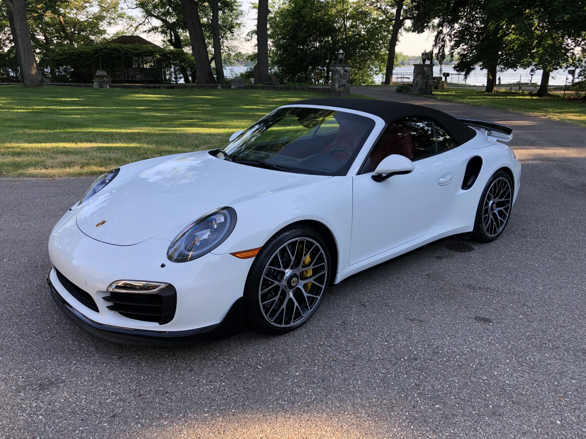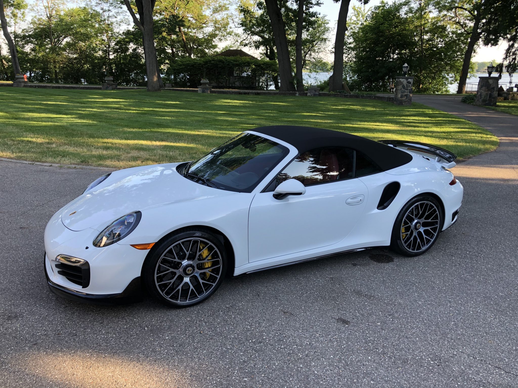 Factory 20″ center-lock wheels are mounted with Pirelli P Zero tires measuring 245/35 up front and 305/30 out back. The Porsche Ceramic Composite Brake system was standard on the Turbo S, and features 410mm front and 390mm rear rotors paired with yellow-finished six- and four-piston brake calipers, respectively. Equipment includes Porsche Dynamic Chassis Control, Porsche Active Suspension Management, rear-axle steering, and optional Power Steering Plus.