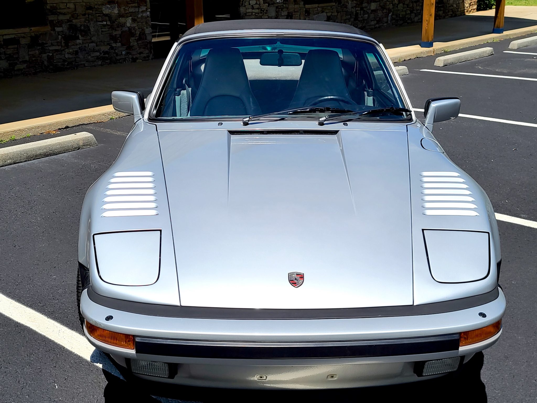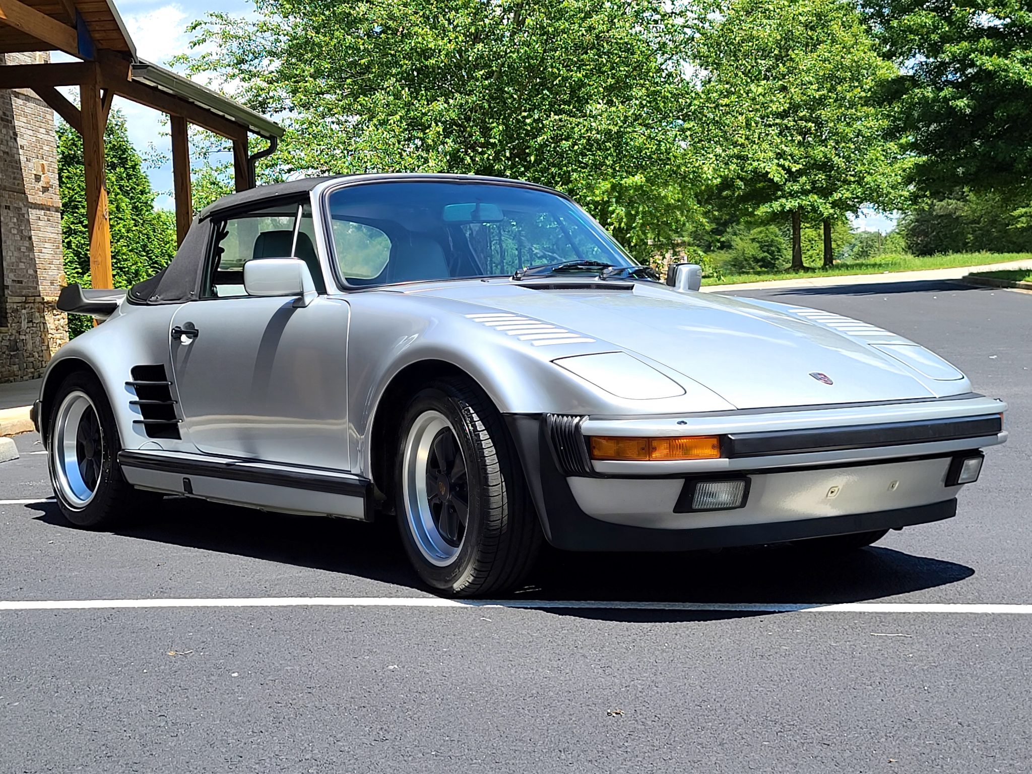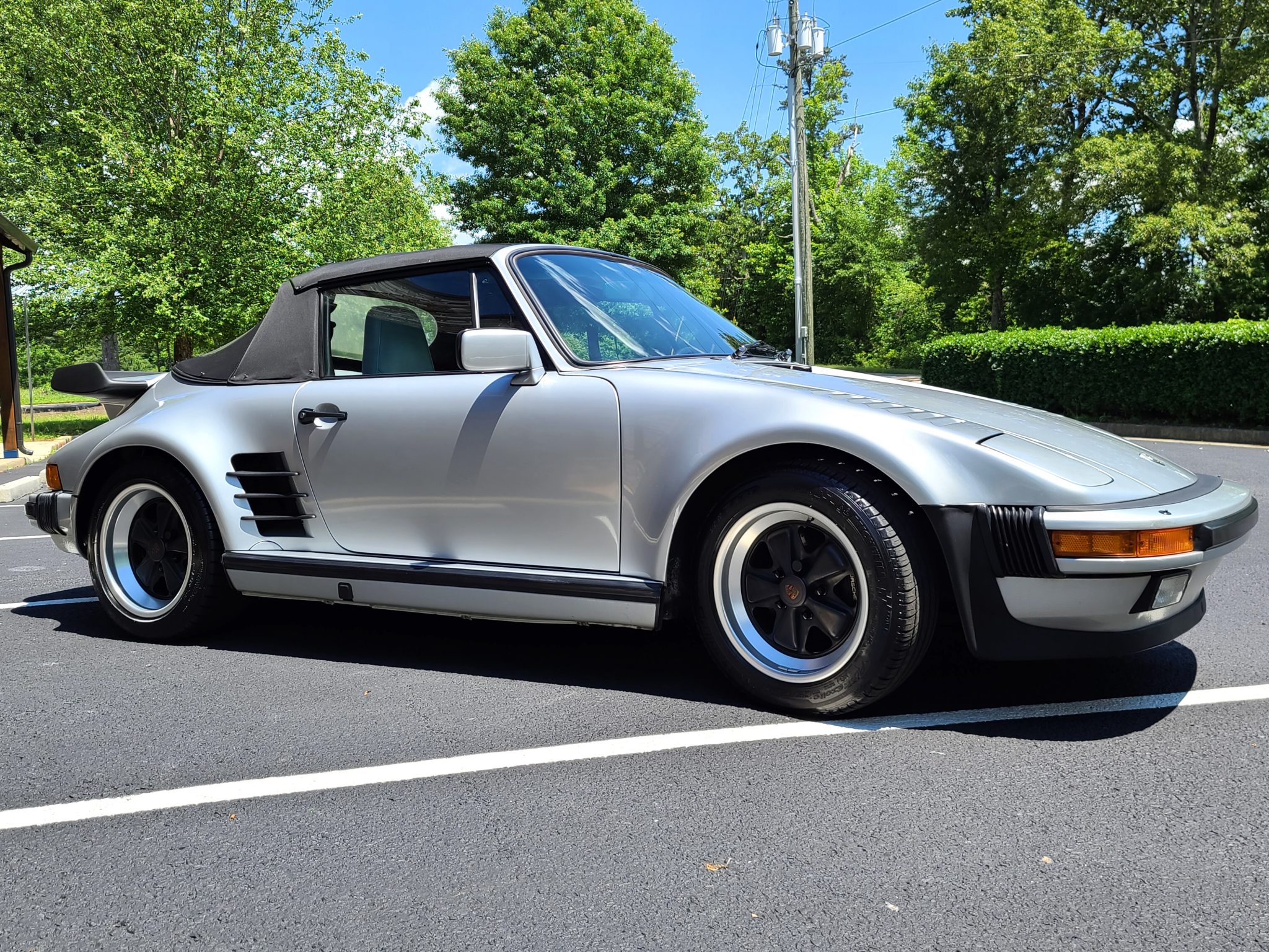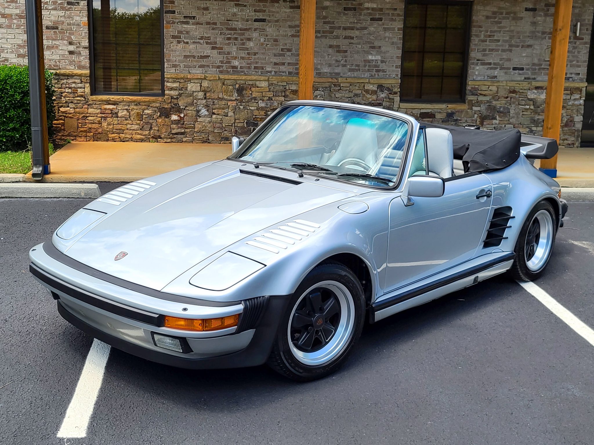 The car is equipped with a black soft top and matching boot cover. The 16″ Fuchs wheels are mounted with Michelin tires up front and Fuzion ZRi tires out back. A space-saver spare is stored in the front trunk, along with an air compressor and a tool roll. Braking is handled by four-piston finned calipers all around, which are paired with ventilated and cross-drilled rotors.