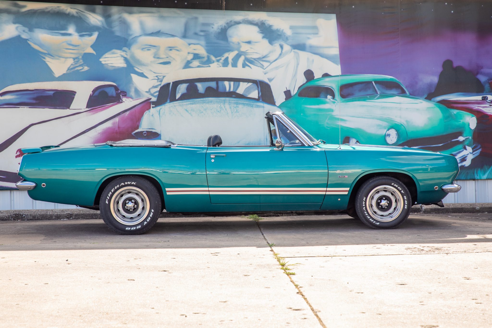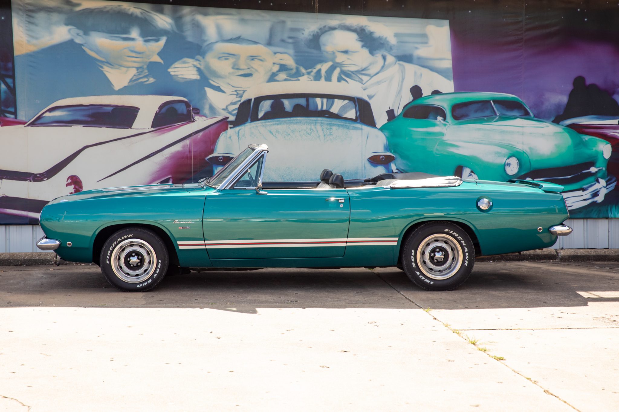 Steel 15″ Rallye wheels feature inner and outer trim rings and are mounted with staggered-width Firehawk Indy 500 tires. An older Goodyear non-radial spare is stored in the trunk.