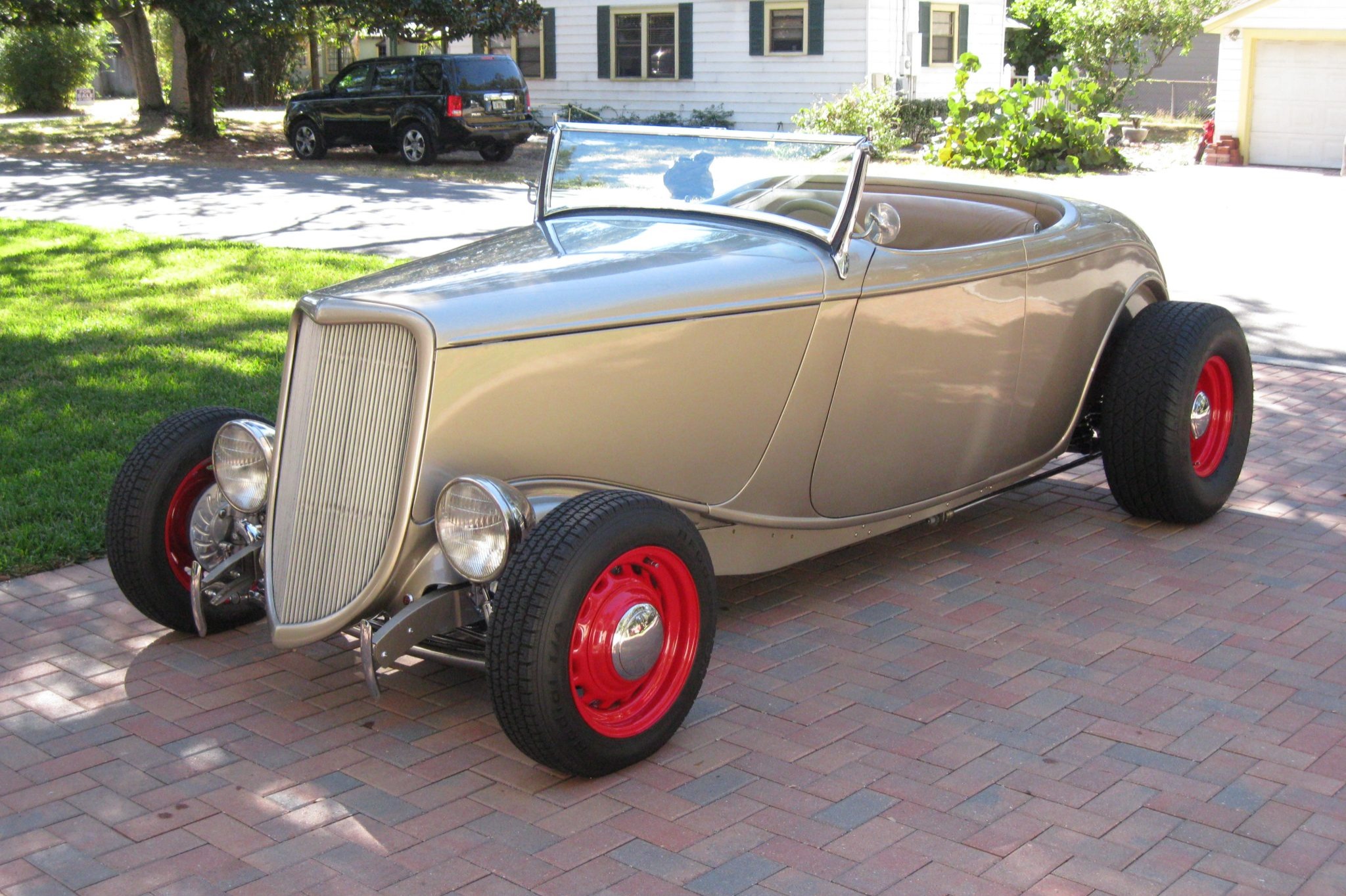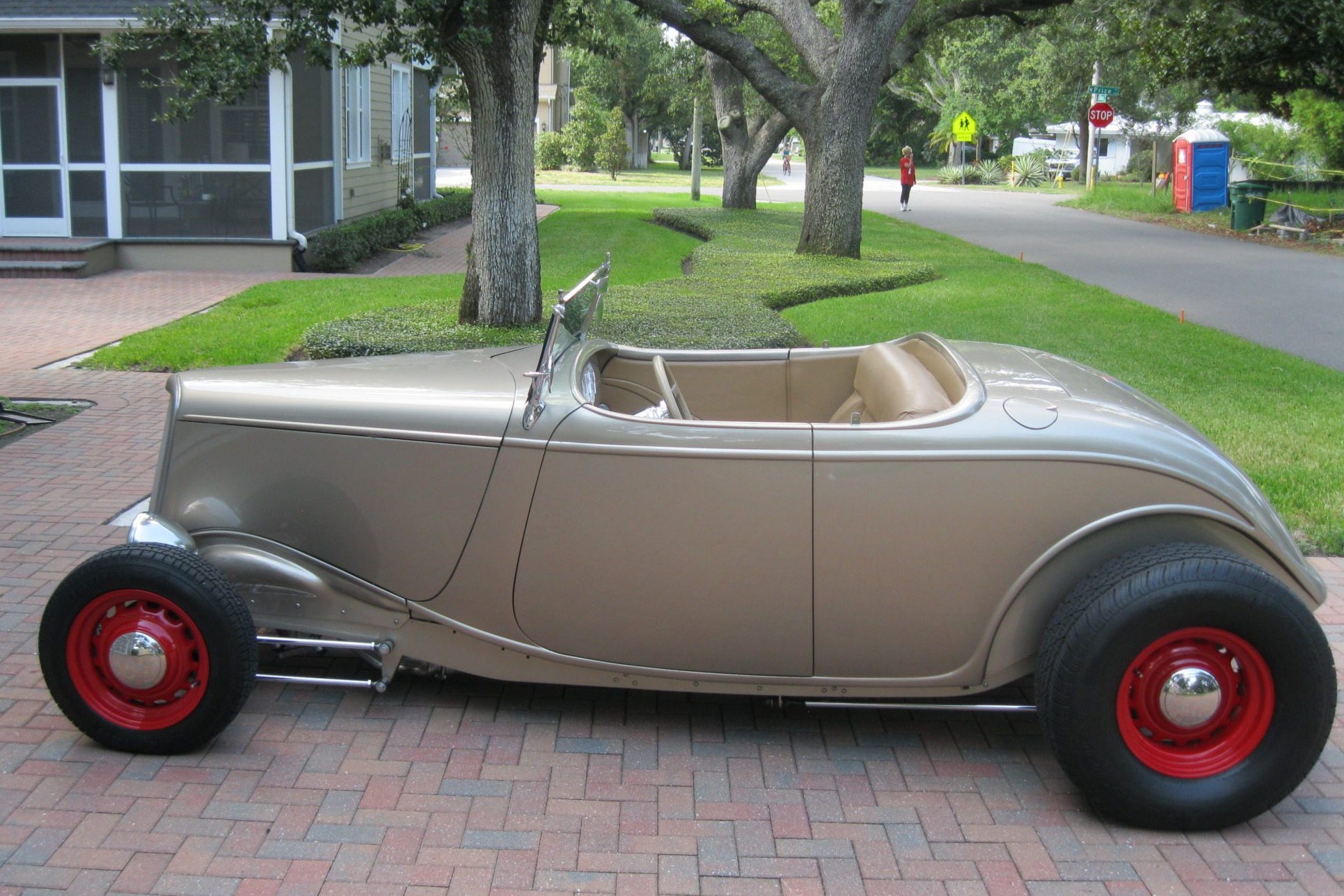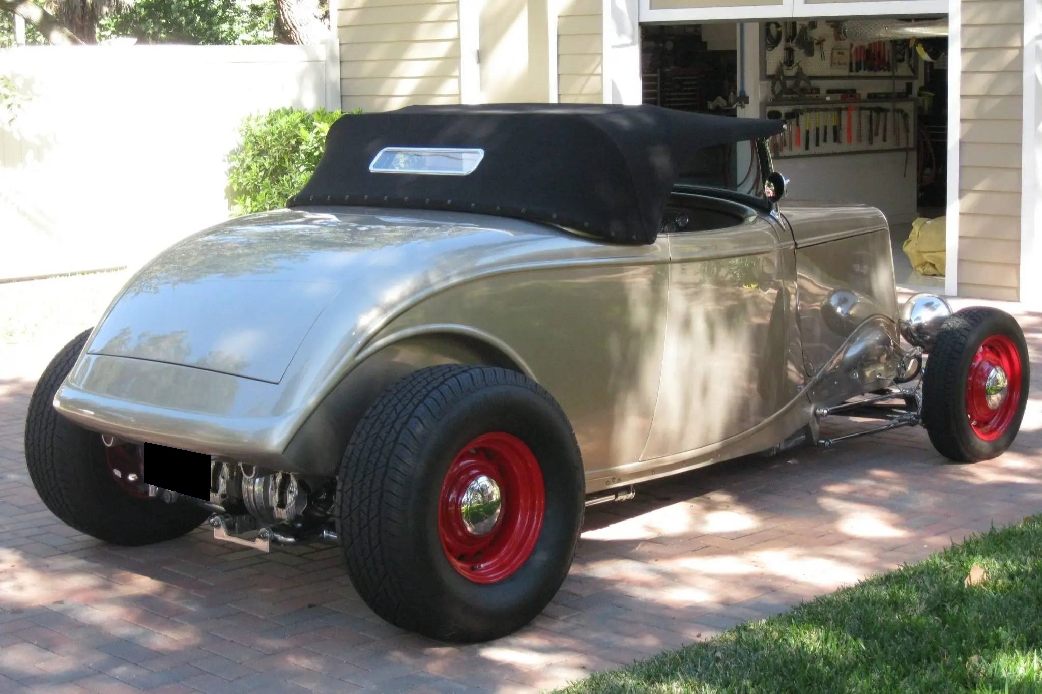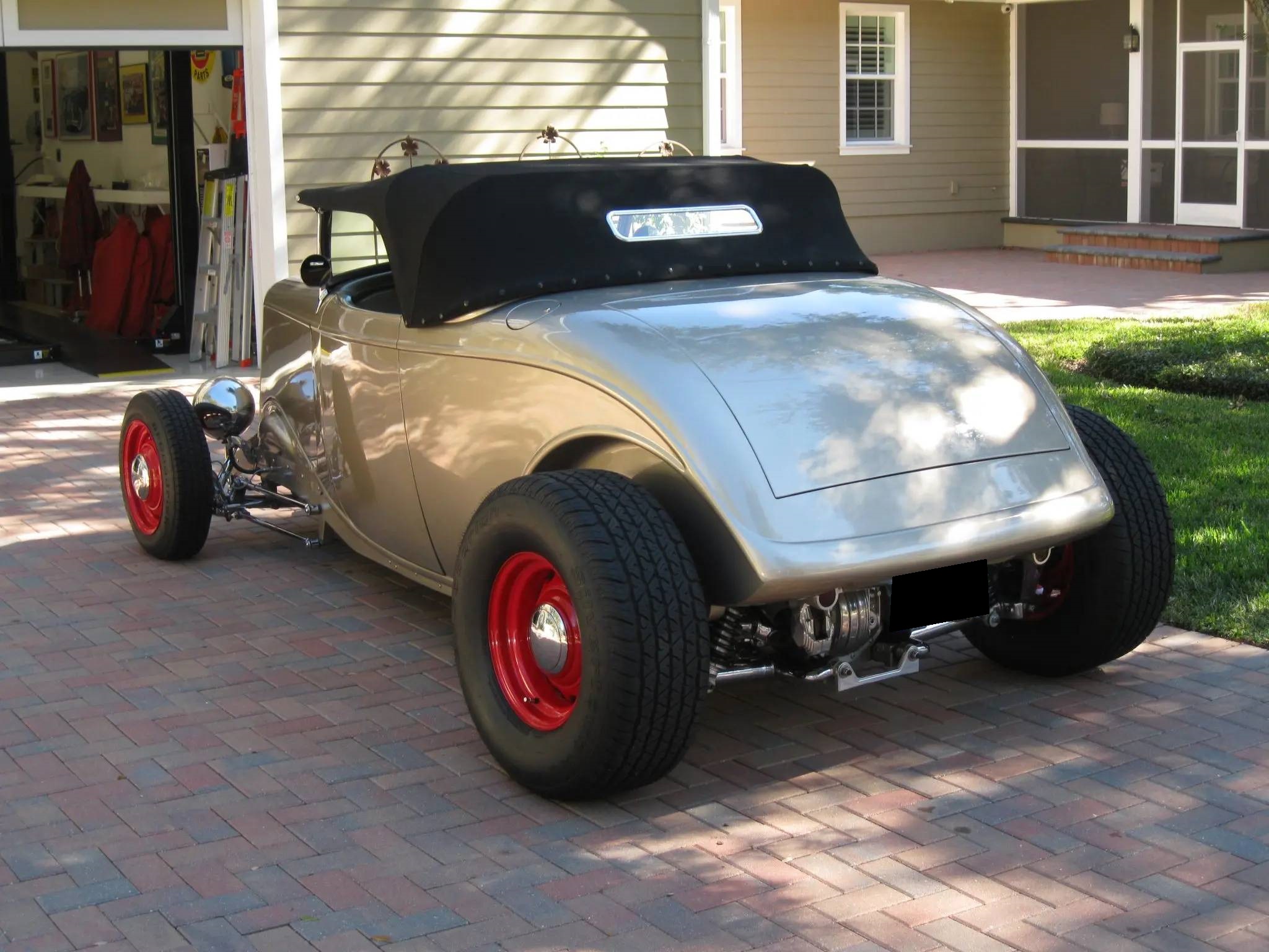 Red-painted 15” Wheelsmith Artillery wheels feature chrome hubcaps and are wrapped in BFGoodrich Radial T/A tires sized 155/80 and Coker Classic Silvertown rubber measuring 285/70 in the front and rear respectively. Braking is handled by Wilwood discs up front with inboard-mounted discs out back, and the car rides on a Super Bell tubular front axle with independent rear suspension from a 1965 Jaguar XKE.