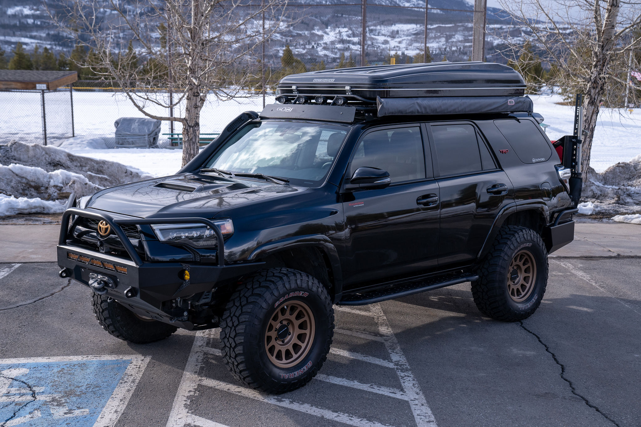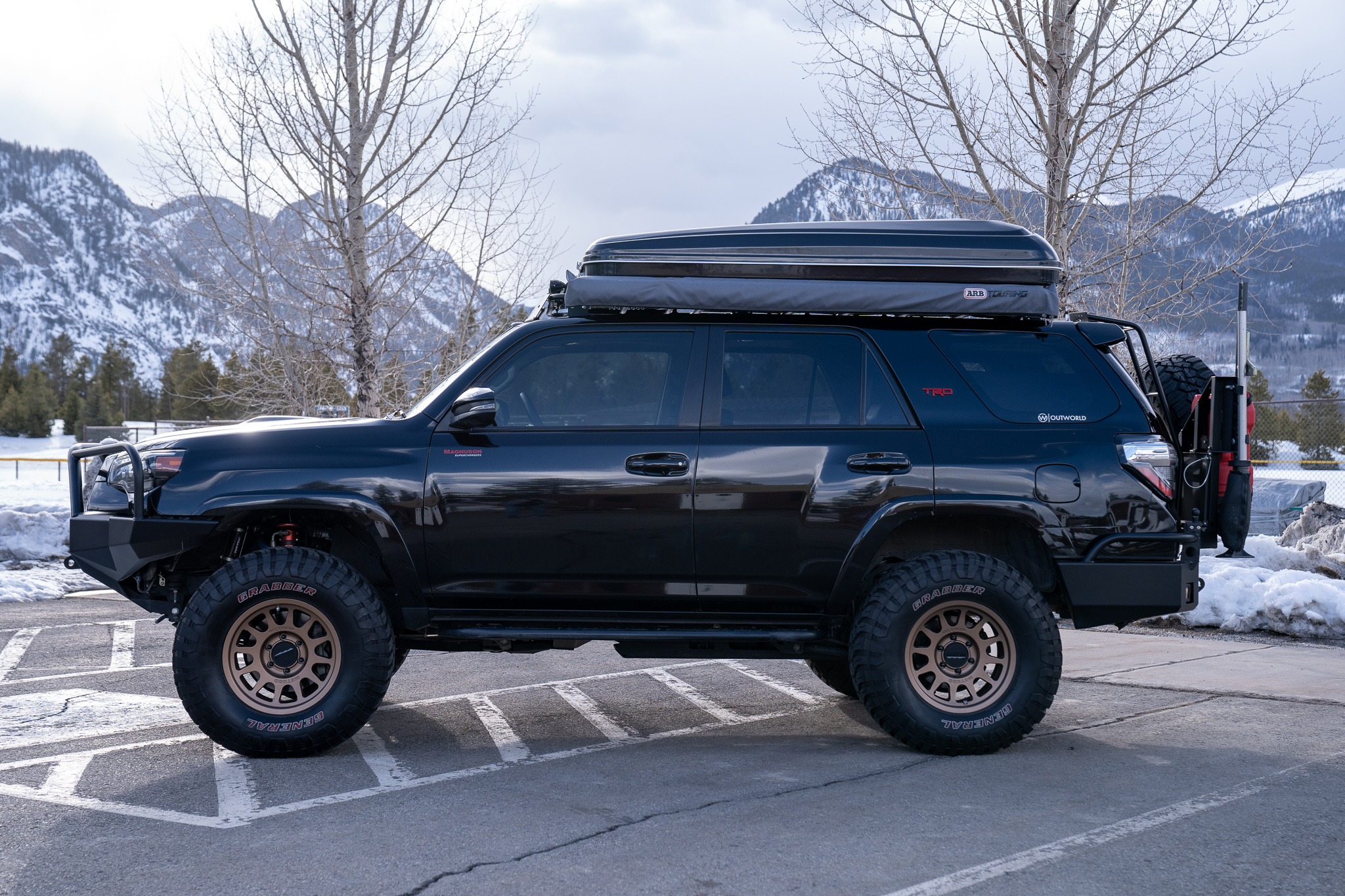 Bronze-finish 17″ Method Race wheels wear 35×12.5″ General Grabber mud-terrain tires, and a matching spare is mounted to a swing-out carrier at the rear along with a Hi-Lift jack and two RotopaX fuel containers. Suspension modifications include Total Chaos control arms, DuroBump front and rear bump stops, and Toytec Lifts coilover suspension with remote-reservoir front shocks. The truck is equipped with A-TRAC traction control and CRAWL control.