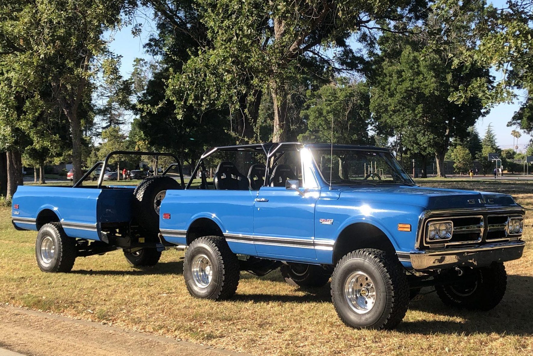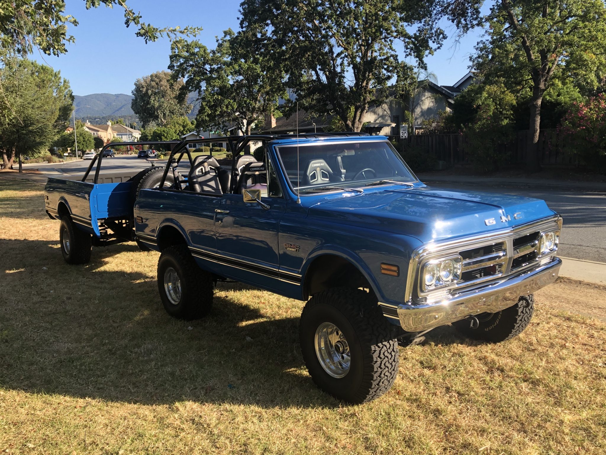 Polished Weld Super Single six-lug wheels are mounted over manually-locking hubs up front and wear BFGoodrich All-Terrain T/A KO tires, including on the included trailer. Moser axles are installed, along with a 6″ Skyjacker Softride lift kit. Braking is handled by front discs and rear drums.
