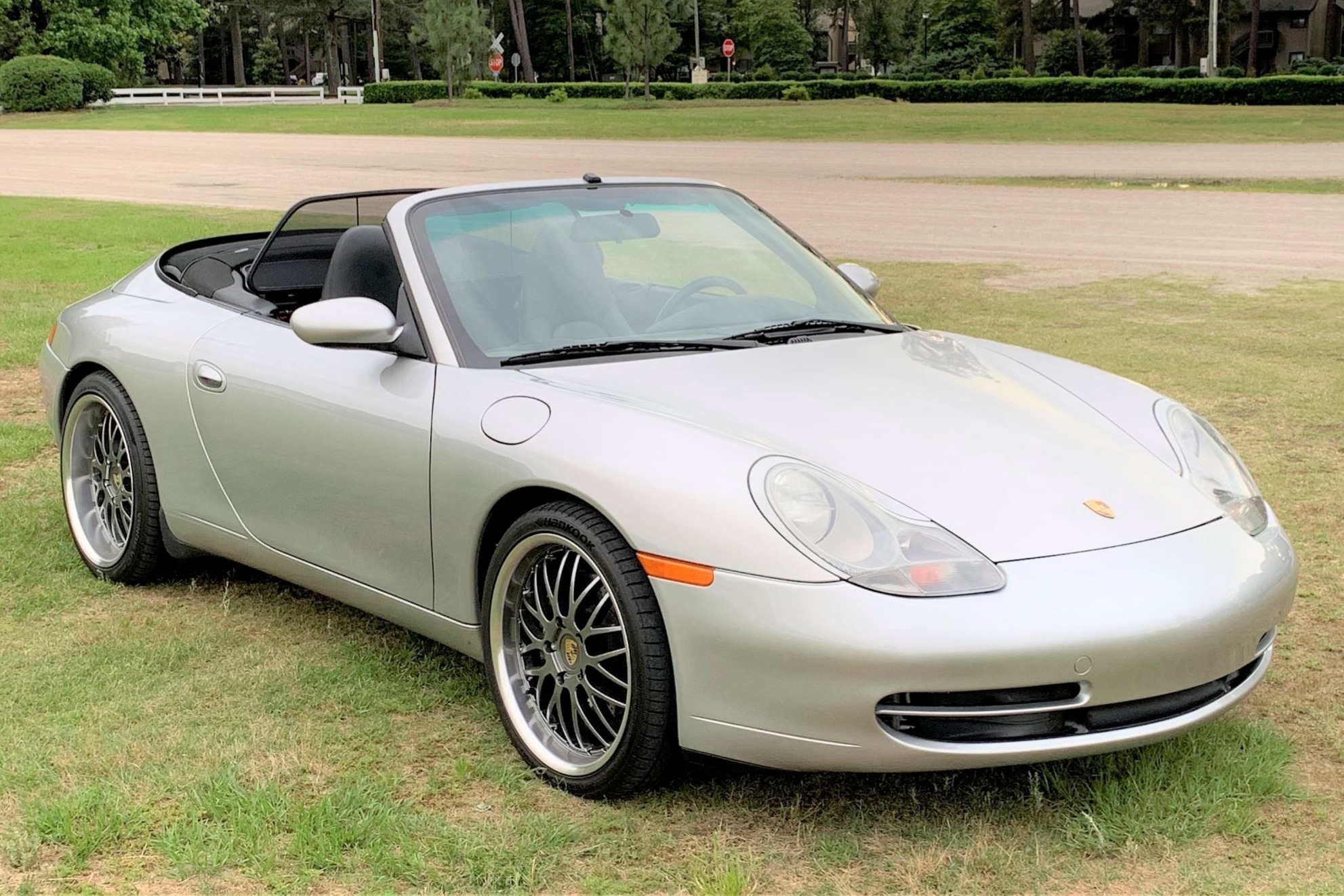 A body-colored hard top is shown fitted above. Factory alloys are replaced by 19″ aftermarket wheels that are wrapped in Hankook Ventus V12 evo2 tires sized 245/35 front and 275/35 rear. The brakes utilize Porsche-branded calipers and drilled/ventilated rotors all around. The seller states the brake pads were replaced in October 2019.
