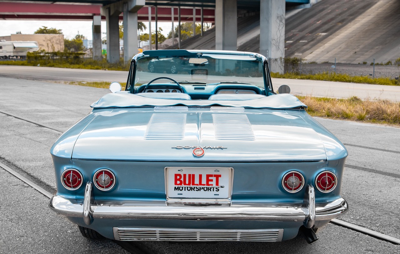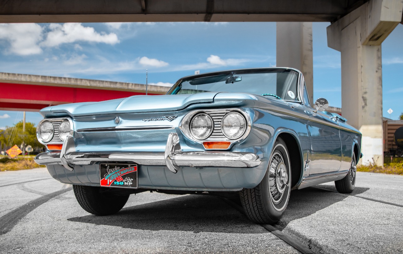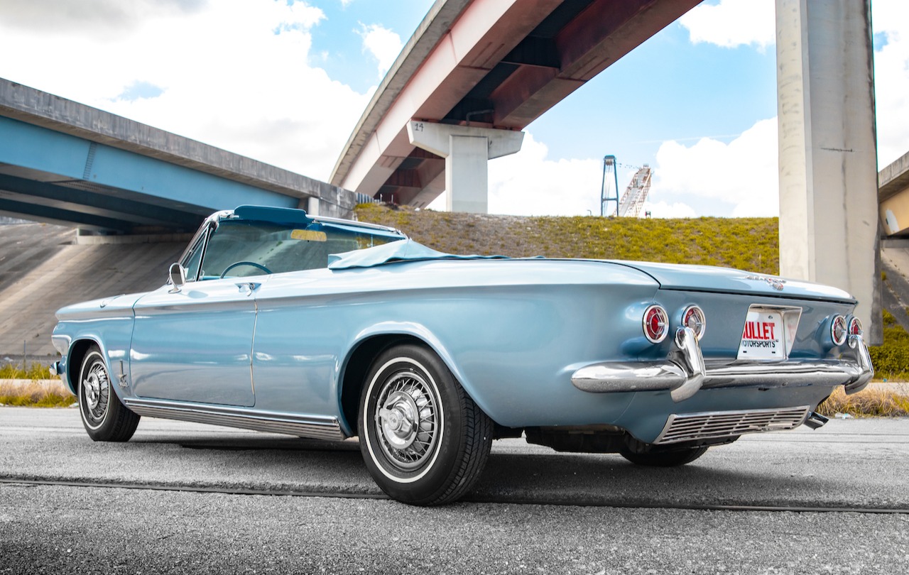 Steel wheels with faux wire covers wear 185/80-13 Firestone FR380 whitewall tires. Factory equipment includes four-wheel independent suspension as well as drum brakes at each corner.