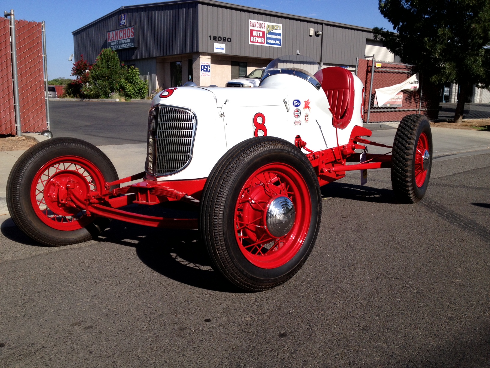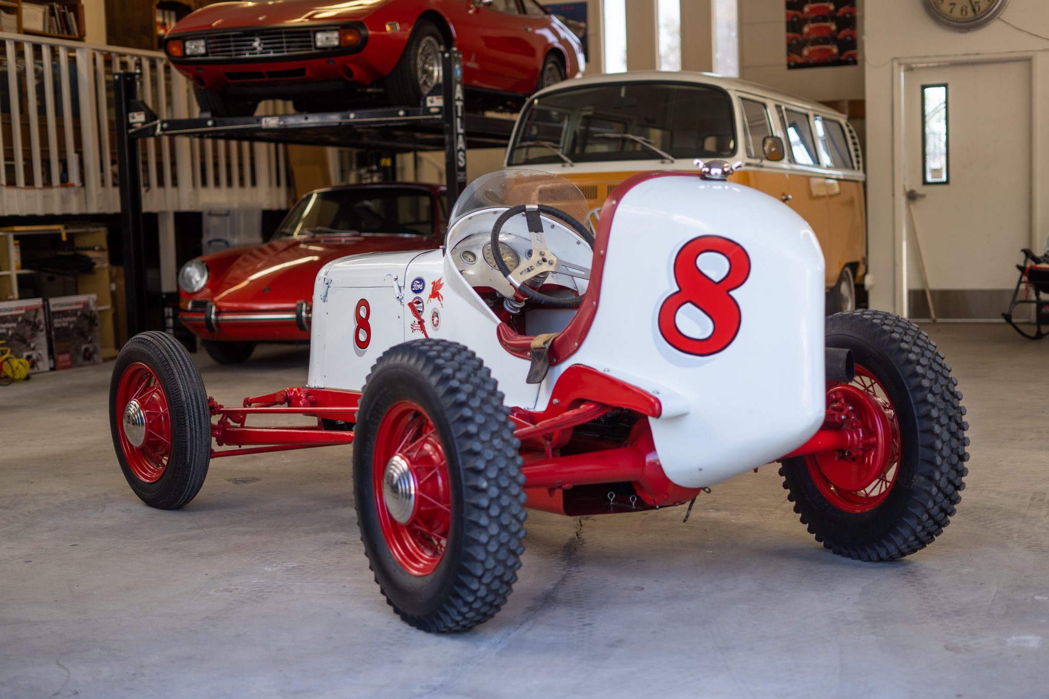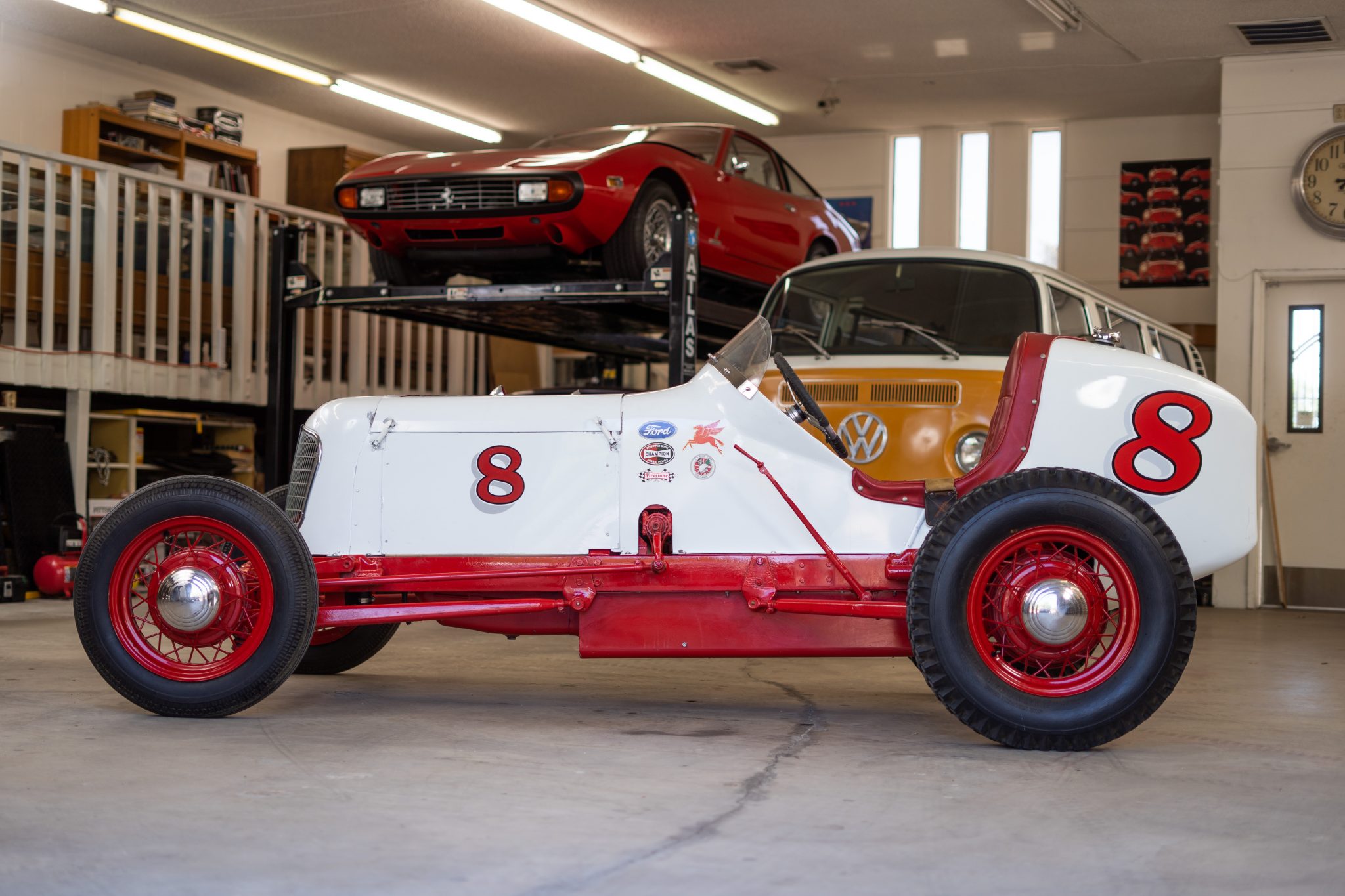 16″ 1935 Ford wire wheels wear Commander polyester four-ply tires on the front and knobbed Allstate Super Traction Grip tires on the rear, and the seller notes that all are cracked. Braking is via mechanical drums at the rear controlled by a hand lever on the left side of the body, and the suspension utilizes transverse leaf springs paired with Delco Lovejoy lever-style shocks front and rear.