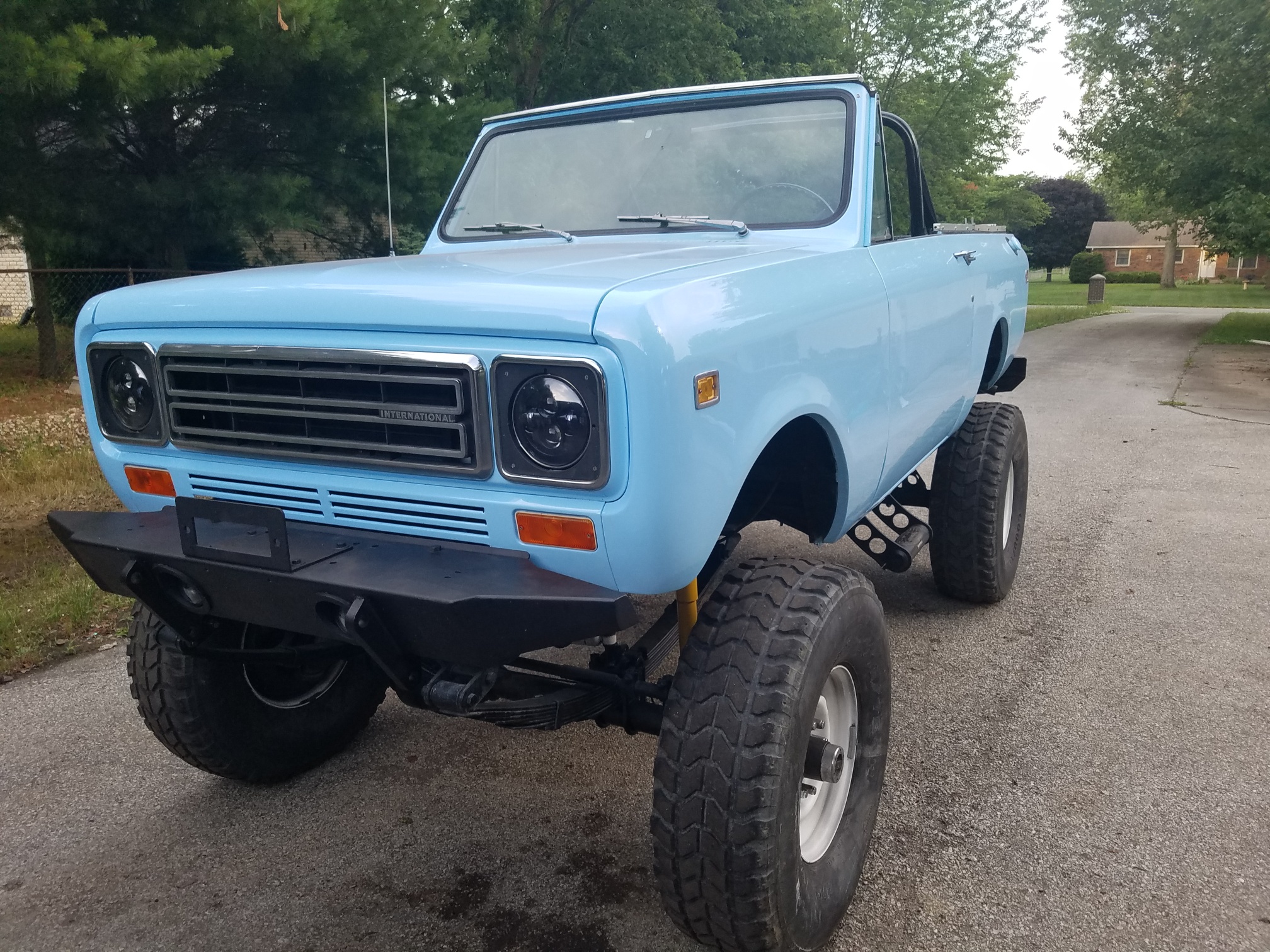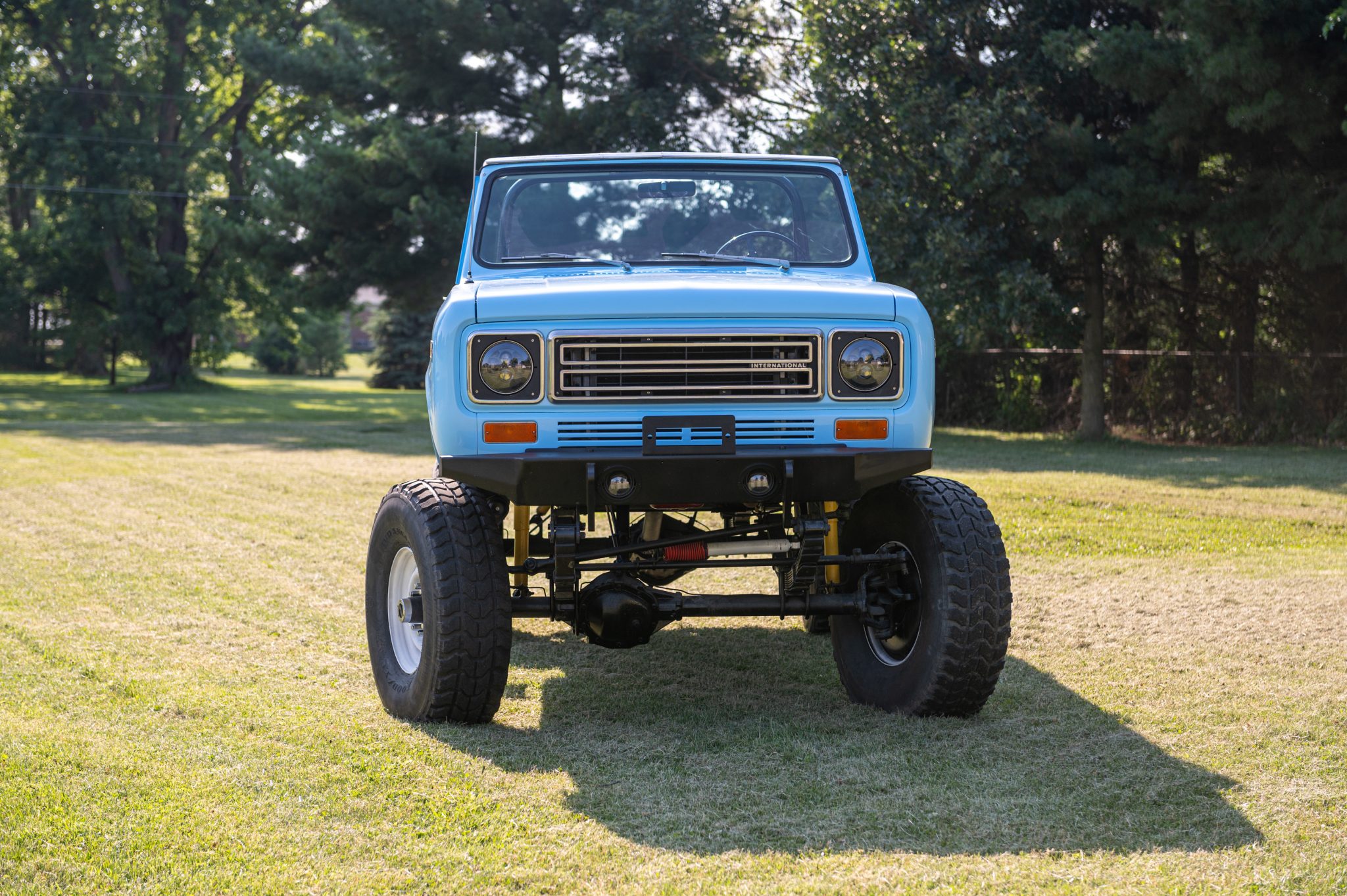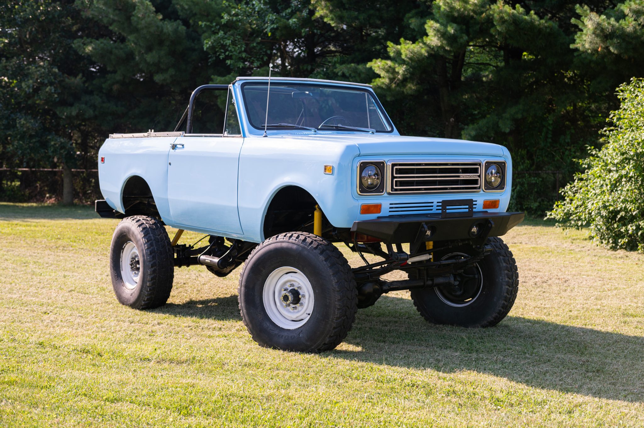 The 16.5″ steel wheels are finished in white and wear 37×12.5″ Goodyear Wrangler MT tires. The elevated ride height was achieved with custom leaf springs and aftermarket struts all around. A high steer kit and Rancho steering dampener have also been added, and the front axle is equipped with manually-locking hubs. The seller states that the brake master cylinder, hard lines, wheel cylinders, calipers, pads, drums, and shoes were replaced during the refurbishment. A spare wheel mounted with a 37″ tire is included in the sale.