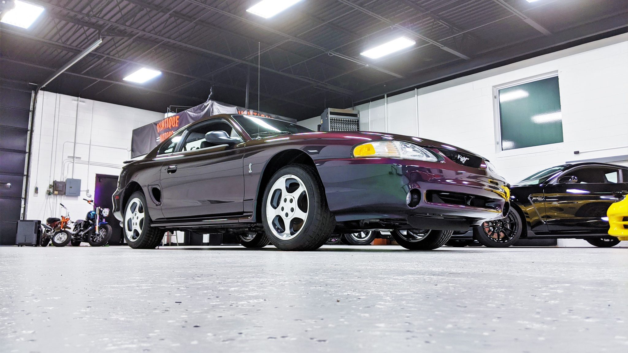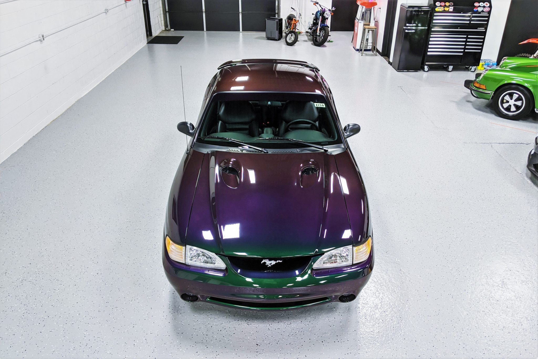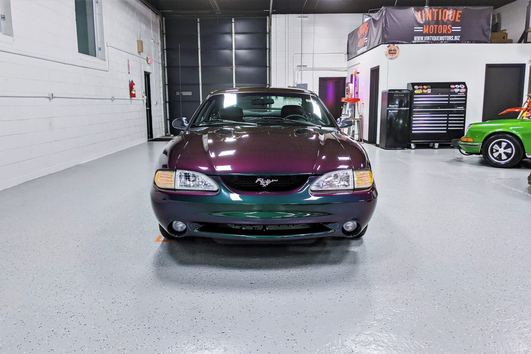 The 17″x8″ alloy wheels wear older BFGoodrich Comp T/A tires. The SVT Cobra included 13″ rotors up front with twin-piston calipers, and 11.65″ rotors out back with single-piston calipers. Equipment also included a stiffened suspension with variable-rate springs and gas pressurized shocks and struts, as well as anti-sway bars measuring 29mm up front and 27mm out back.
