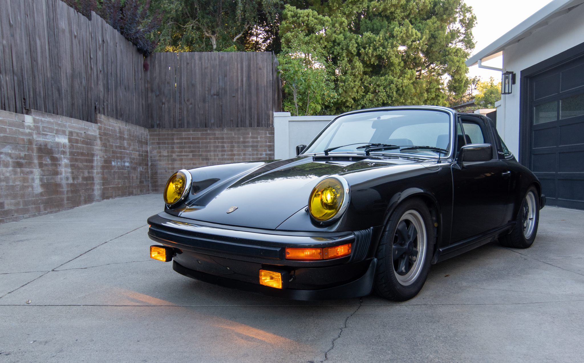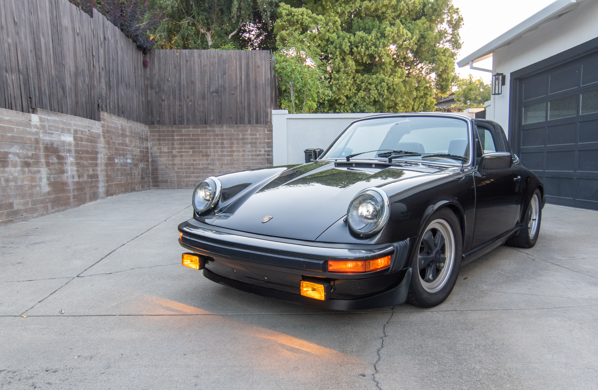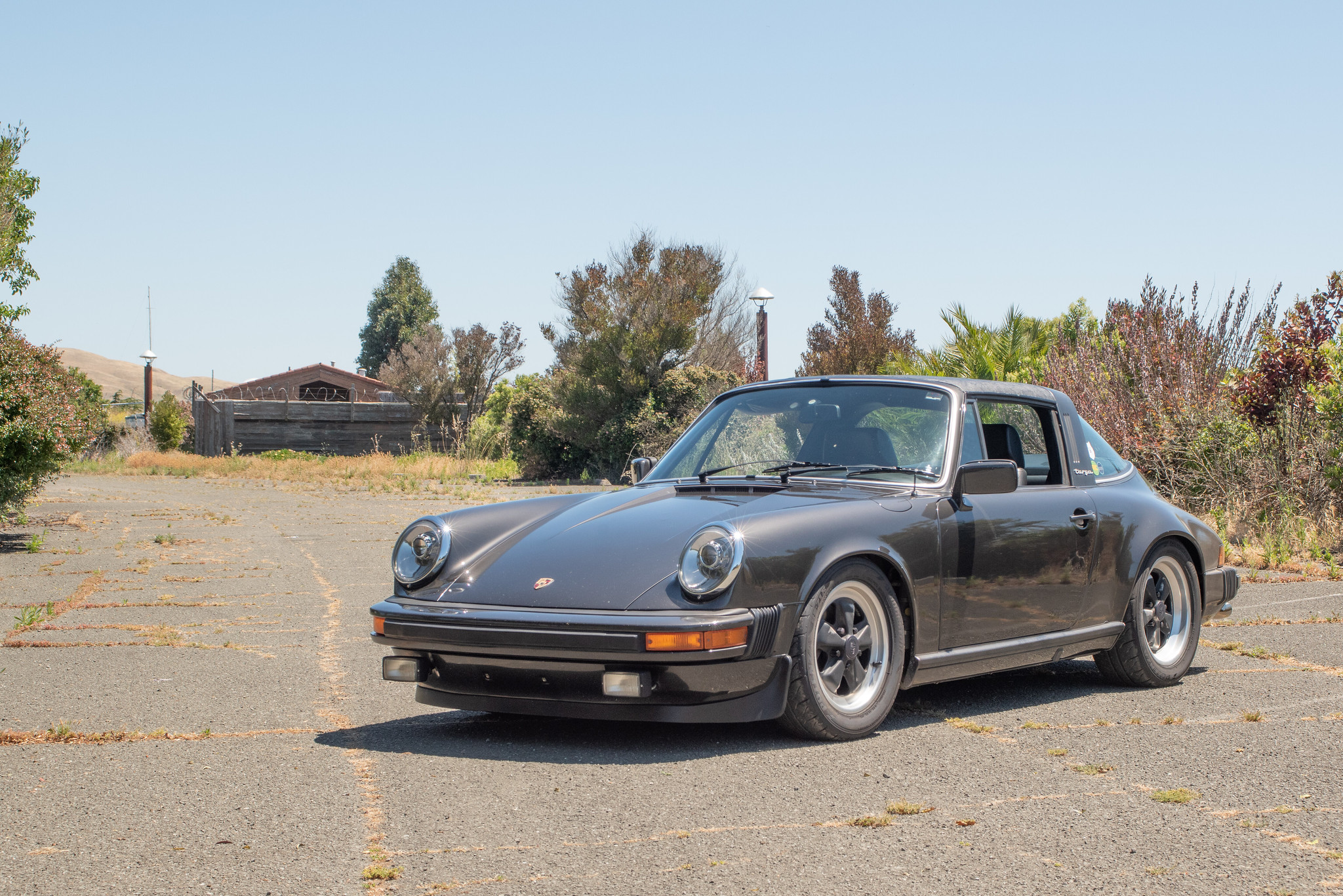 Staggered-width 16″ Fuchs wheels with worn black centers and polished lips are fitted with Bridgestone Potenza RE-71R tires that show date codes from 2018. The car features a lowered ride height that was achieved by adjusting the factory torsion bars.
