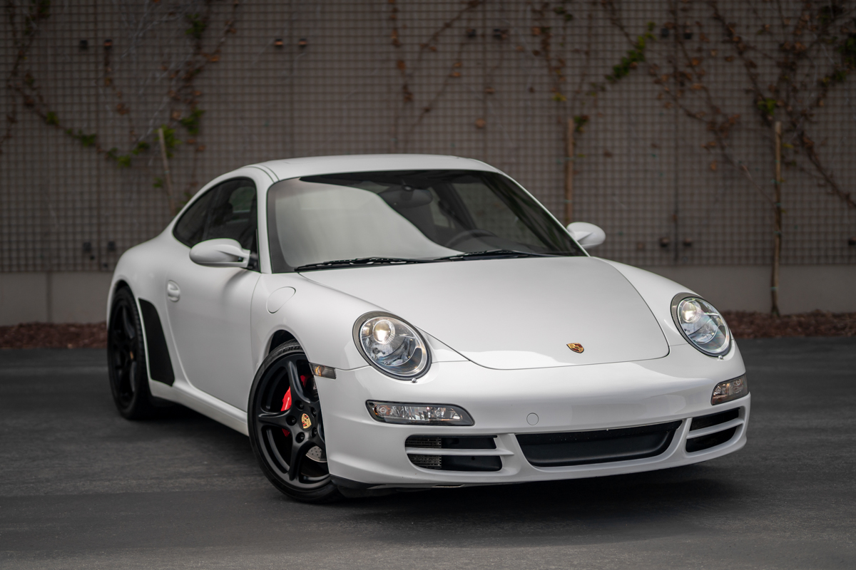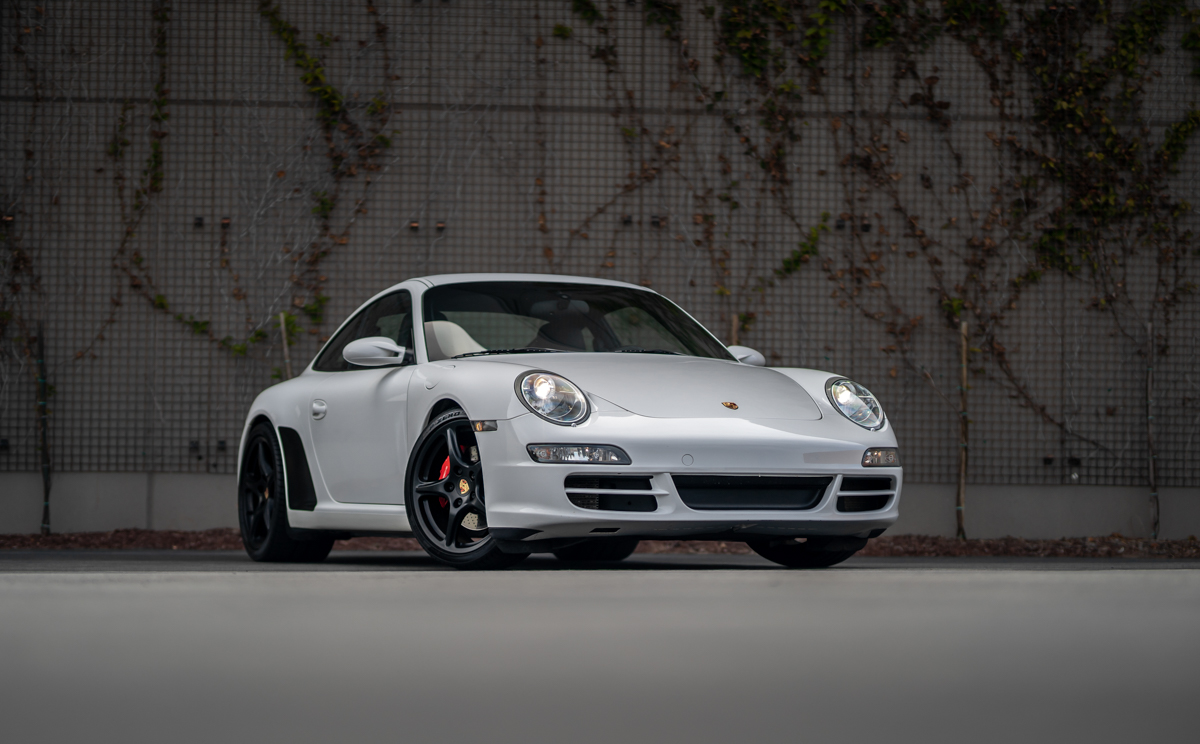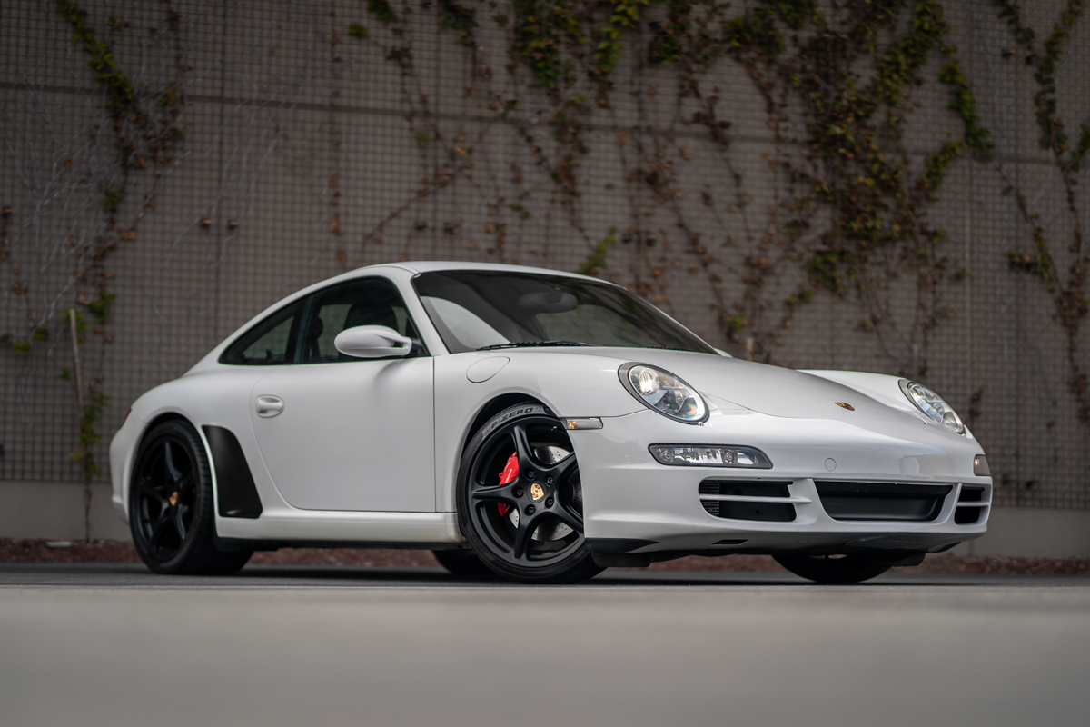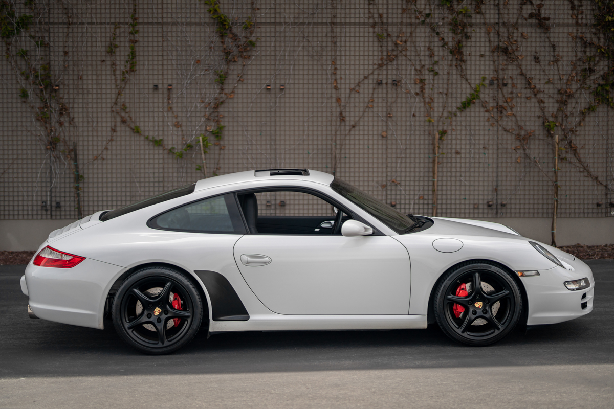 The 19″ wheels are powder-coated black and wear 235/35 front and 295/30 rear Pirelli P Zero tires. Braking is from red Porsche-branded calipers and drilled rotors. The suspension has been modified with Eibach lowering springs and wheels spacers.