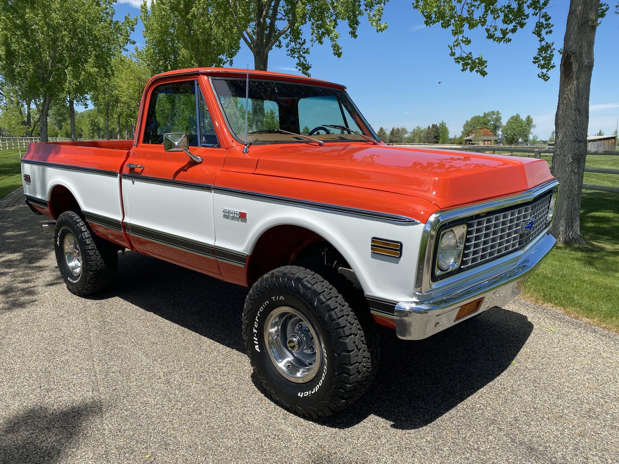 The bed has been fitted with wooden slats separated by stainless steel runners. Painted 15″ steel wheels wear beauty rings and 33″x12.5″ BFG00drich All-Terrain T/A KO2 tires. The ride height has been raised approximately 2.5″ using Rough Country suspension components. Braking is from power-assisted front discs and rear drums.