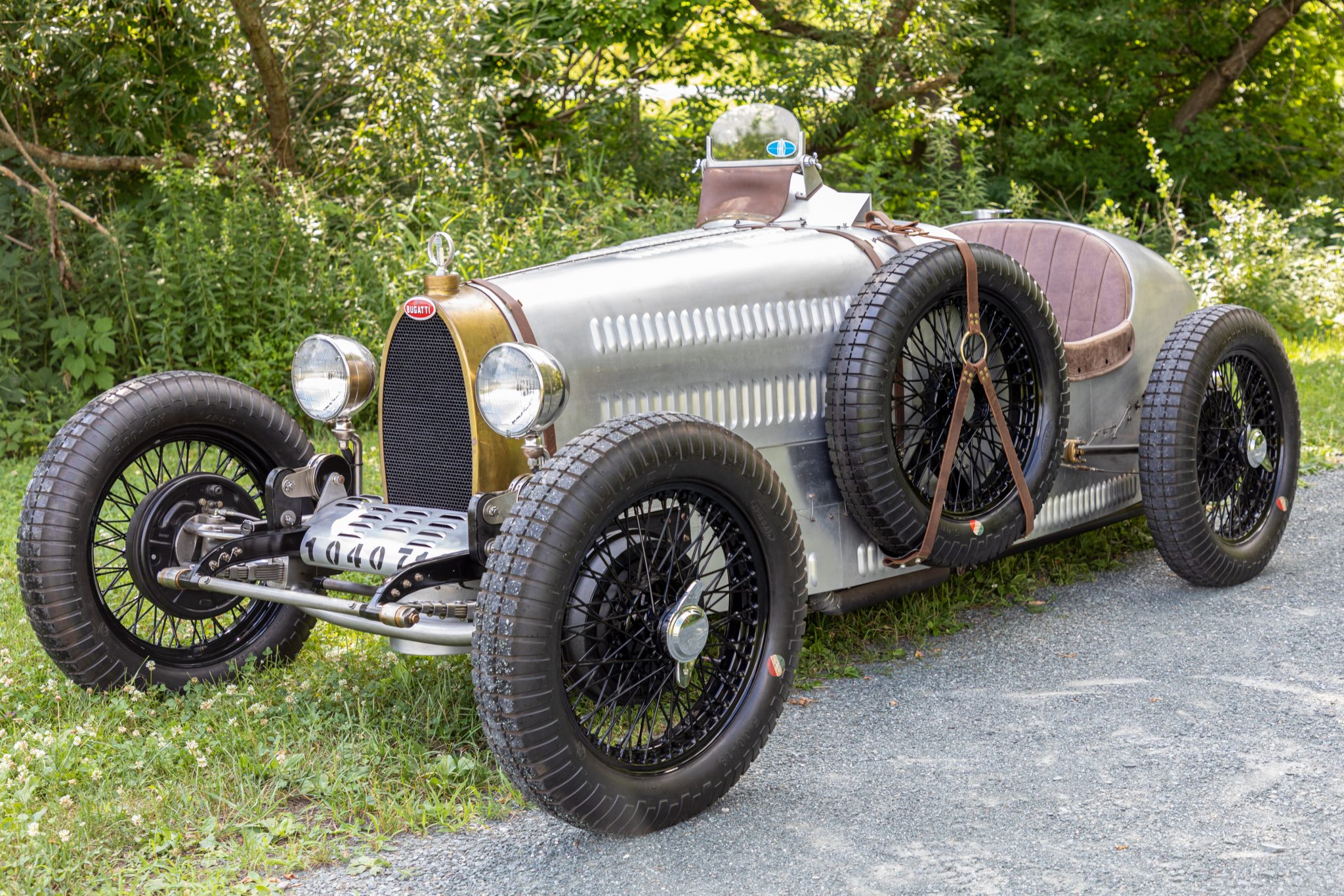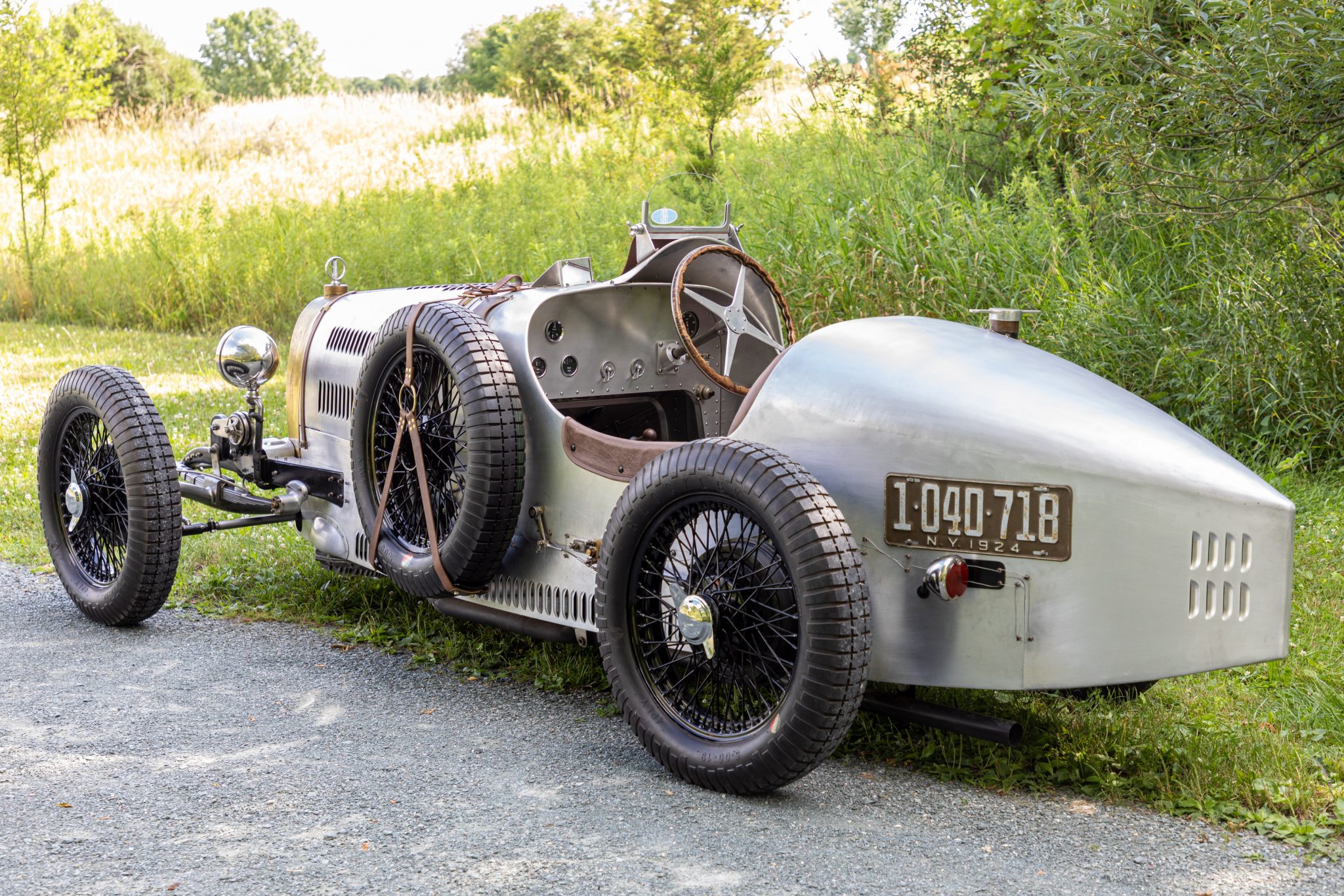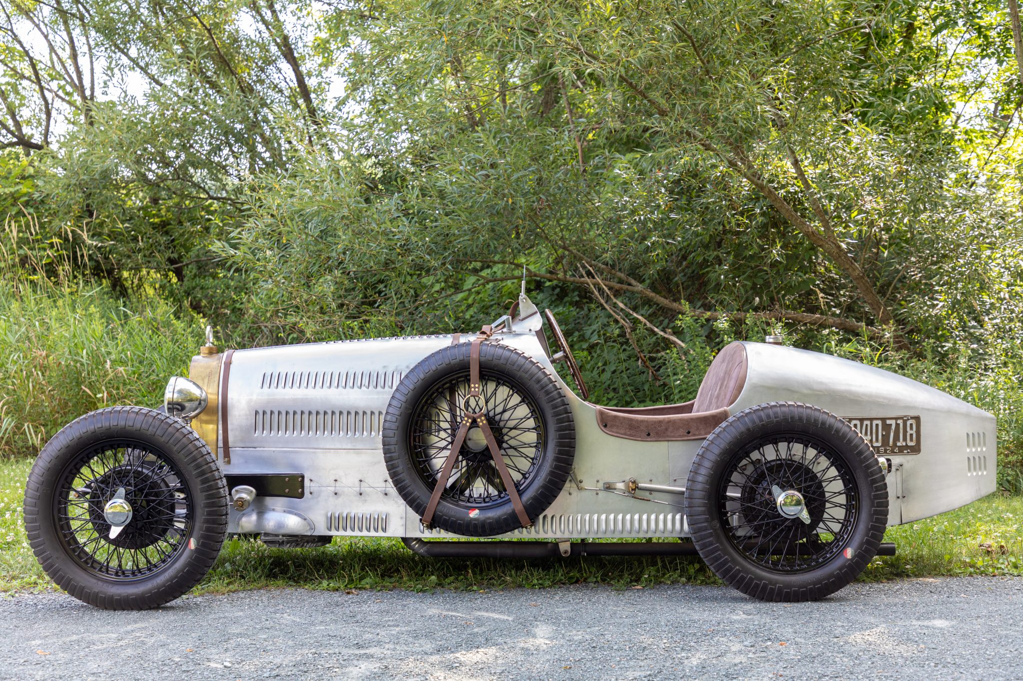 A Type 35 chassis was replicated by the seller using a CAD system to laser-cut frame sections based on factory drawings. Aluminum body panels were then hand-formed to recreate factory bodywork, including a louvred hood, boattail rear section, and horseshoe-shaped radiator with a honeycomb grille. The latter was also fabricated by the seller, though the brass radiator cap, aluminum Bugatti emblem, and thermometer were sourced from the Bugatti Owners Club in the UK. The single windscreen is said to be an original Brooklands part. A combination of original and BOC reproduction fasteners were utilized, including original-style external safety-wire screws. Headlights and brake lights have been added, though the seller notes they can be removed for a Grand Prix look.