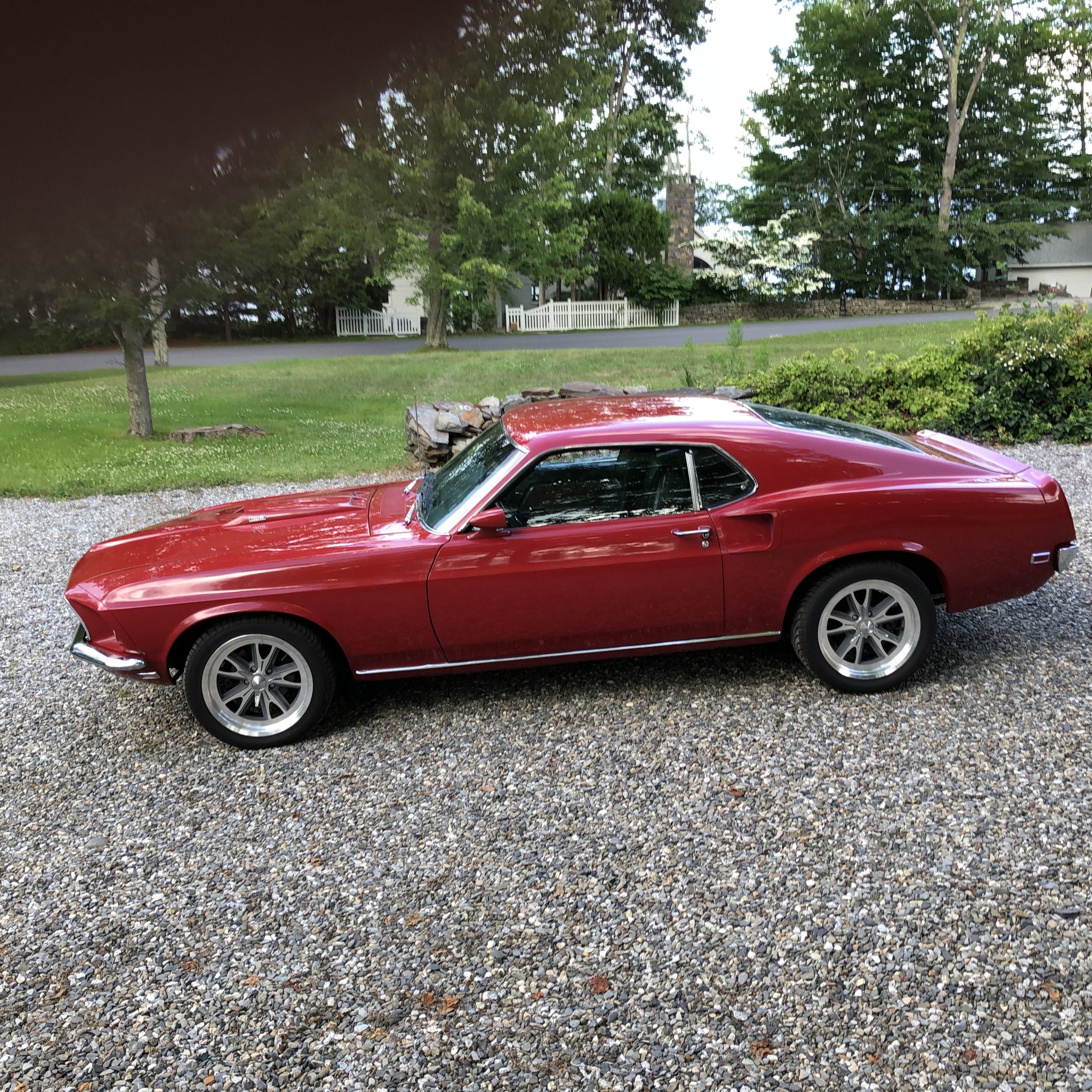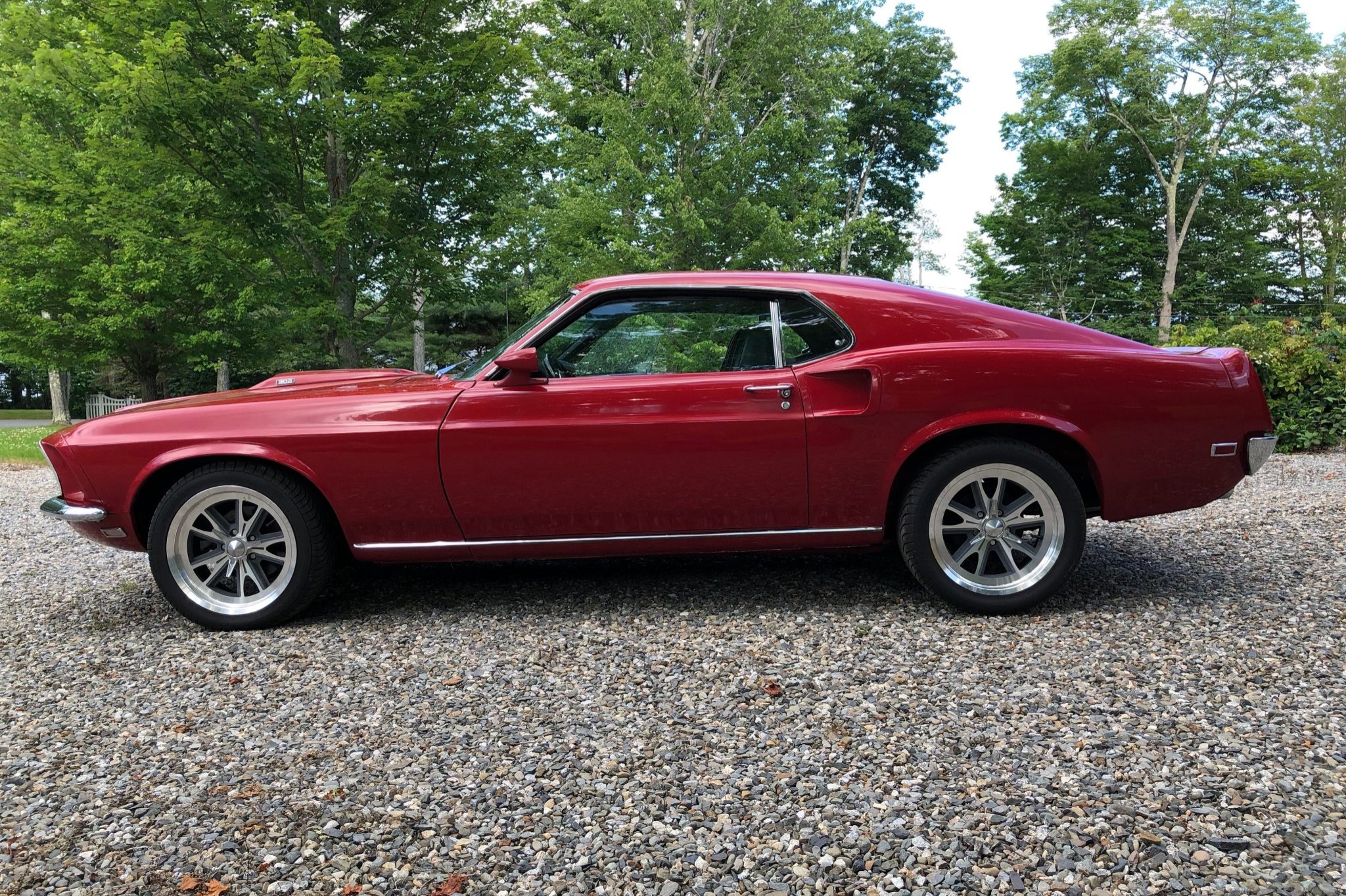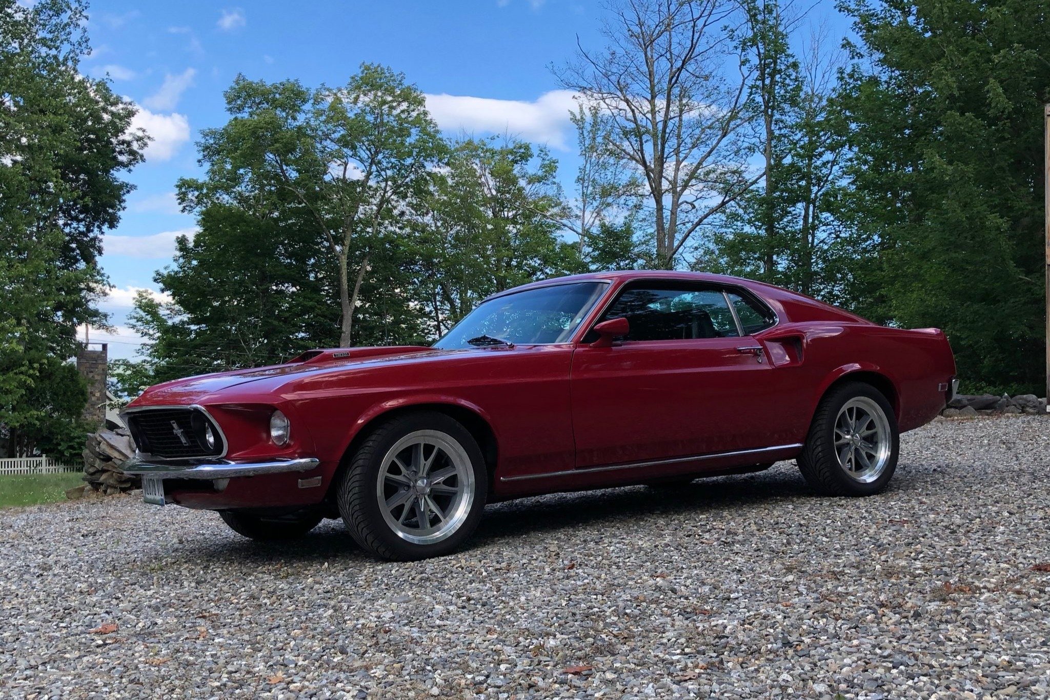 The 17” Halibrand-style wheels feature faux knock-off spinners and are wrapped in Sumitomo HTRZ tires sized 245/45. The seller notes that the front disc and rear drum brakes were overhauled during the refurbishment, along with the front suspension. A replacement rack-and-pinion power steering rack is also noted by the seller.