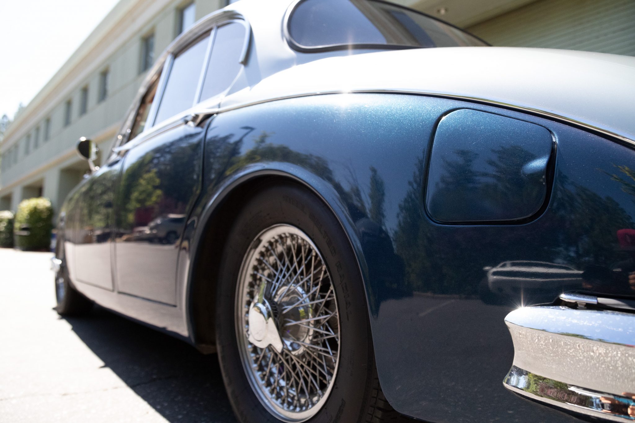 Chrome-finished 15″ wire wheels with knock-off spinners wear a mixed set of older Cooper and Road King tires which should be replaced according to the seller. The brake system consists of four wheel discs with a Wilwood brake master cylinder and chrome-plated internal hardware. Koni shocks have been fitted out back, and the seller notes that the wheels are in need of truing and that some of the spokes are broken.