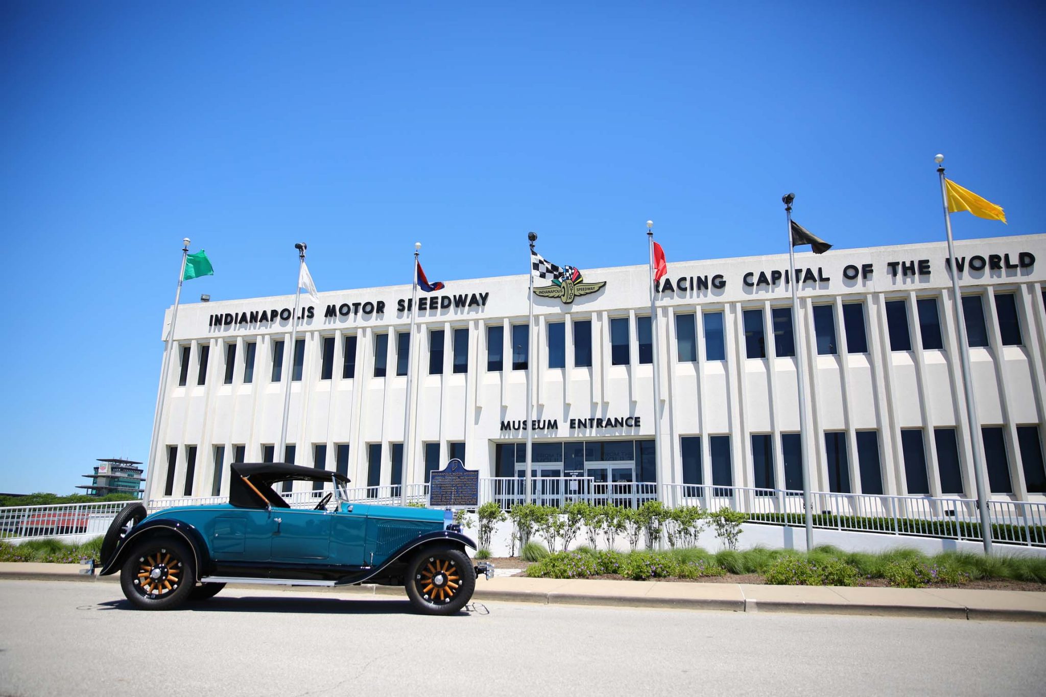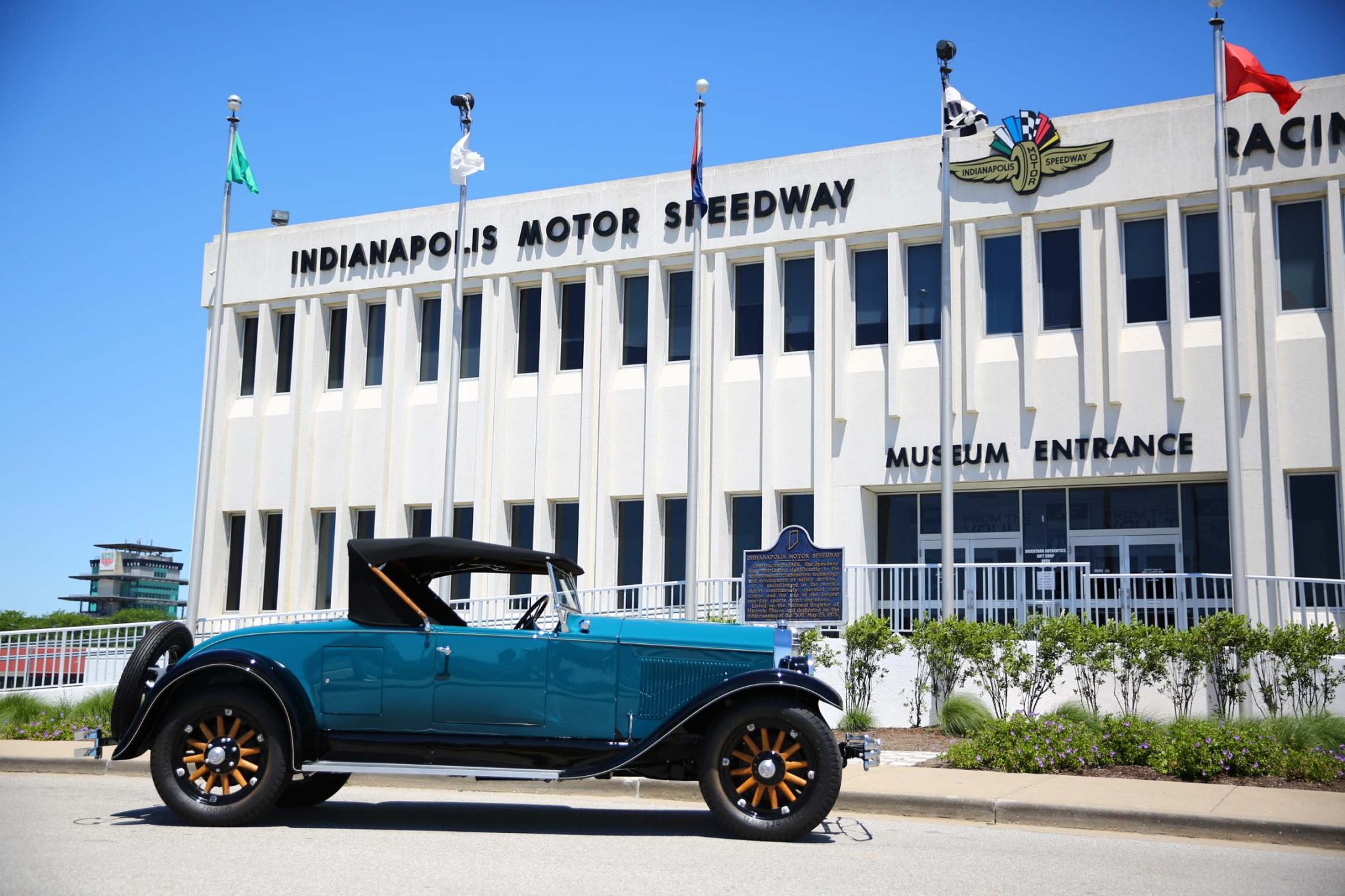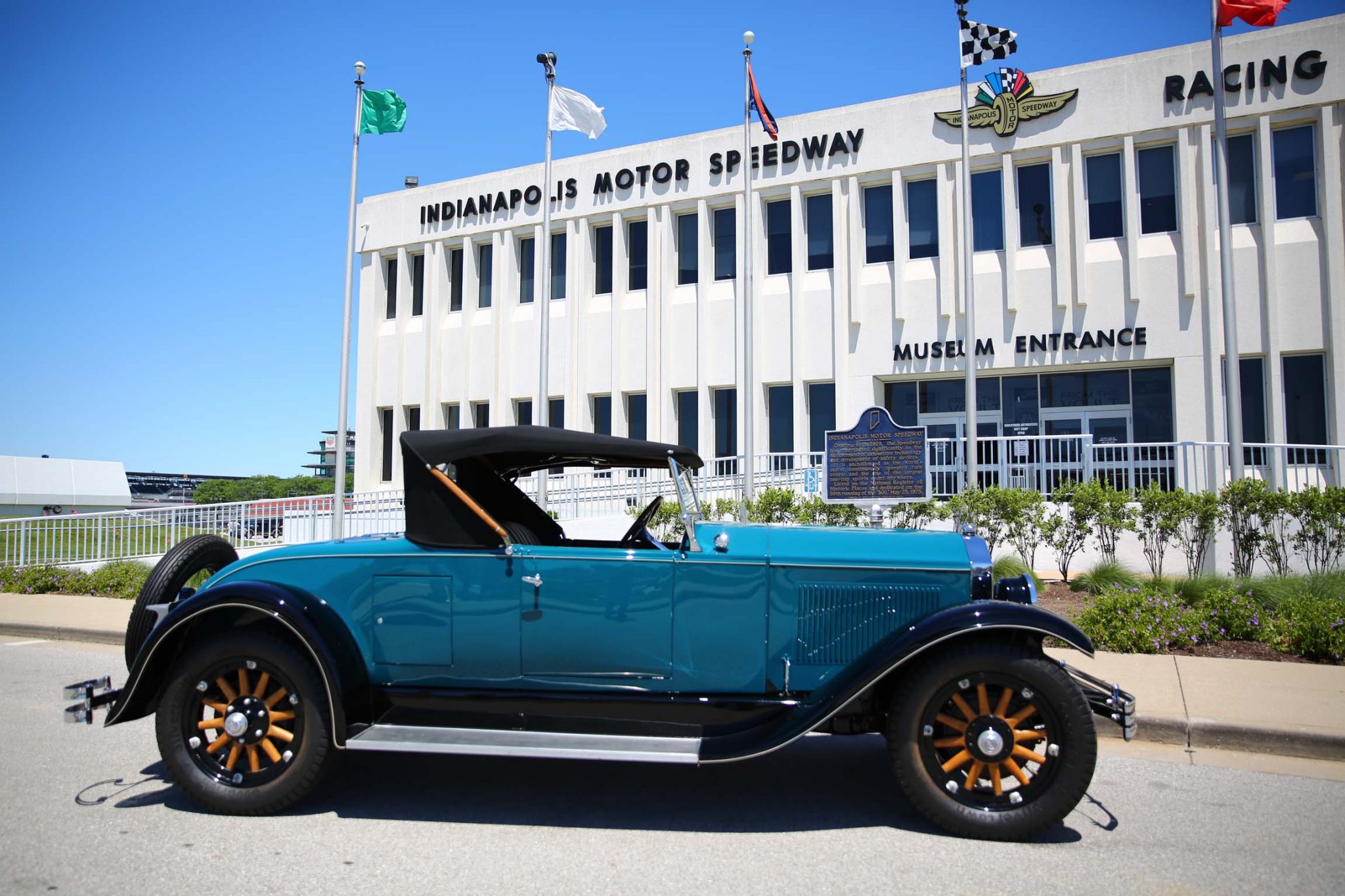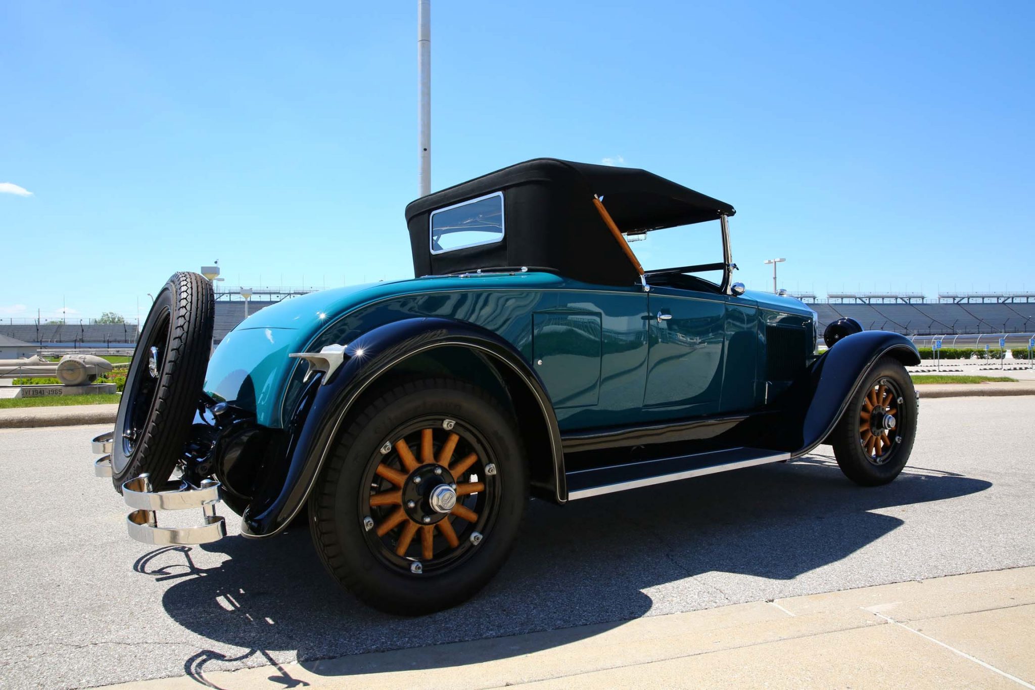 The black soft top features a wood frame and glass rear window. The 21″ wood-spoke wheels are mounted with Goodrich Silvertown six-ply tires, and a spare wheel rim with a matching tire is mounted out back. Braking is handled by mechanical drums at all four corners.