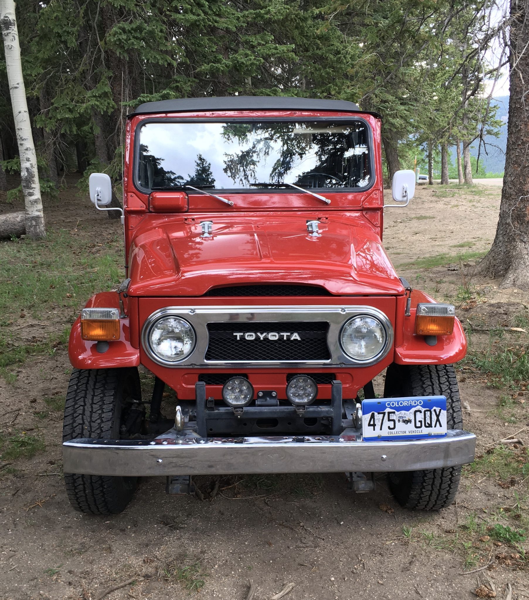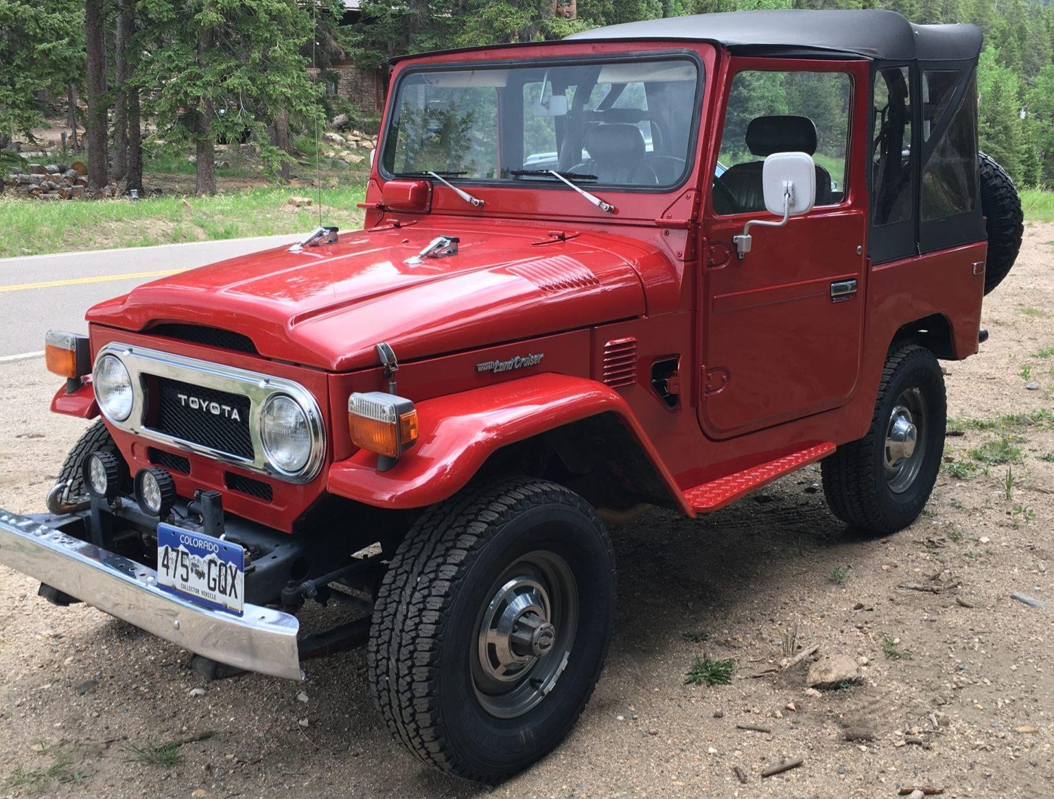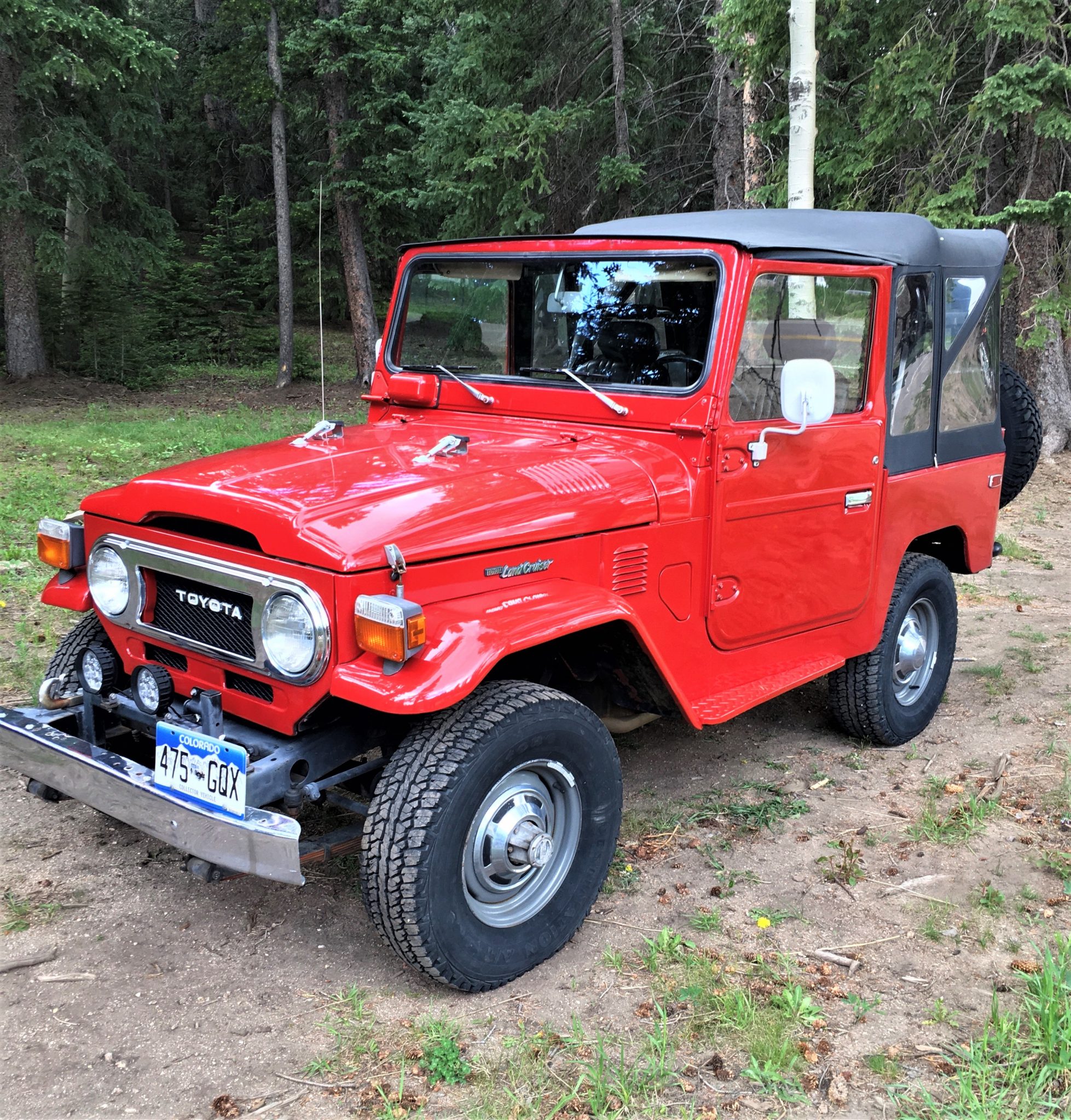 Gray-painted 15″ steel wheels are mounted with 30″x9.5″ Firestone Destination all-terrain tires, and manually locking hubs are equipped up front. A spare tire is affixed to a swing-away carrier at the rear and a black Bestop soft top with vinyl windows was installed during previous ownership.