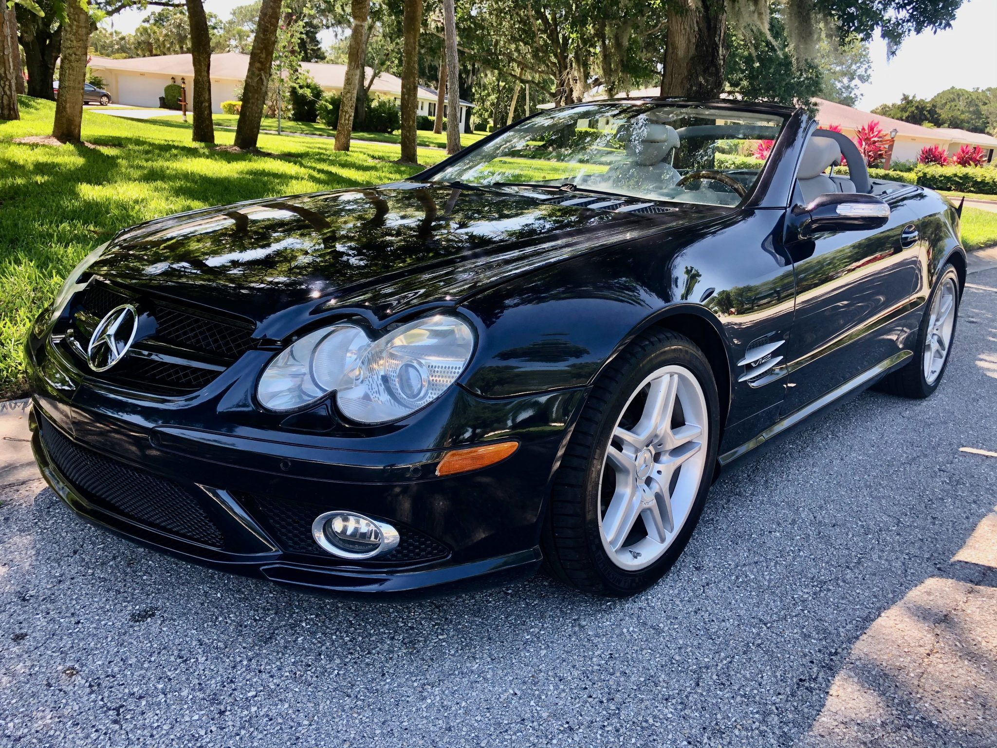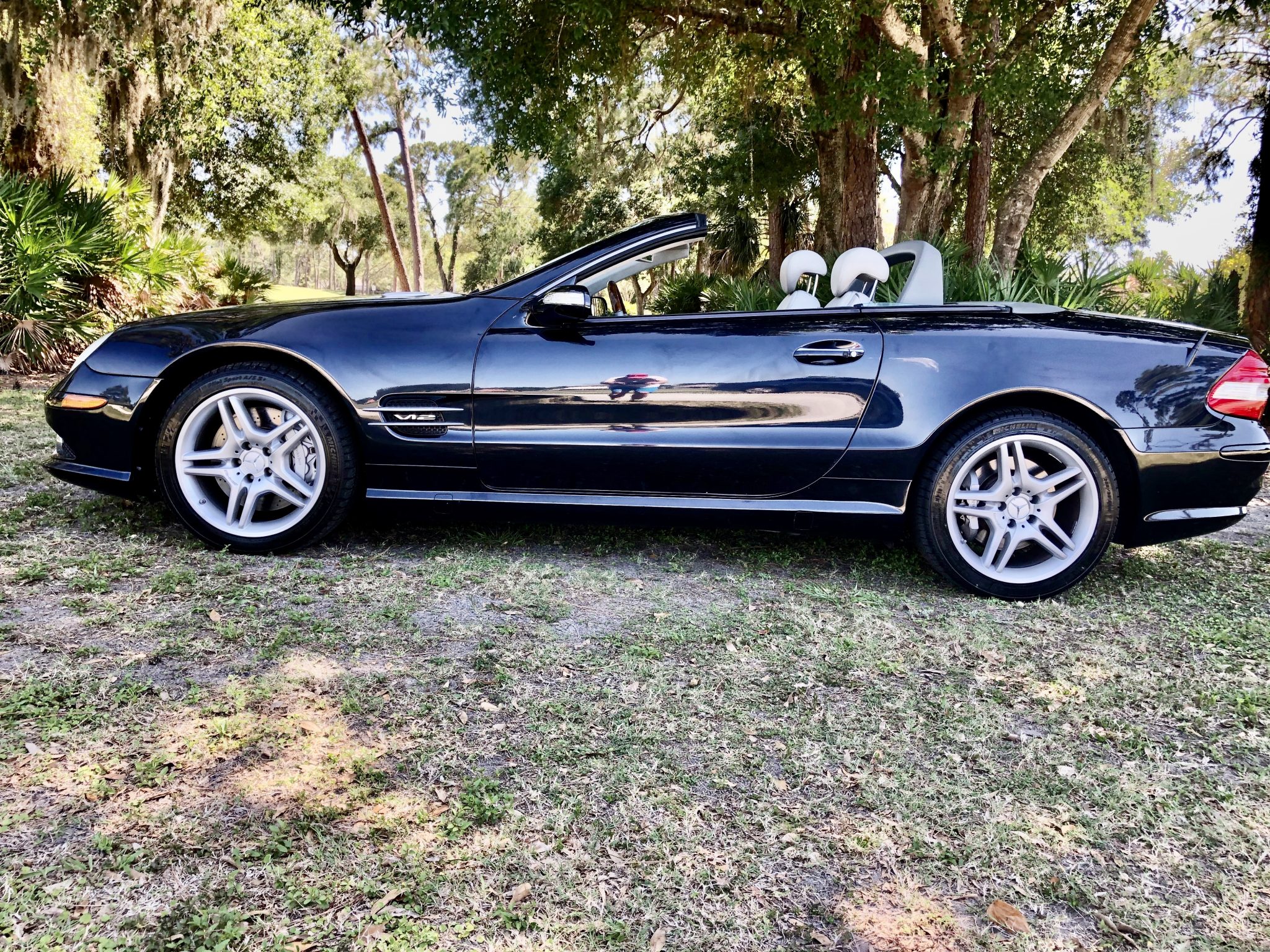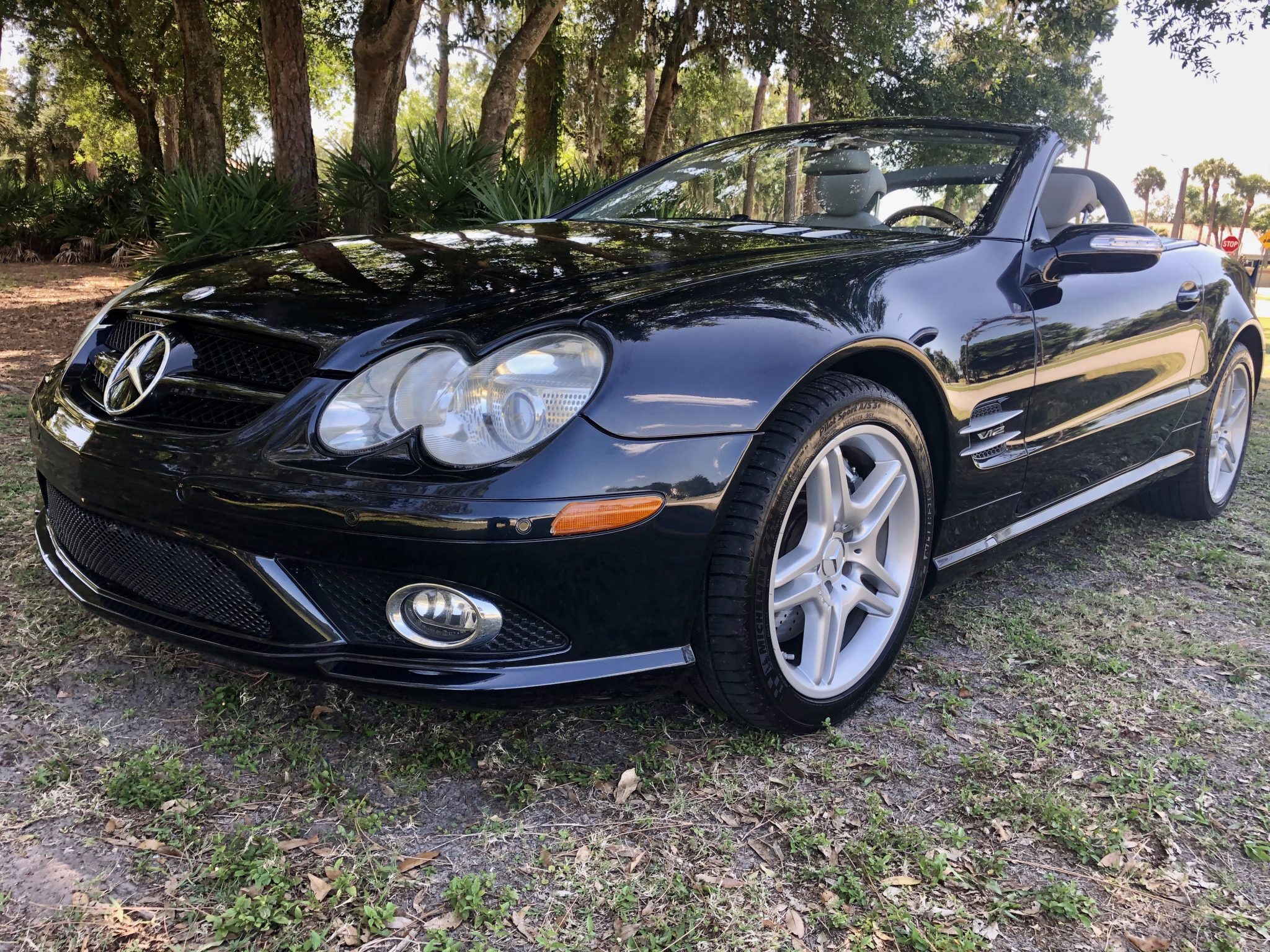 Factory 18″ AMG double-spoke alloy wheels were reportedly refinished in May 2020 and are wrapped in Michelin Pilot Sport A/S 3+ tires measuring 255/40 up front and 285/35 out back that show 2016 date codes. Equipment includes Active Body Control suspension, semi-active roll stabilization, and Sensotronic Brake Control (SBC). The SBC module was rebuilt in May 2020, and additional service during current ownership included replacement of the front and rear brake pads.