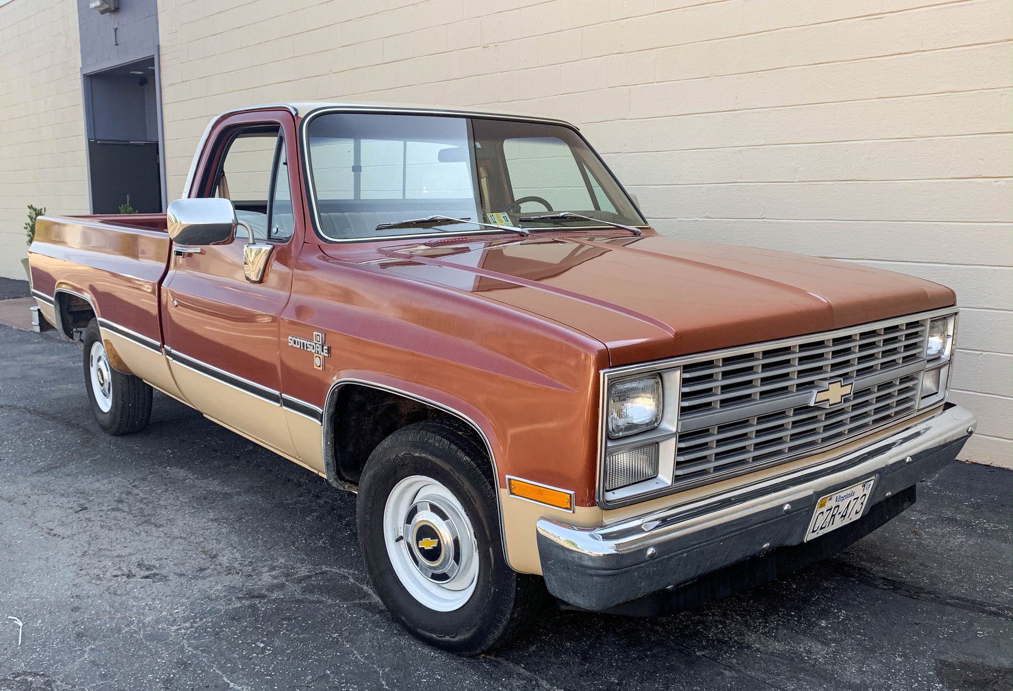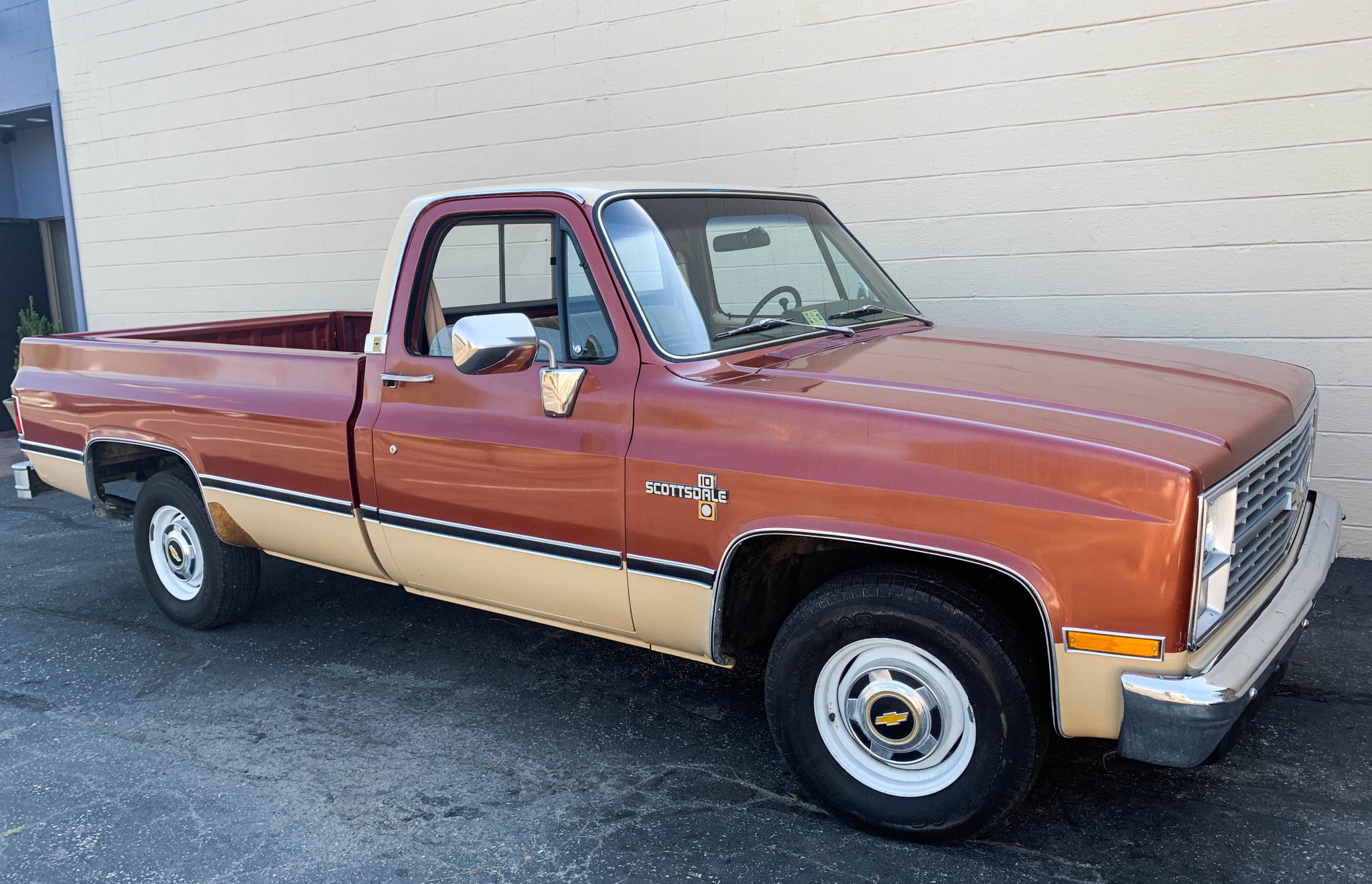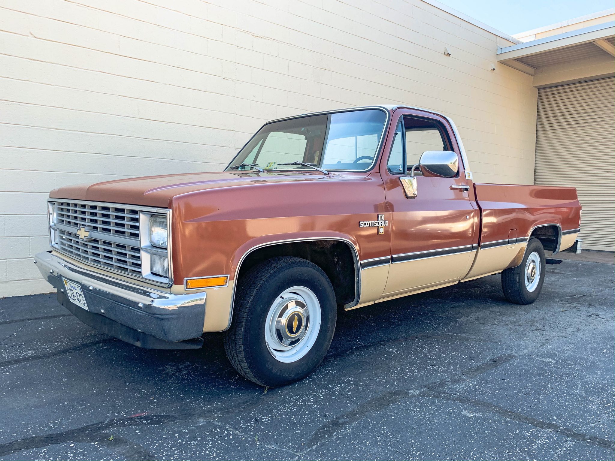 Painted 15″ steel wheels wear bowtie hubcaps and 225/75 Goodyear Invicta GS tires showing three-digit date codes. A spare is mounted underneath on a glide-out carrier. The truck is equipped with power steering and power brakes.