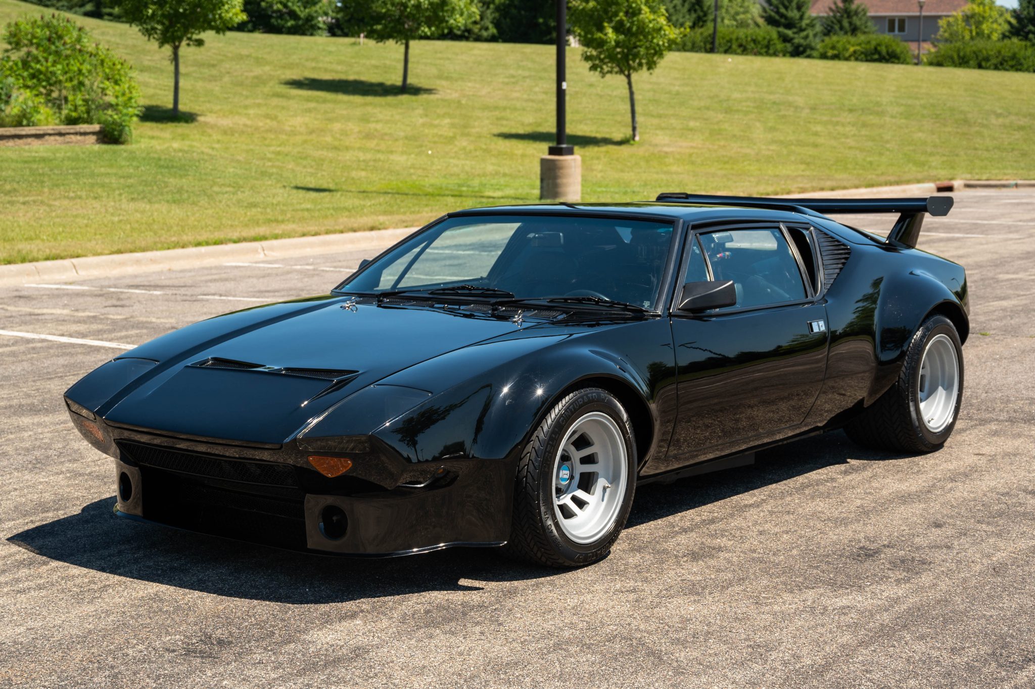 Staggered-width 15″ Campagnolo GT5-style wheels feature a silver finish and are fitted with Pirelli Cinturato tires measuring 285/40 at the front and 345/35 at the rear. Wilwood Superlite disc brakes have been installed at all four wheels, and suspension updates by the seller are said to include Koni shocks and springs, polyurethane suspension bushings, and a CV joint kit.