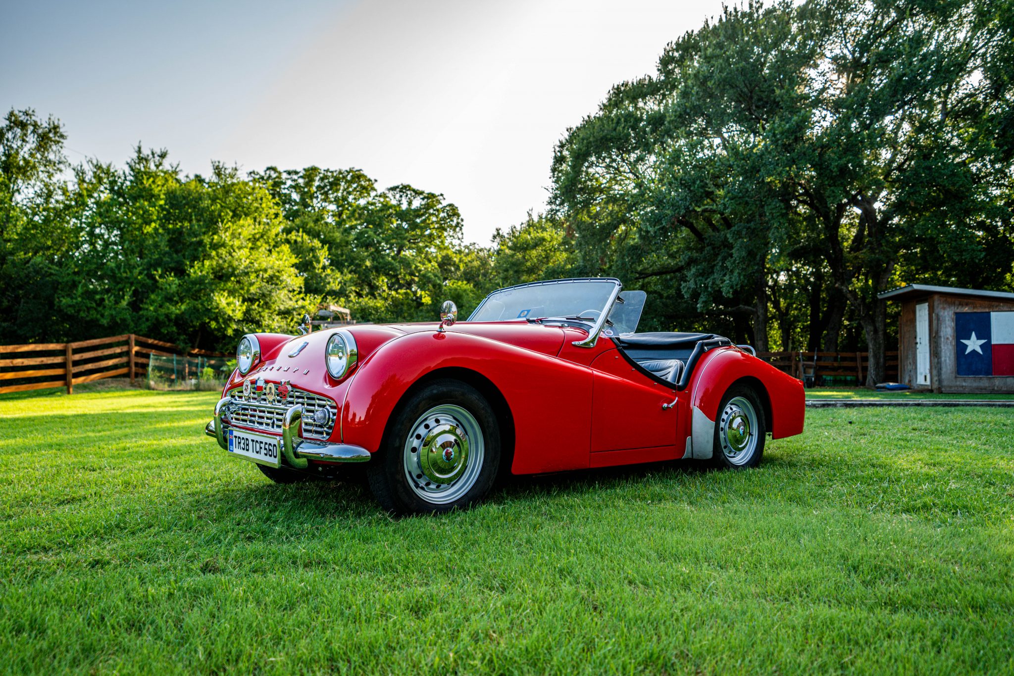 Powdercoated 15″ steel wheels with chrome hubcaps and trim rings are wrapped in 165-series radial tires. The suspension has been modified with rebuilt rear shocks, rack-and-pinion steering sourced from a Triumph Spitfire, and an added anti-sway bar. Front brake calipers have been replaced, and braided steel brake lines have been installed by the seller.
