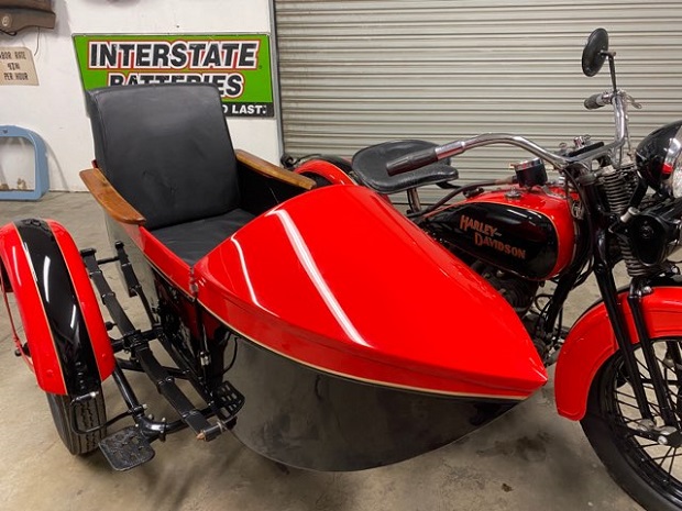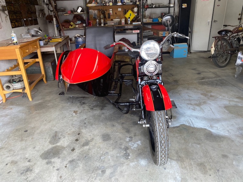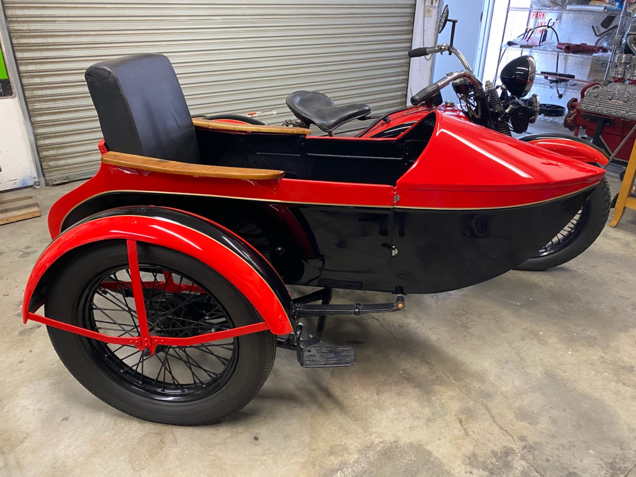 Black wire-spoke wheels are fitted to both the motorcycle and sidecar. A springer front end and a solo seat with an internal spring comprise the only suspension on the motorcycle, which is also equipped with drum brakes front and rear.