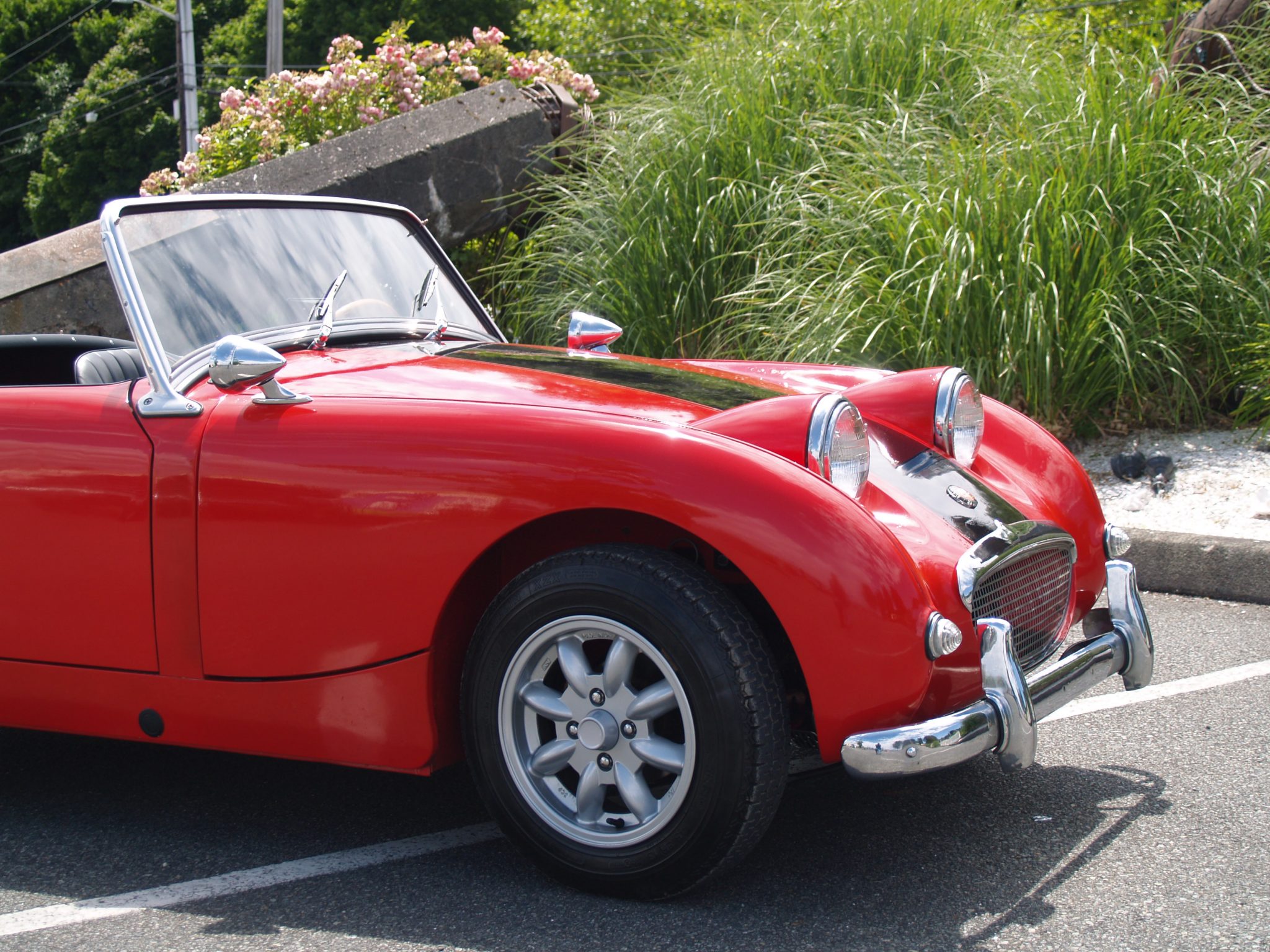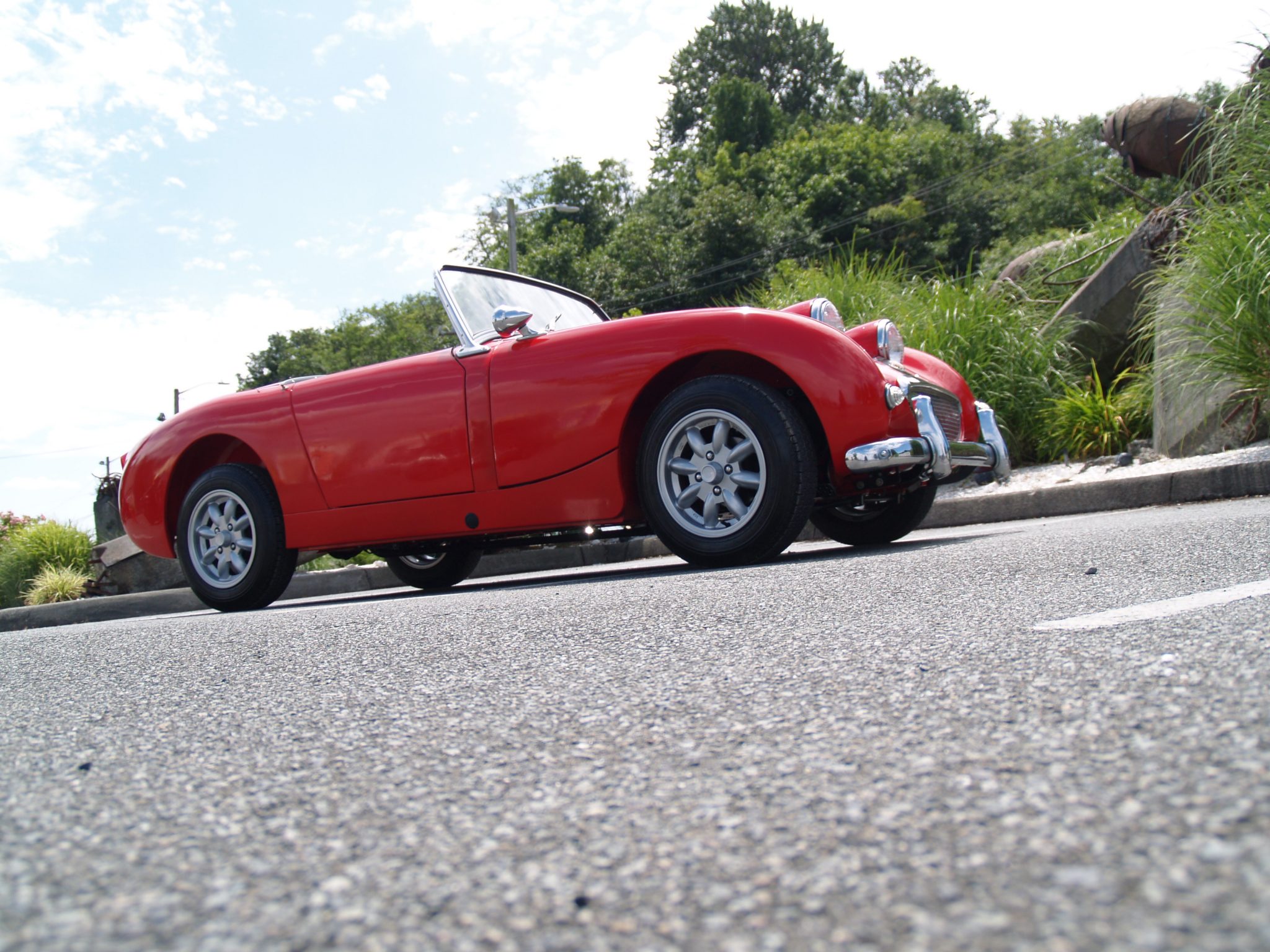 Minilite 13″ alloy wheels wear Michelin XZX tires. Disc brakes and an anti-roll bar have been fitted up front, and recent maintenance is said to have included replacement of the rear wheel bearings and brake cylinders. A soft top and detachable side curtains accompany the car.