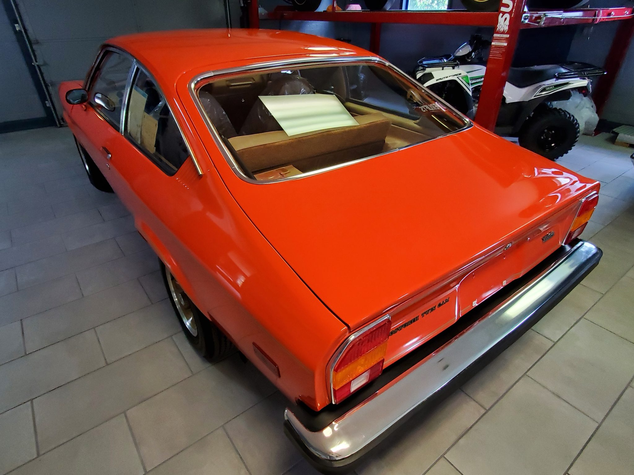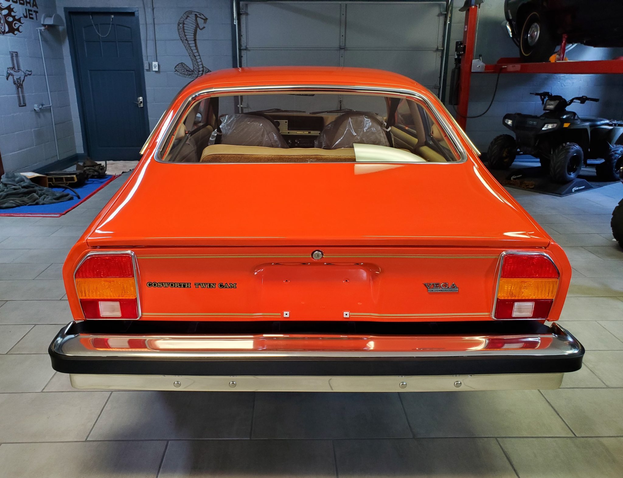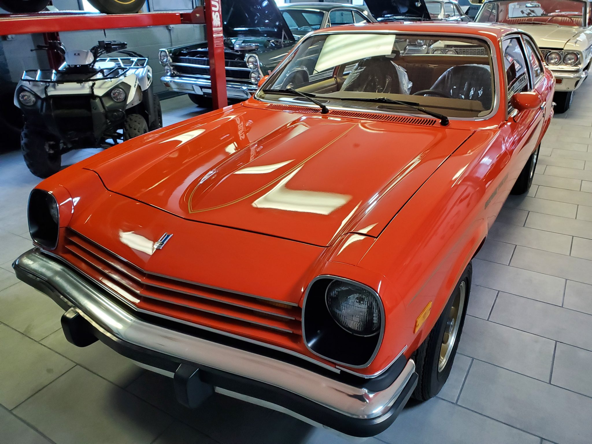 Gold factory 13″ cast aluminum wheels retain period Goodyear BR70-13 tires, and a matching spare is located beneath the trunk floor. Two chips are noted on the face of one of the wheels.