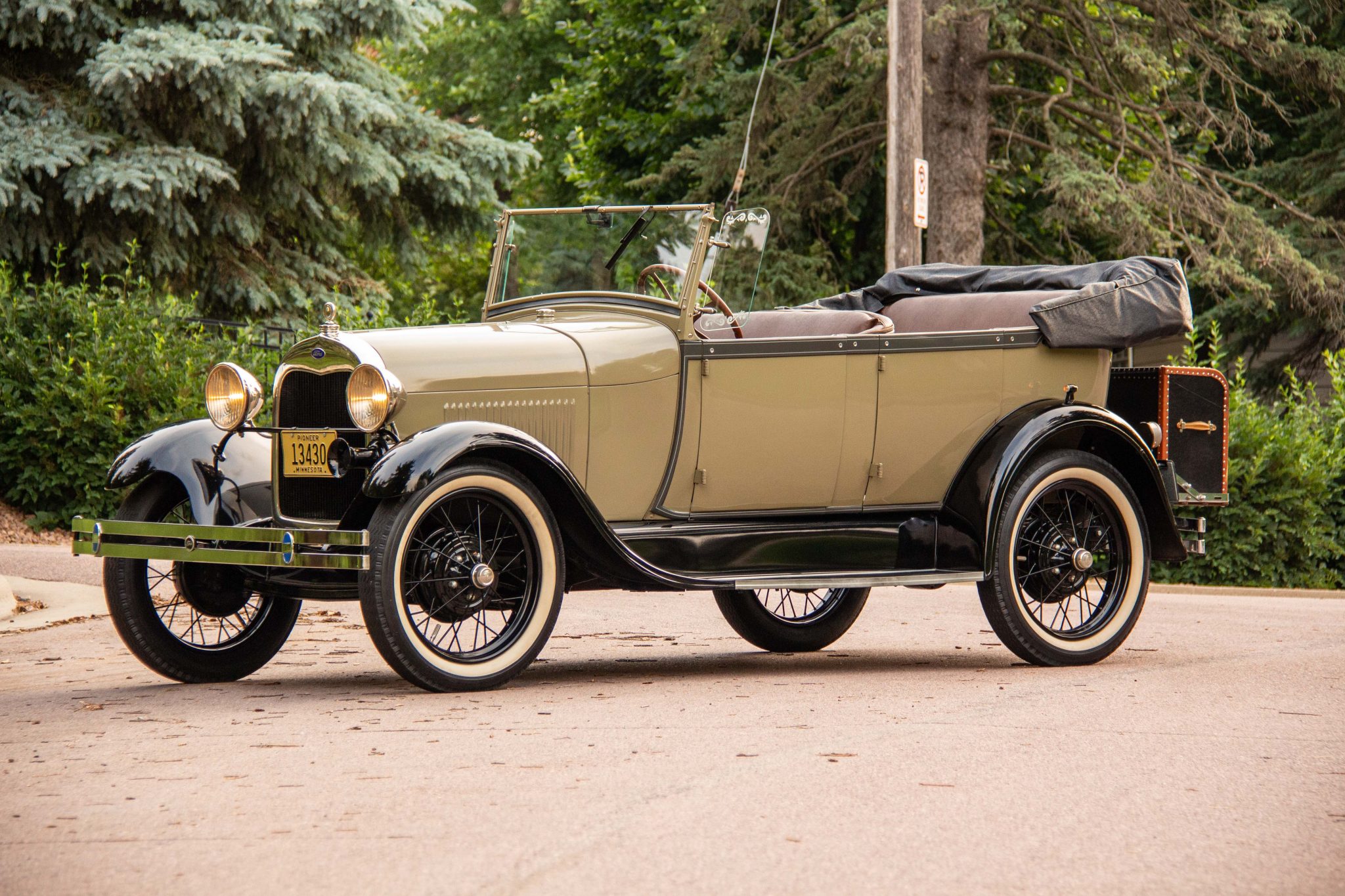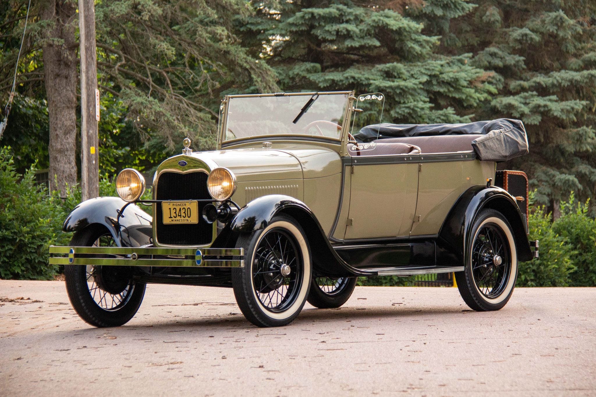 Black 21″ five-lug wire wheels wear Ford center caps and whitewall tires. Each corner is equipped with drum brakes.