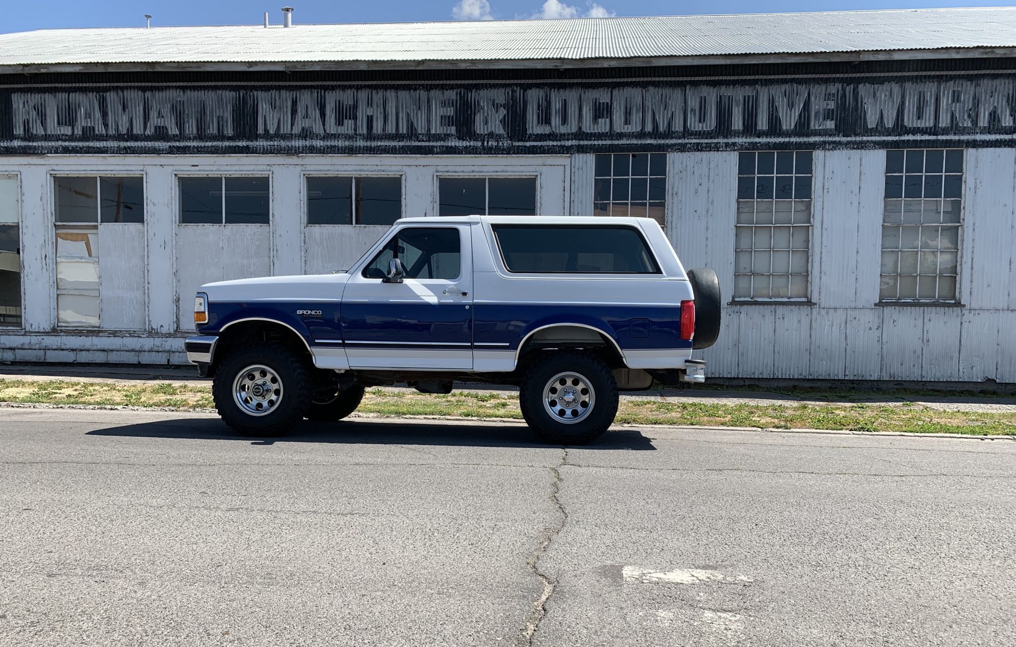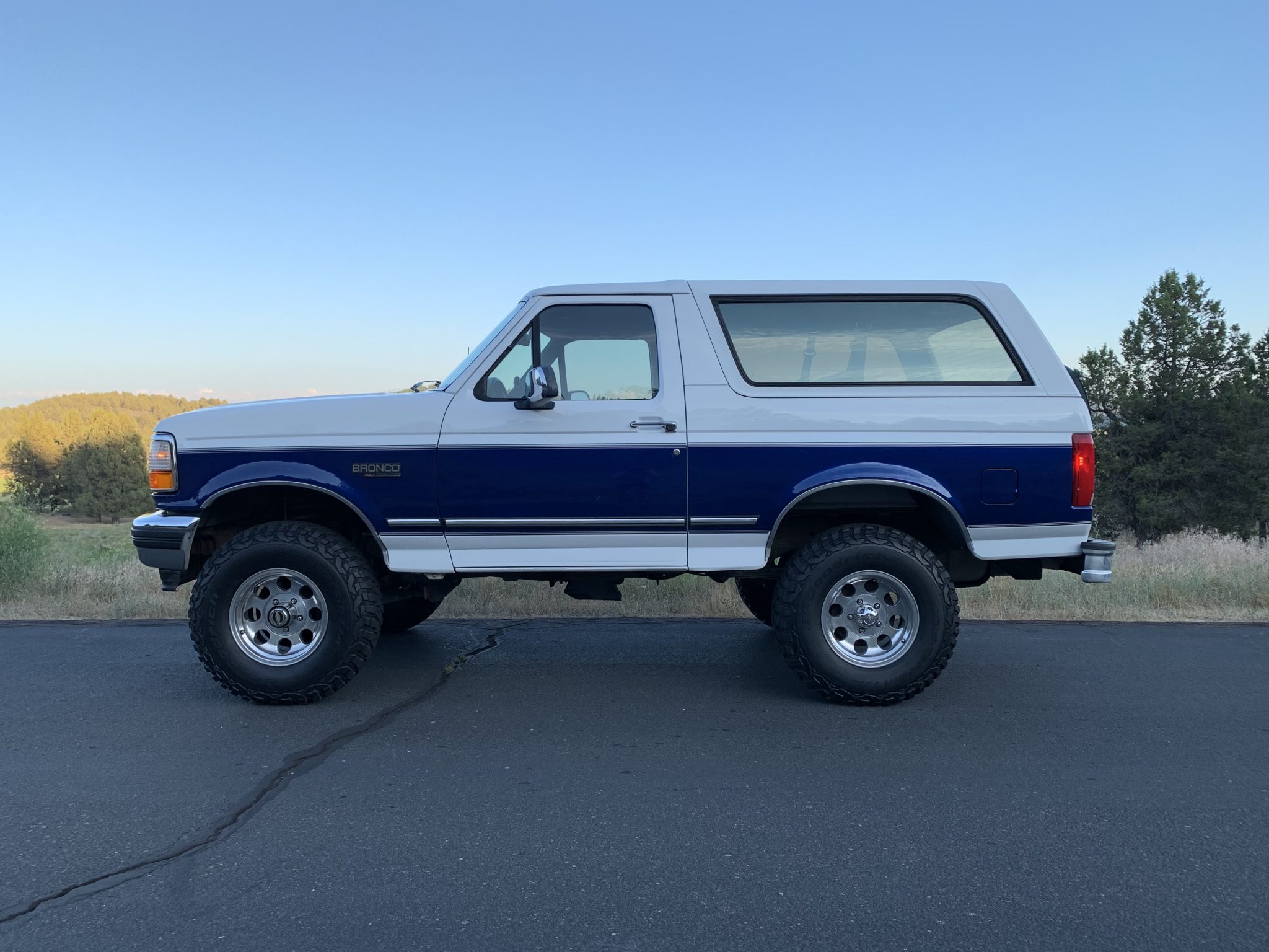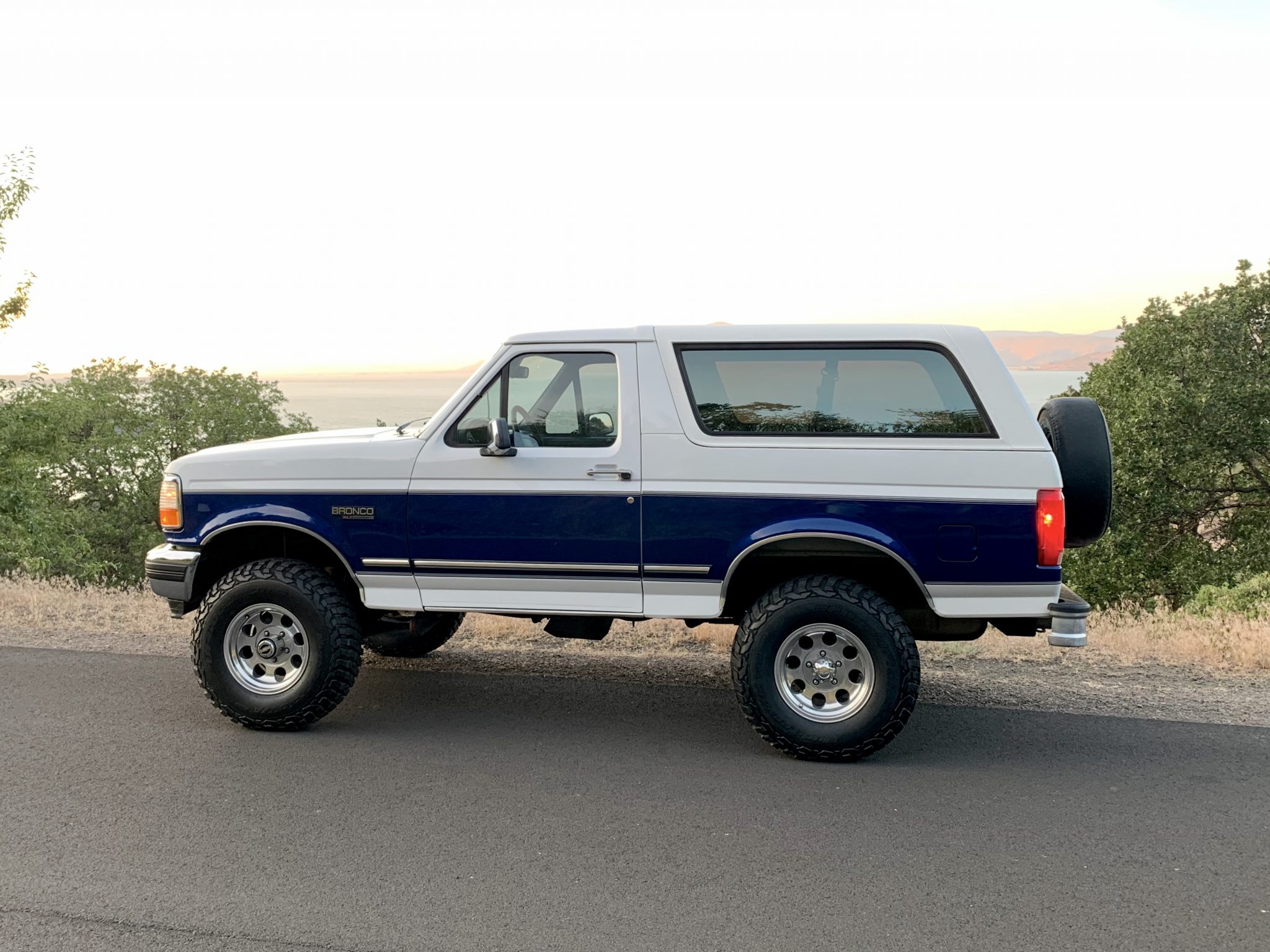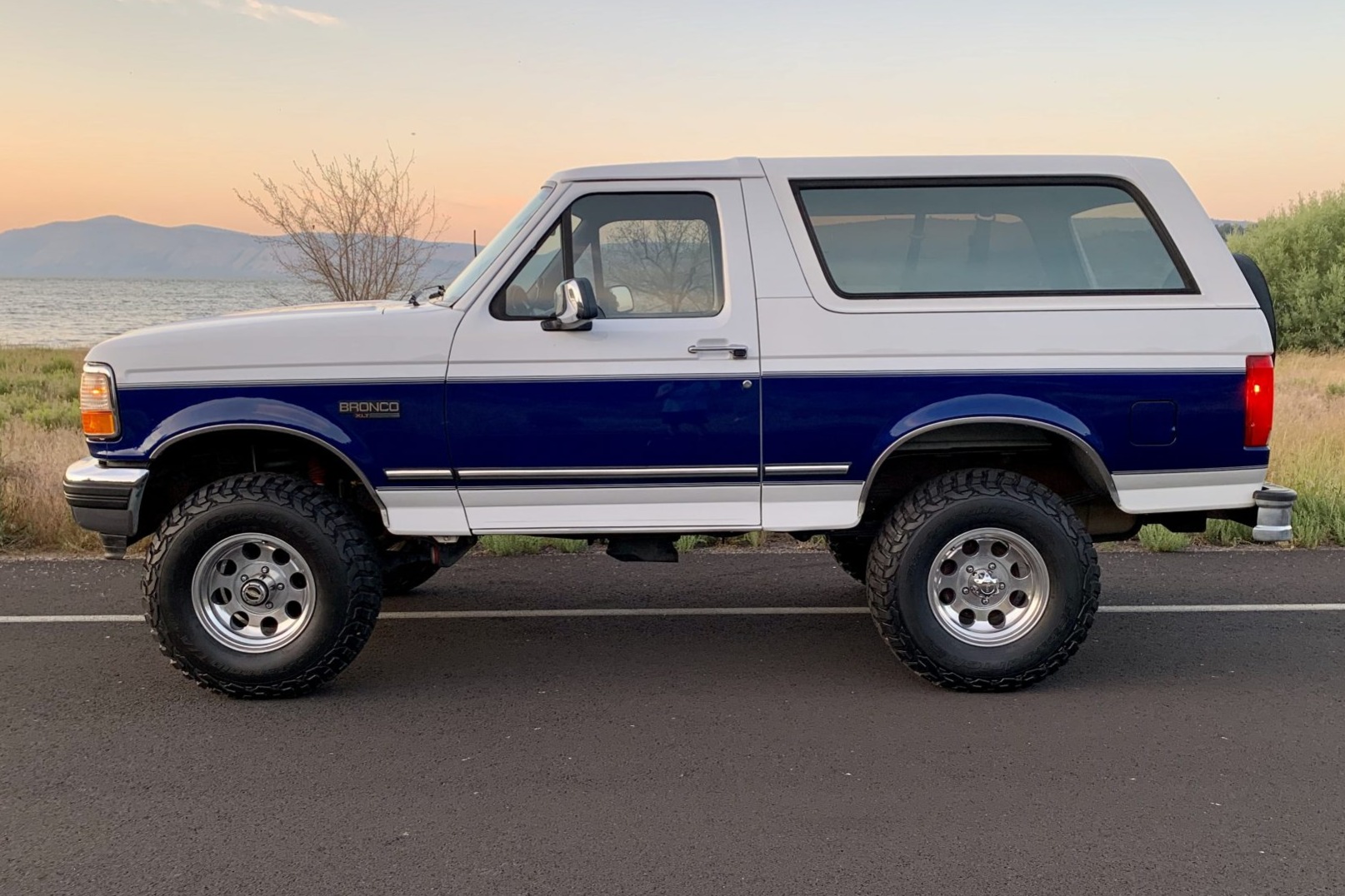 Aftermarket 16″ aluminum wheels are mounted over manually locking Warn front hubs and wear 255/85 BFGoodrich Mud-Terrain KM3 tires that were installed in June 2020. The suspension has been raised approximately four inches and features Rancho shock absorbers. A spare wheel and tire is fitted with a Bronco-branded cover and mounted to a swing-out carrier at the rear.