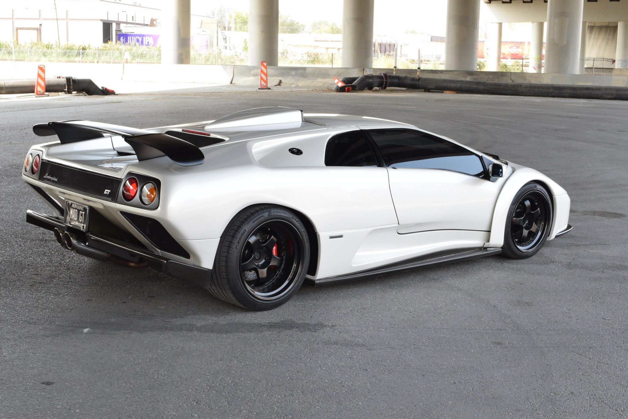 The fuel cap was moved to the top of the passenger quarter panel and a Tubi center-exit muffler fitted. Black staggered-width 18″ Work Meister S1 wheels wear Pirelli P Zero tires sized 245/35 up front and 335/30 out back. Red Lamborghini-branded brake calipers are mounted up front, while a Brembo rear big brake kit was installed under the seller’s ownership. Cross-drilled rotors are featured all around.